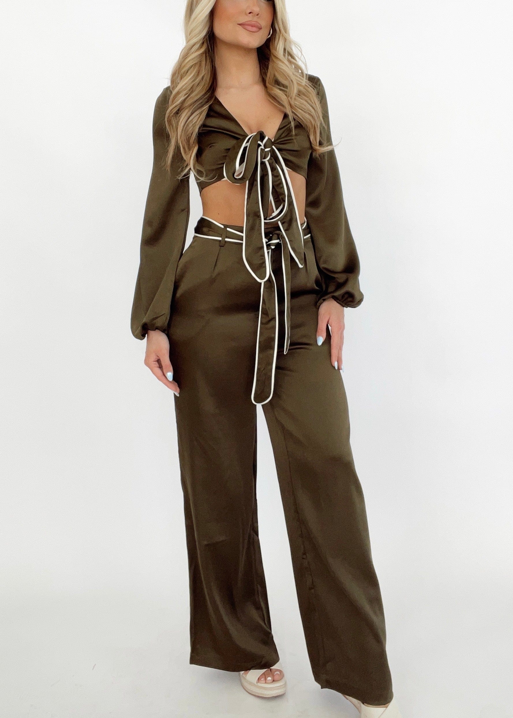 Elevate your style with our Saint Lucia Satin Pants. These sleek, high-waisted pants feature a belted waist, white trim detailing, and a flattering front tie. The pleated satin fabric adds an elegant touch, while the straight leg and back zipper closure ensure a comfortable fit. Perfect for dinner, drinks, or a chic vacation look. Soft and luxurious, these pants are a must-have for spring and summer.