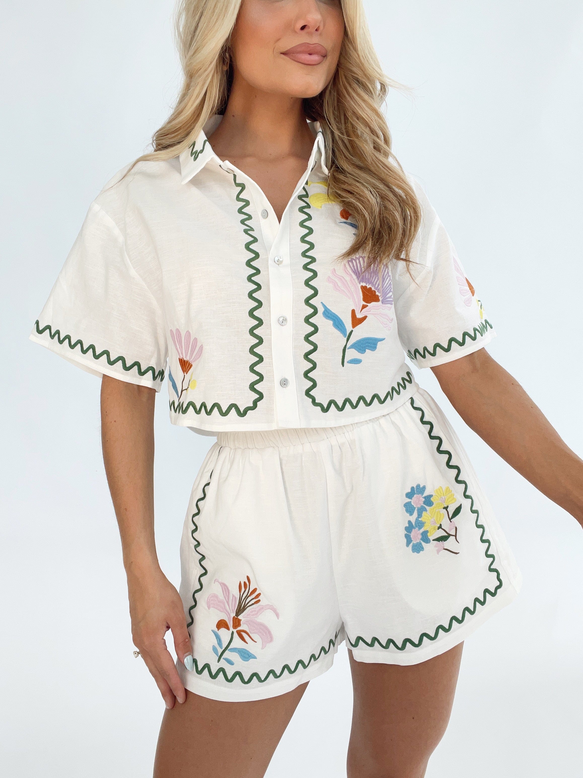 Introducing our Santorini Sunshine Shorts, perfect for adding a pop of color to your spring and summer wardrobe. With a high-waisted, linen design and stretchy elastic waistband, these shorts are both comfortable and stylish. The embroidered coastal-inspired pattern and soft inner lining make them the perfect statement piece for any vacation, resort, dinner, or drinks outing. Elevate your look with these trendy and fun shorts.