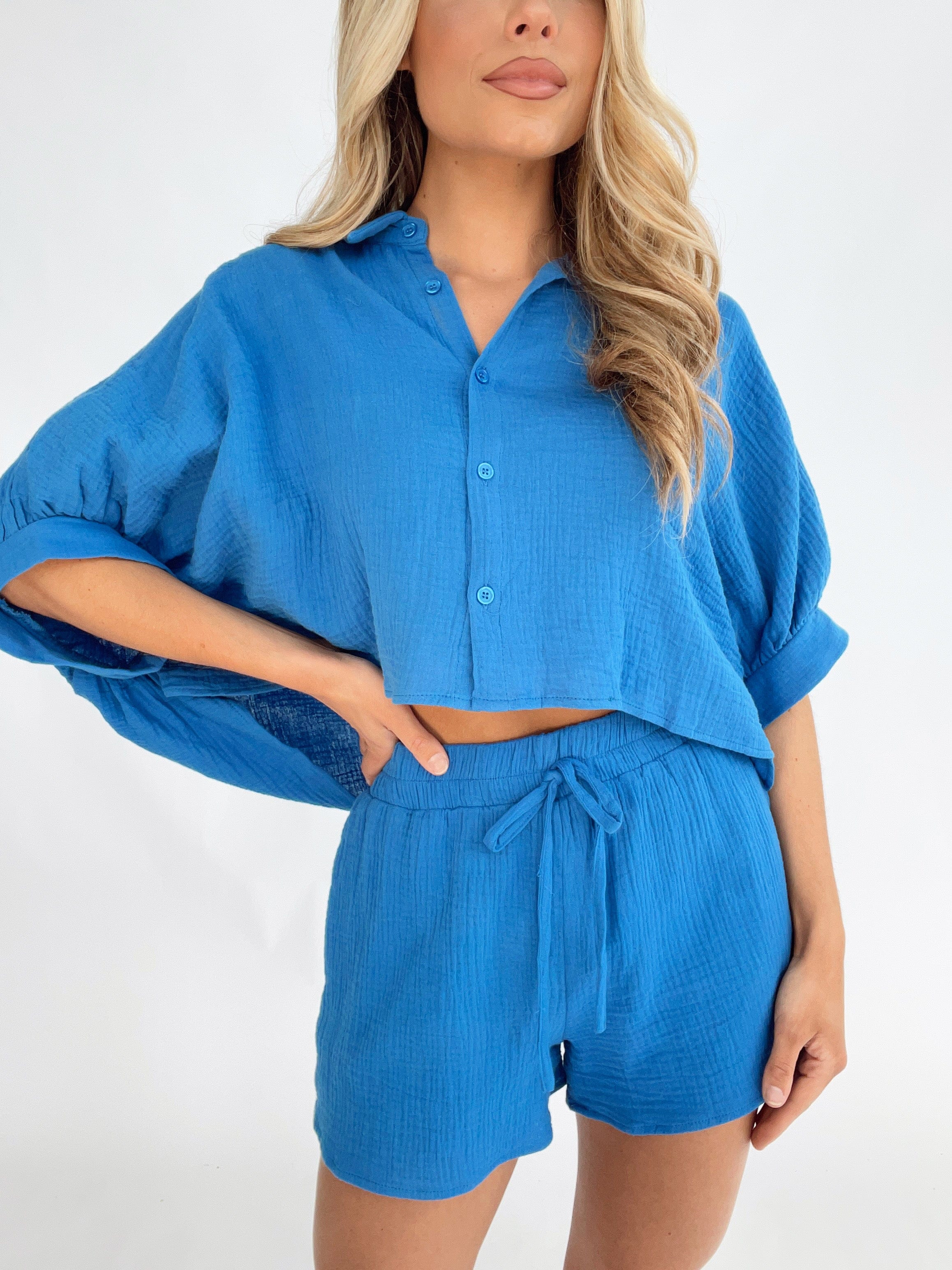 Indulge in luxury with our Sapphire Sands Shorts. These high-waisted shorts feature a stretchy elastic waistband for a comfortable fit, front tie detail for a chic accent, and pocket details for convenience. The textured fabric adds a touch of sophistication, while the soft inner lining ensures ultimate comfort. Perfect for a beach walk or a summer vacation, these shorts add a pop of color with a bright and bold design. Elevate your summer style with these must-have shorts, perfect for any occasion.