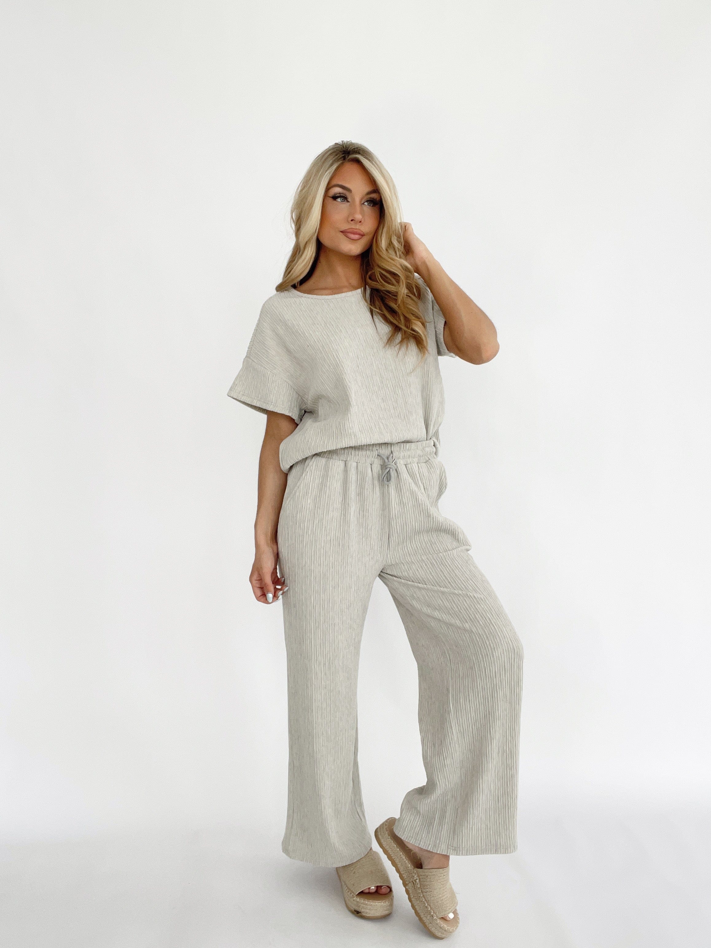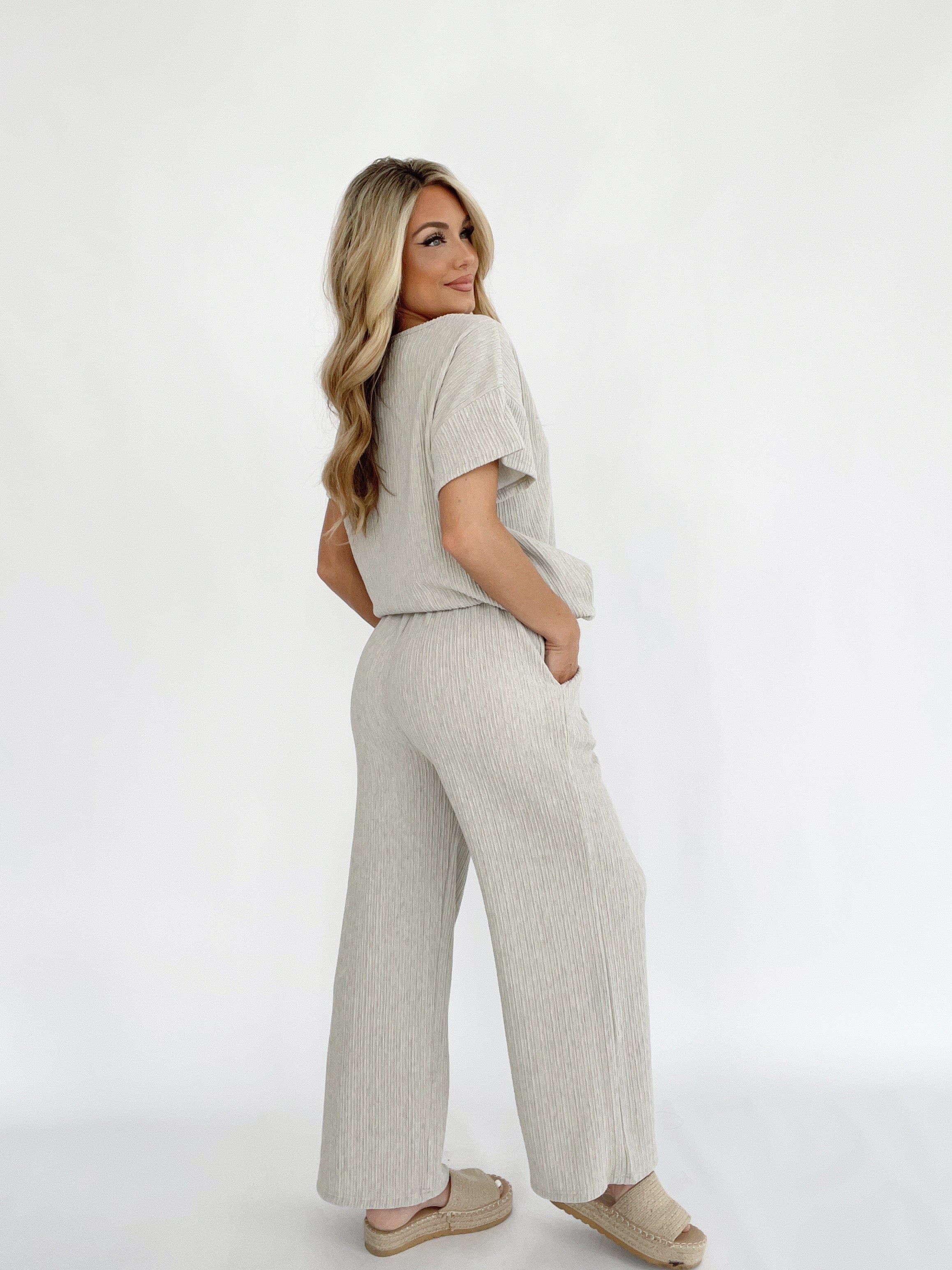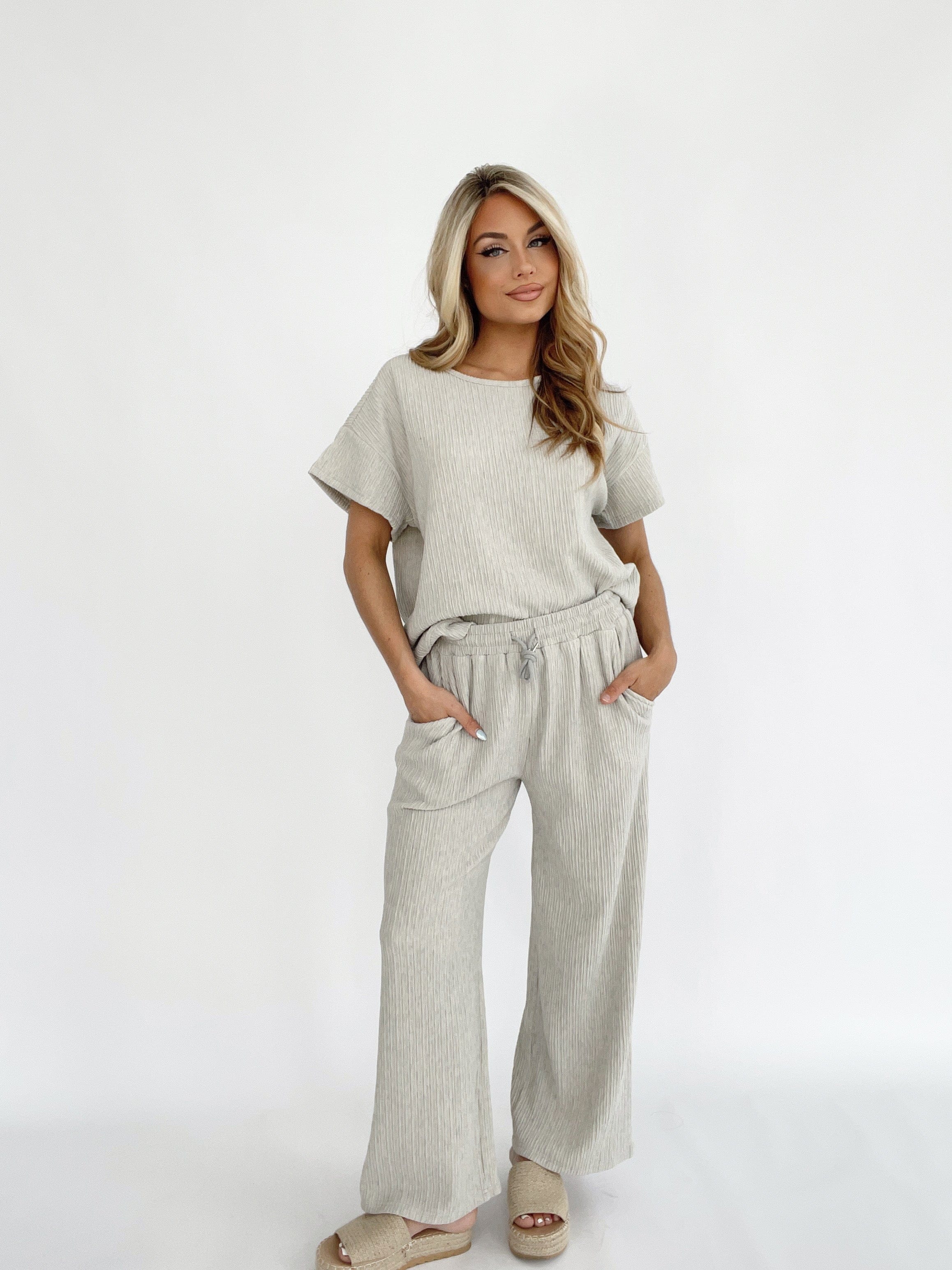 The Seashore Stroll Pants offer ribbed texture, a high waist, and wide leg design for a versatile and stylish look. With pocket details and an adjustable drawstring, these pants offer comfort and convenience for casual lounging or running errands. Perfect for a beach walk or a spring/summer day, these pants are soft, stretchy, and pastel-colored for an elegant touch.