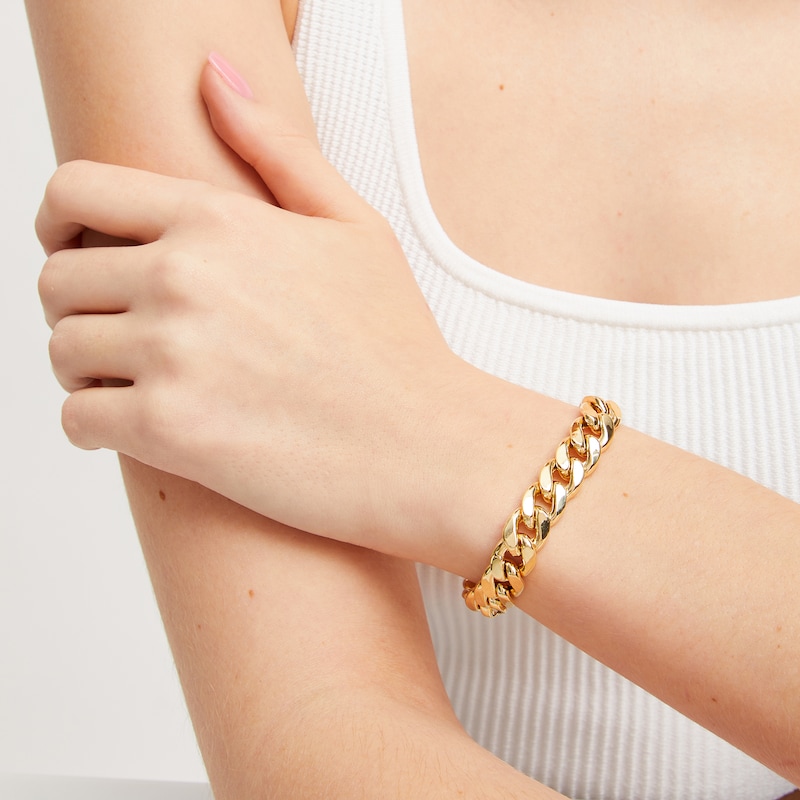 This stylish Italian-made semi-solid Cuban chain bracelet is crafted in timeless 10K yellow gold and measures 8.5 inches. The chain size is 11mm and the gauge size is 300.