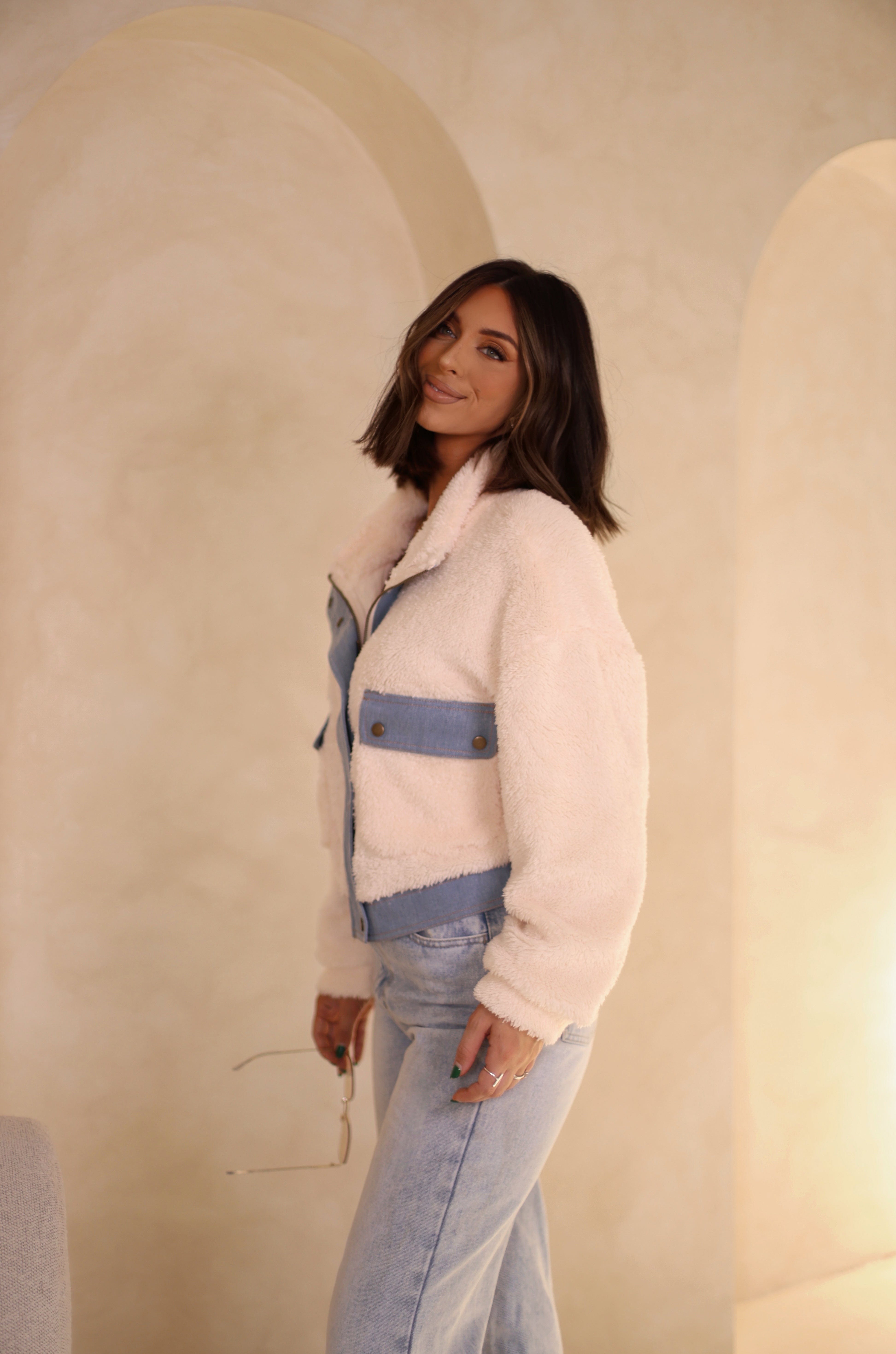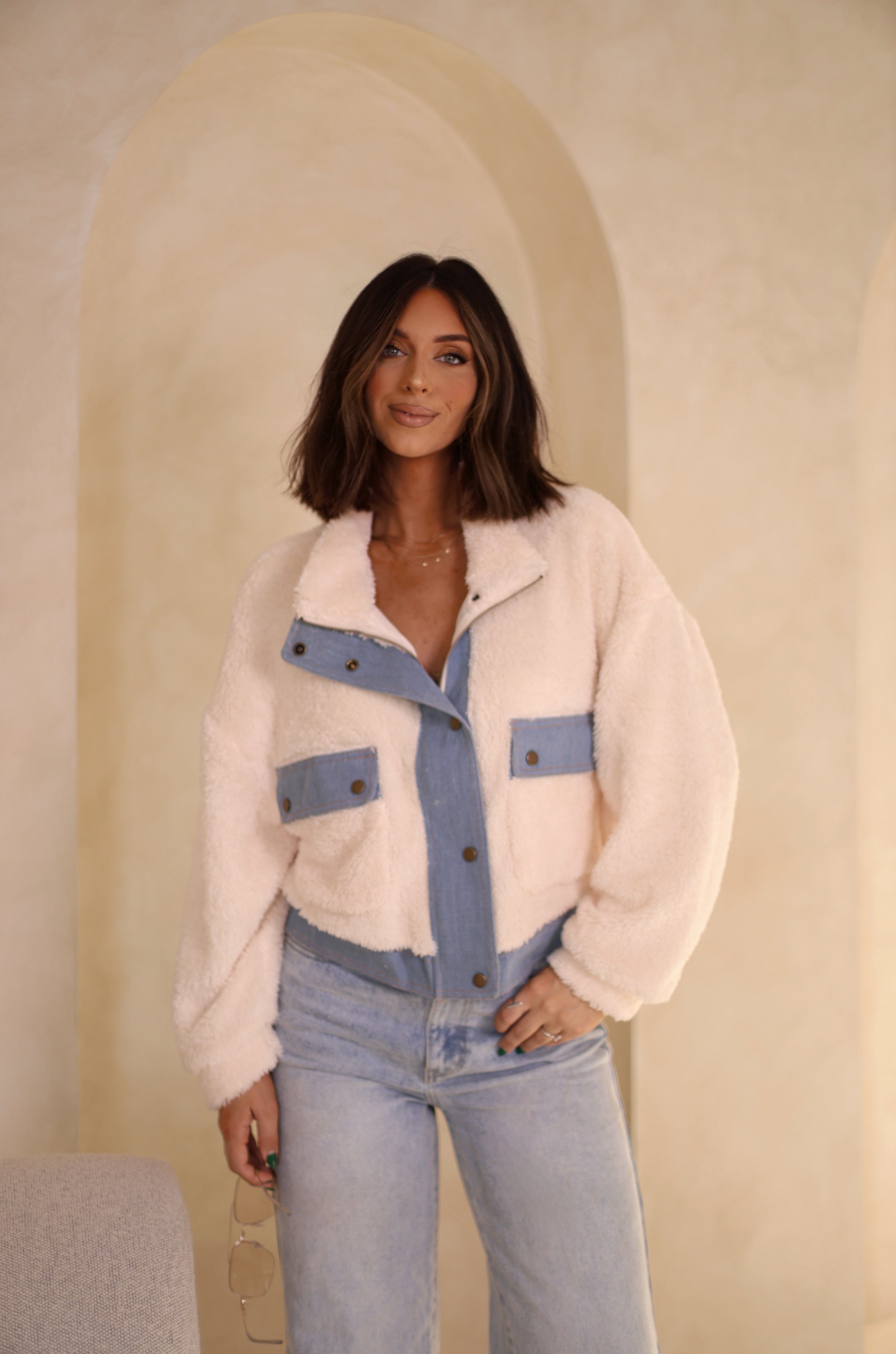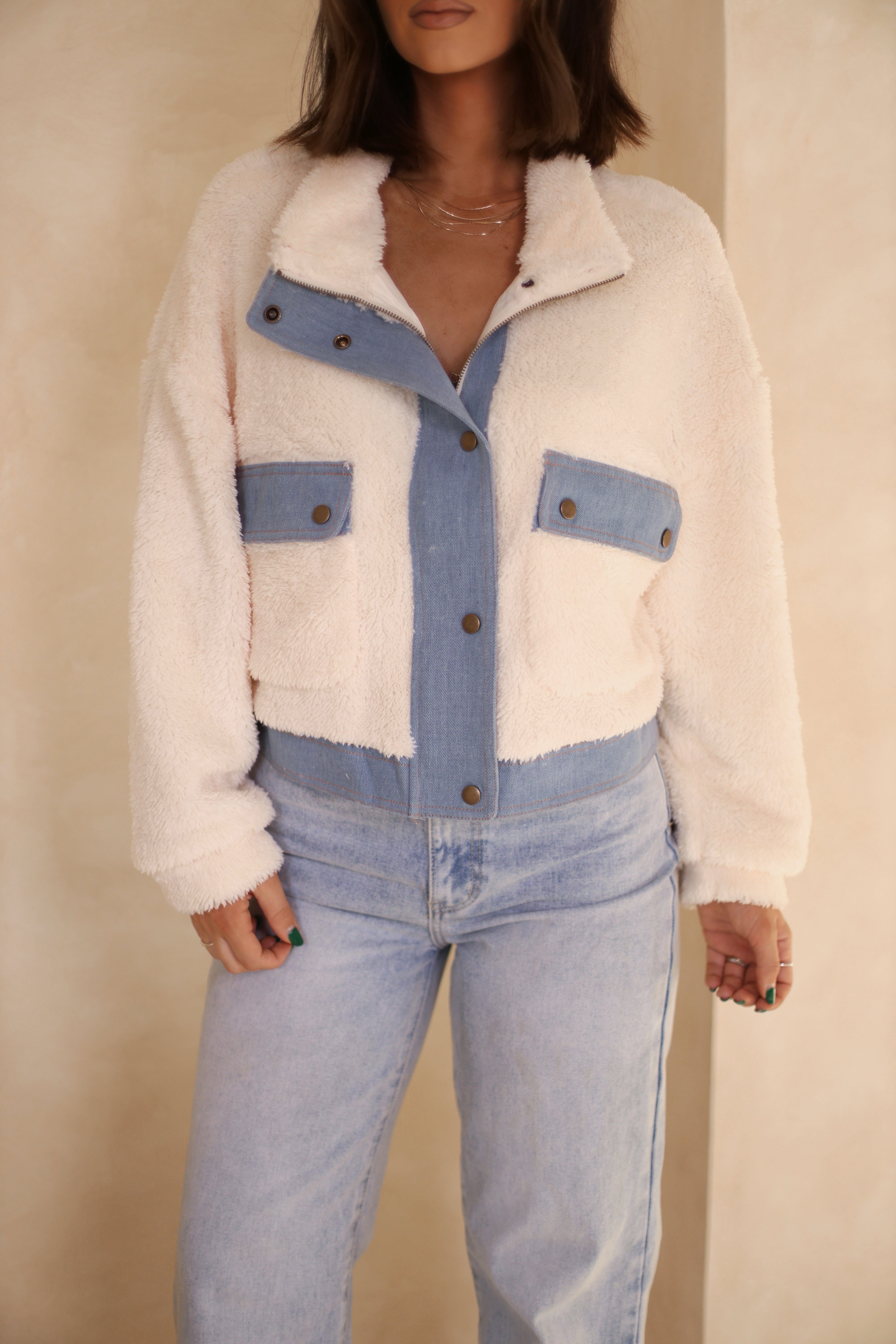 The Shearling Chic Denim Jacket features a convenient zipper and snap closure, as well as front pockets with snaps for added security. It also includes an inner liner for added warmth and comfort. Stay stylish and protected with this durable jacket.