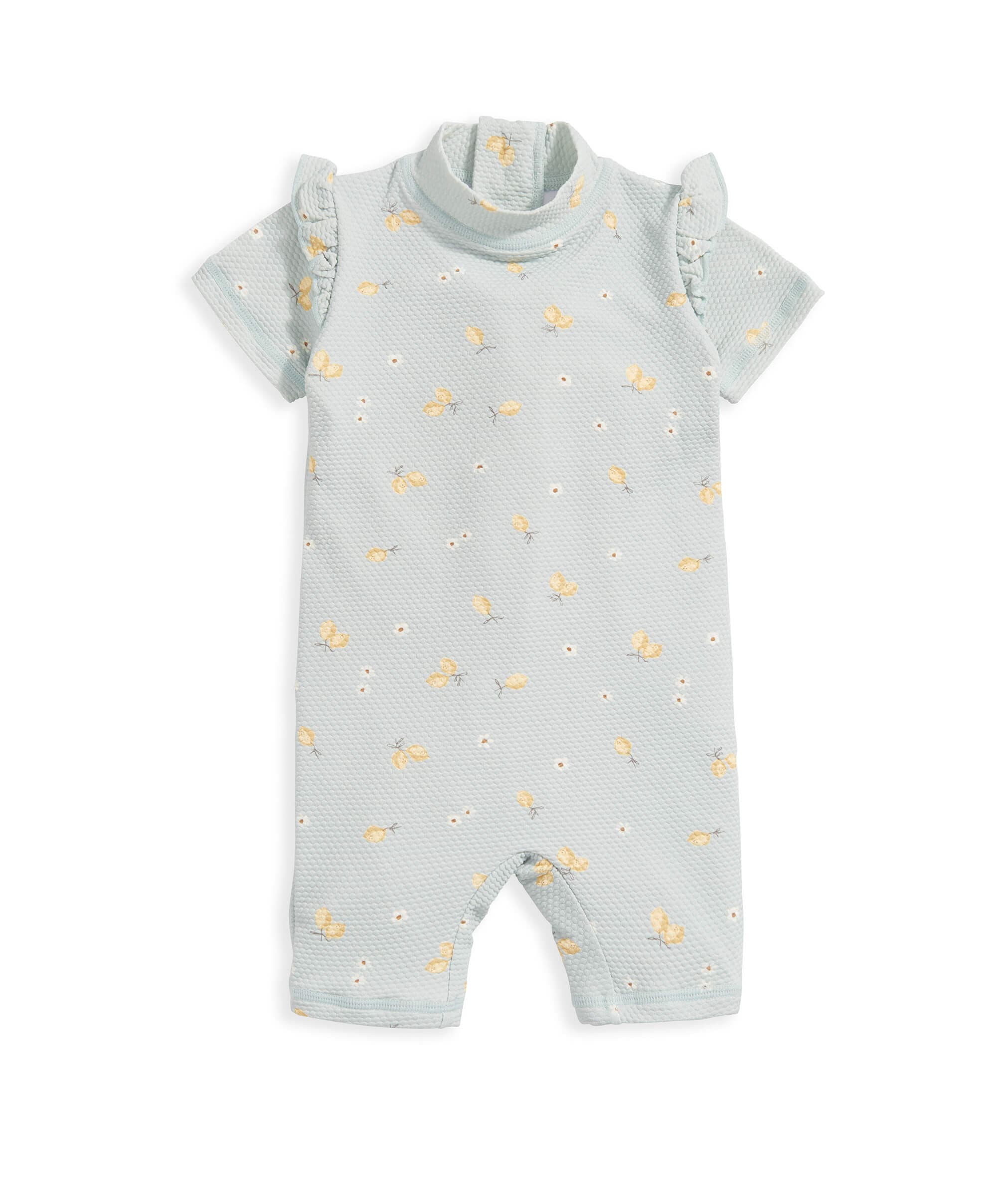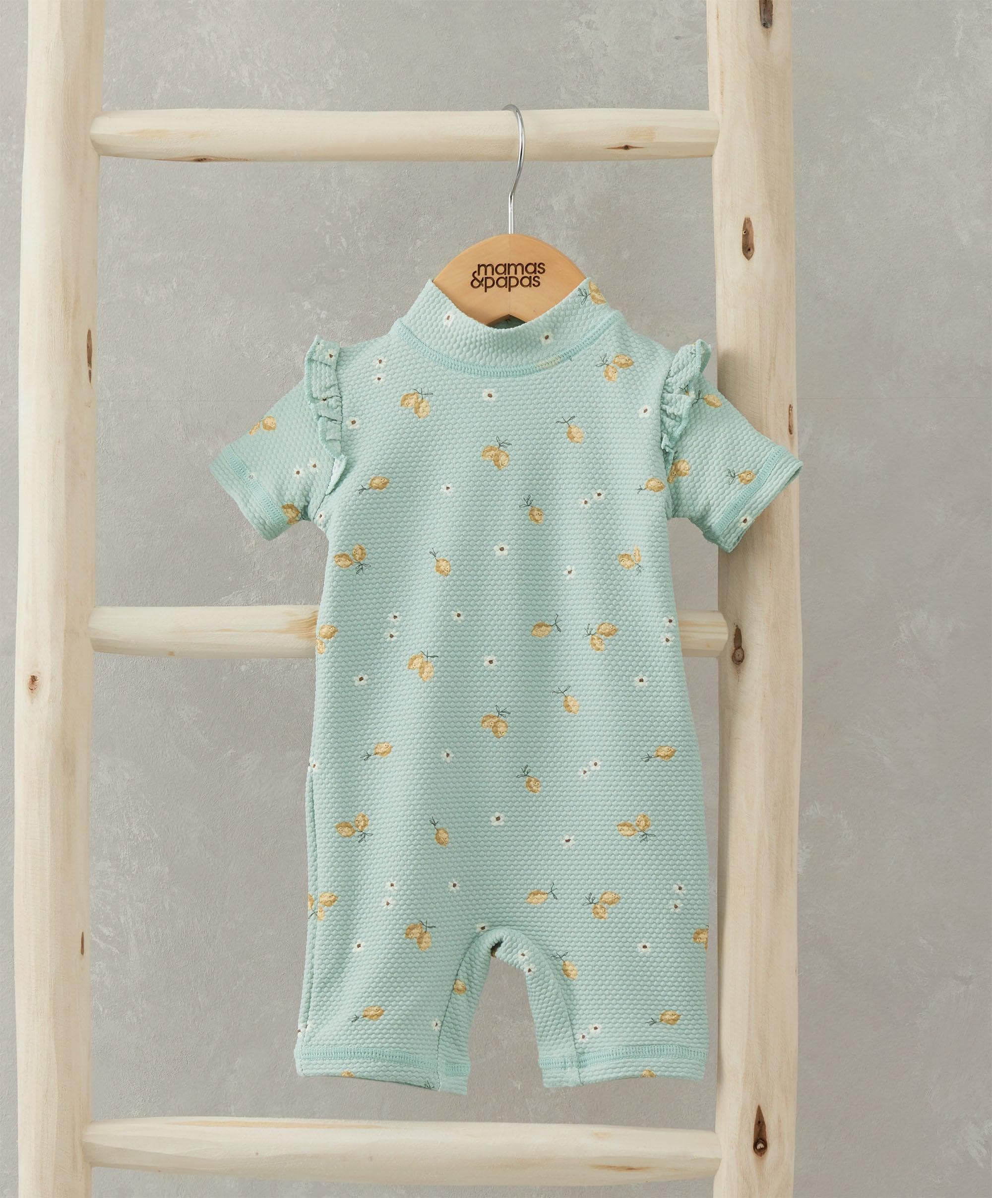 Girls' short-sleeved rashsuit in textured bobble fabric. Summery lemon all-over print. Zip opening at back for easy changing. Pair with matchign swim hat