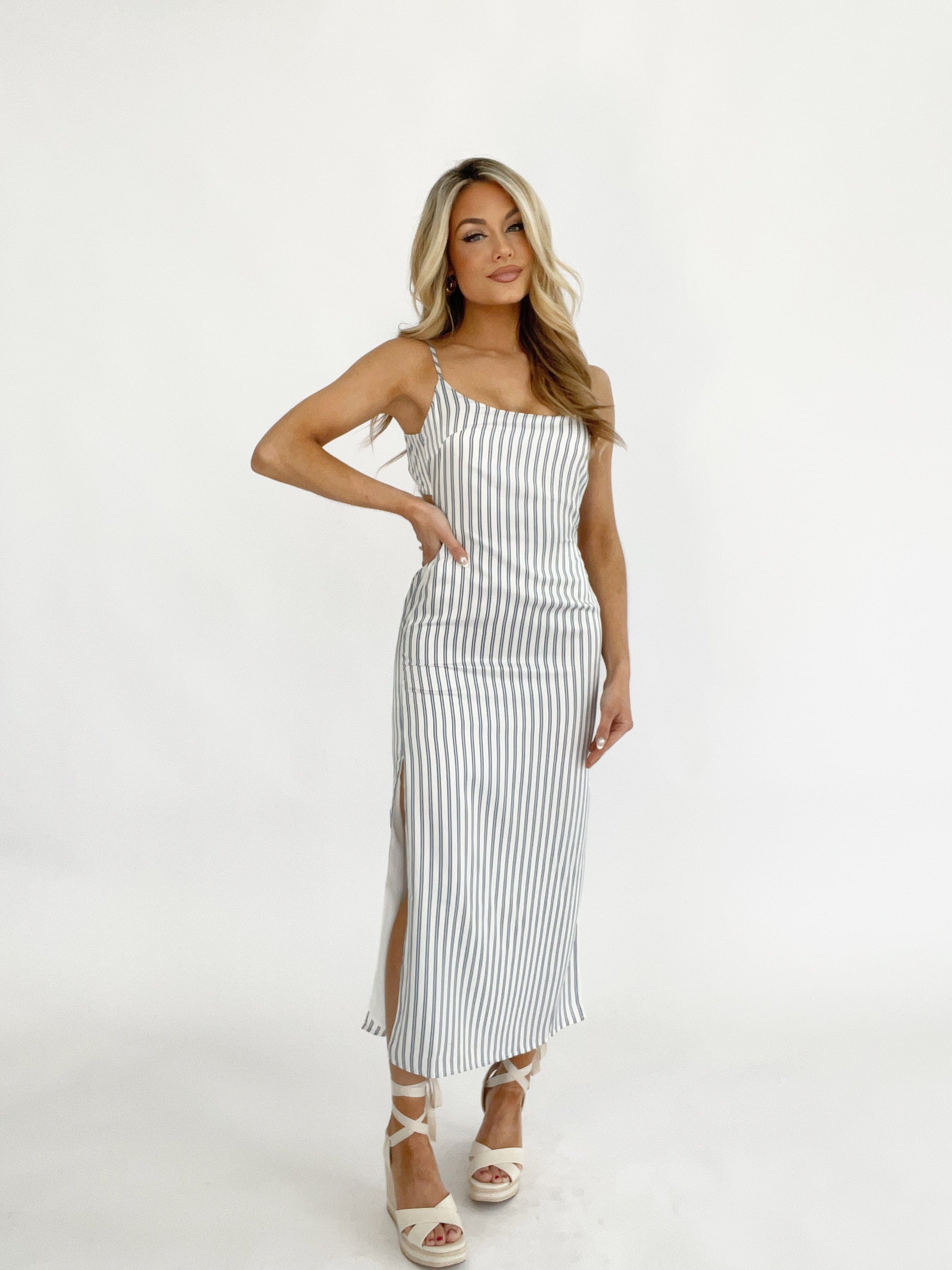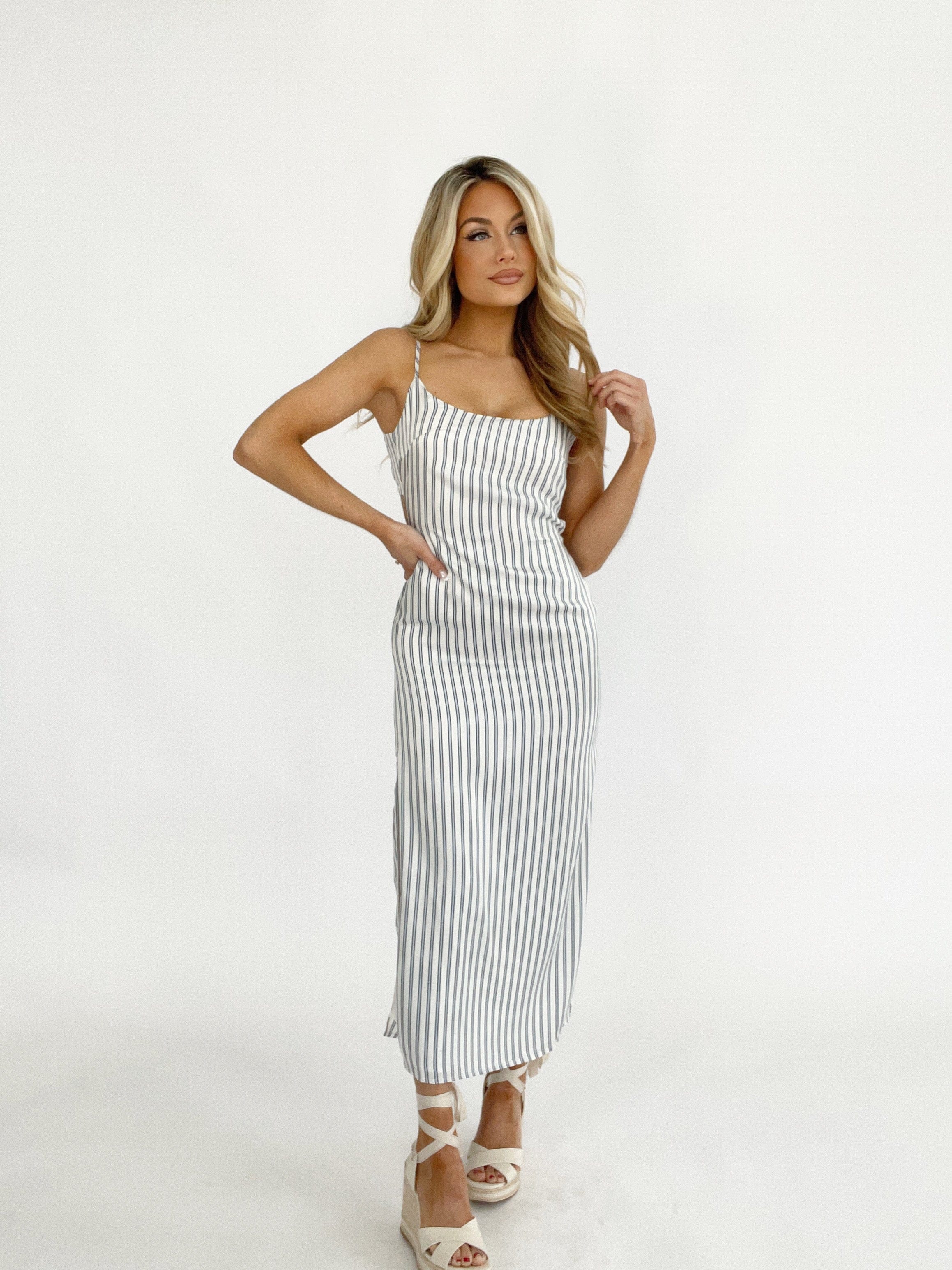 Indulge in effortless elegance with our Smooth Sailing Midi Dress. Thin adjustable straps and a rounded neckline exude sophistication, while the coastal striped design and back cutout and lace up details add a touch of allure. Perfect for brunch, dinner, or drinks, this lightweight and stretchy dress offers chic style and ultimate comfort. Spring and summer have never looked so stylish.