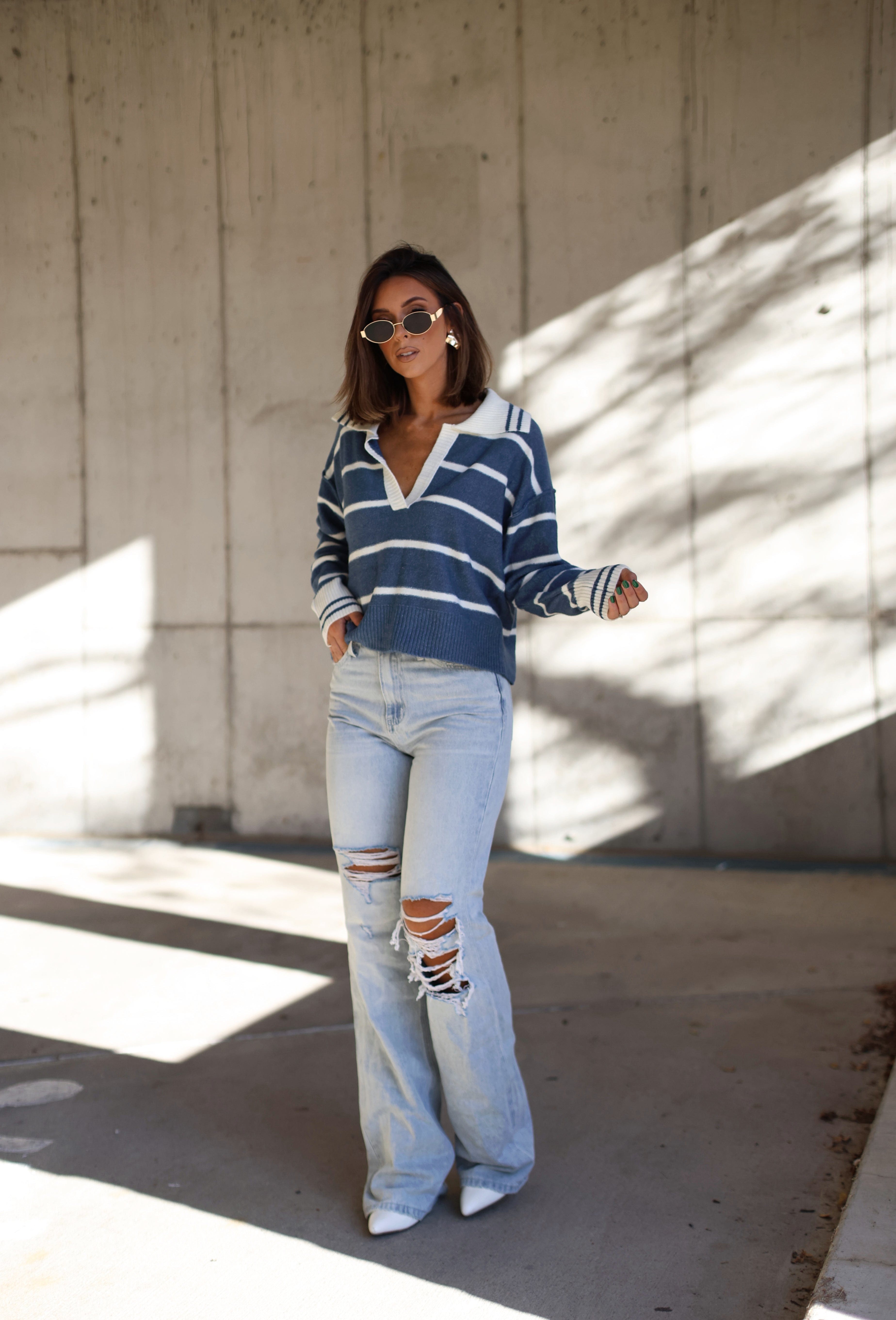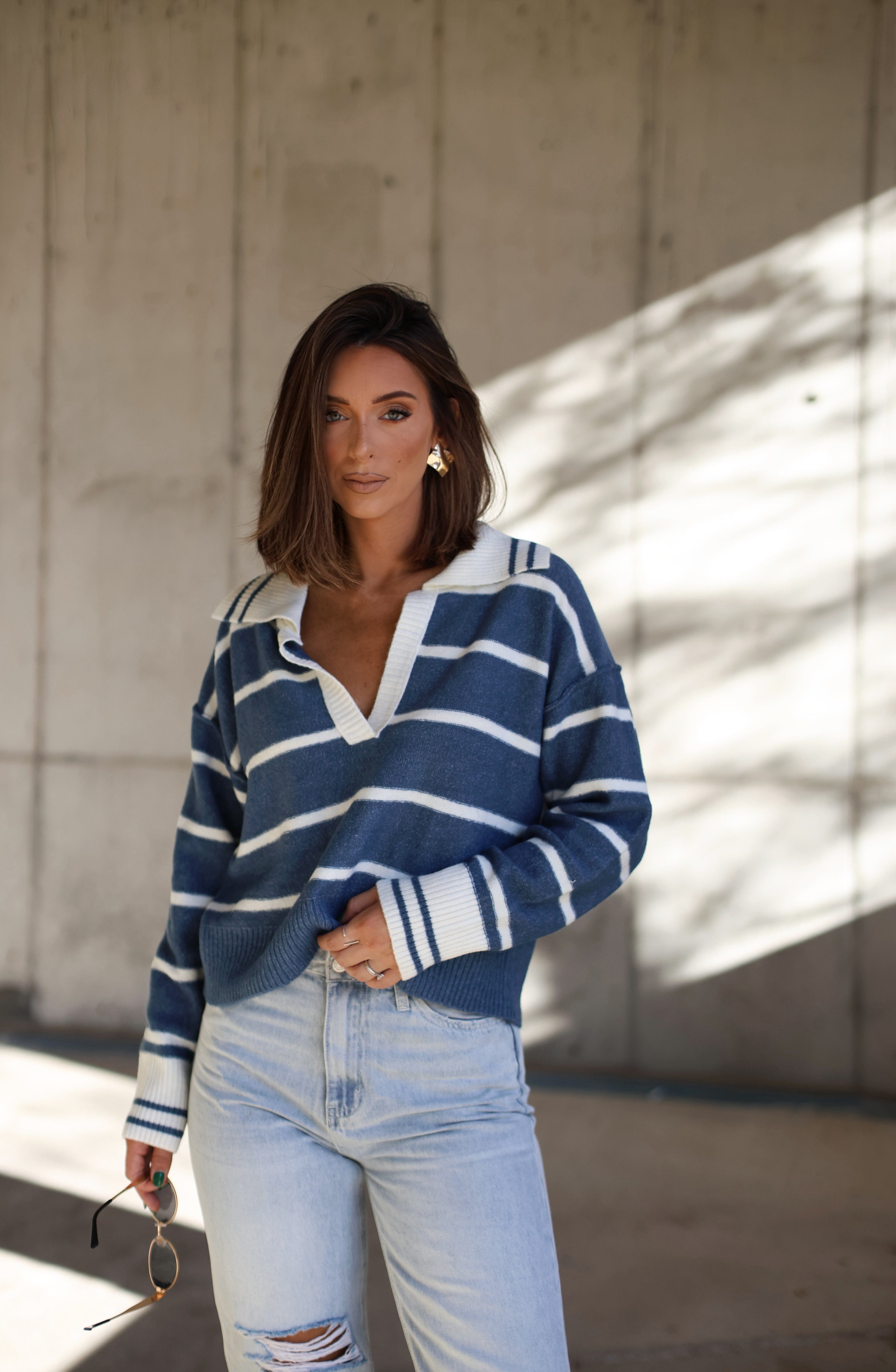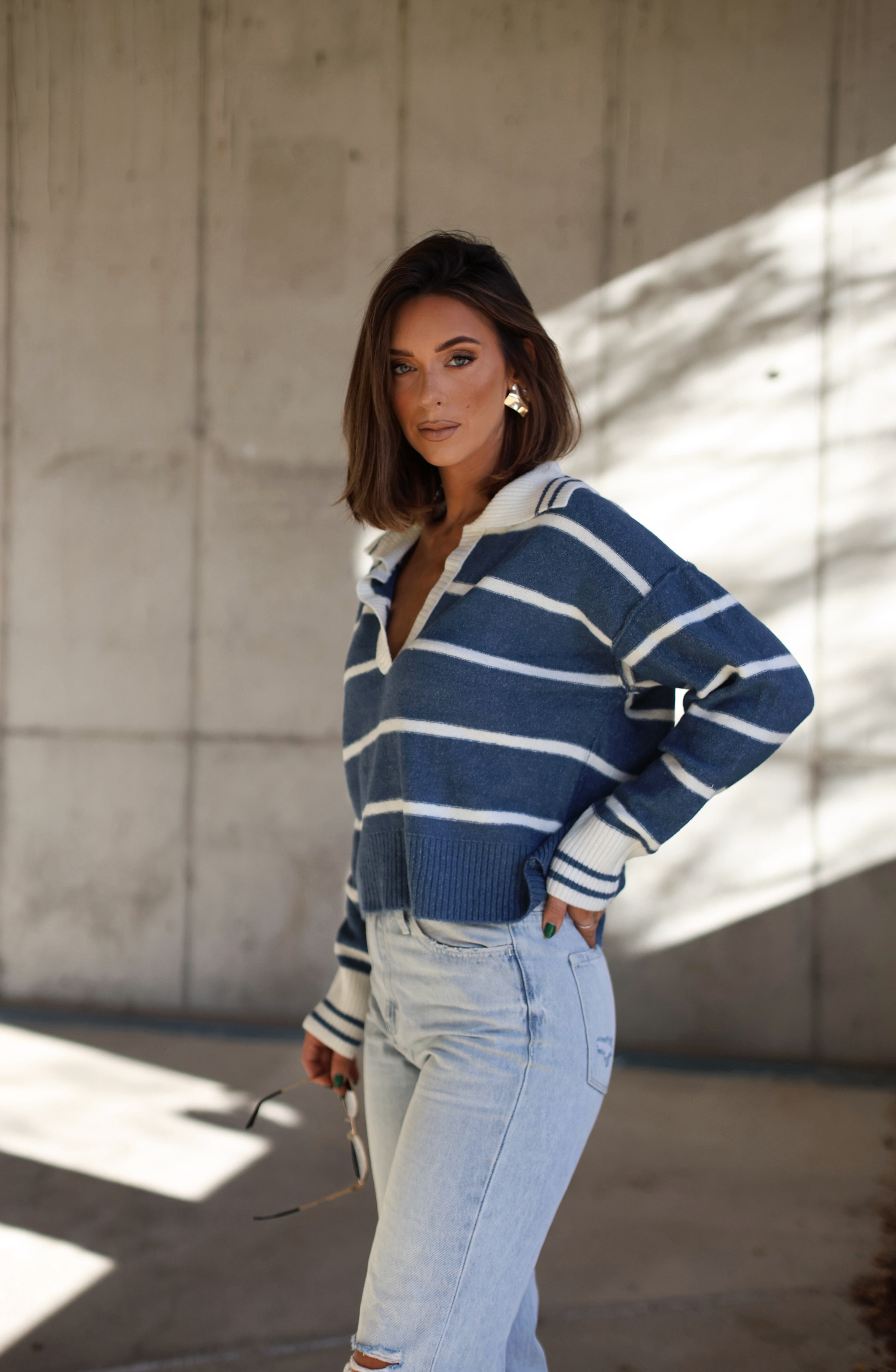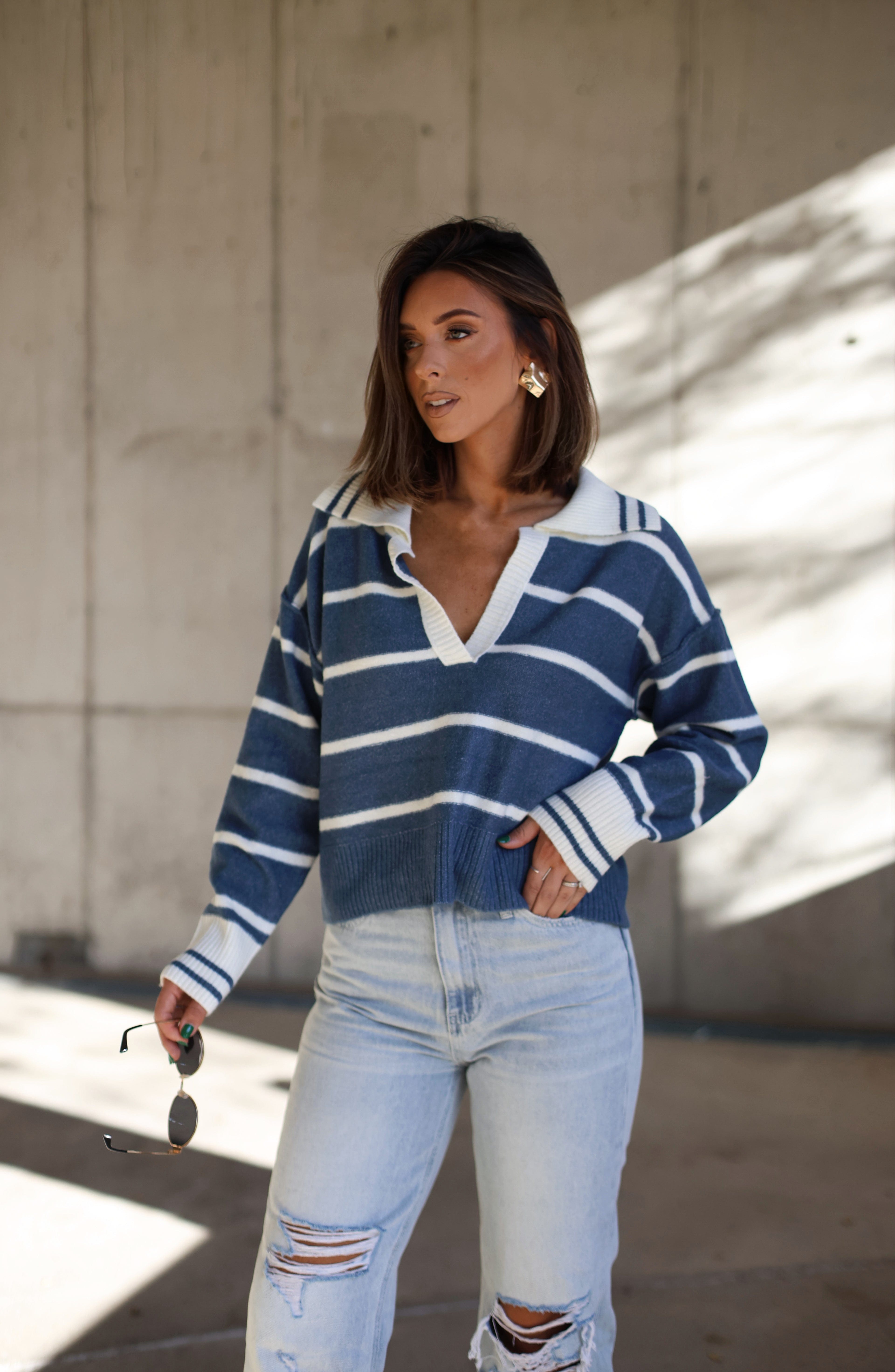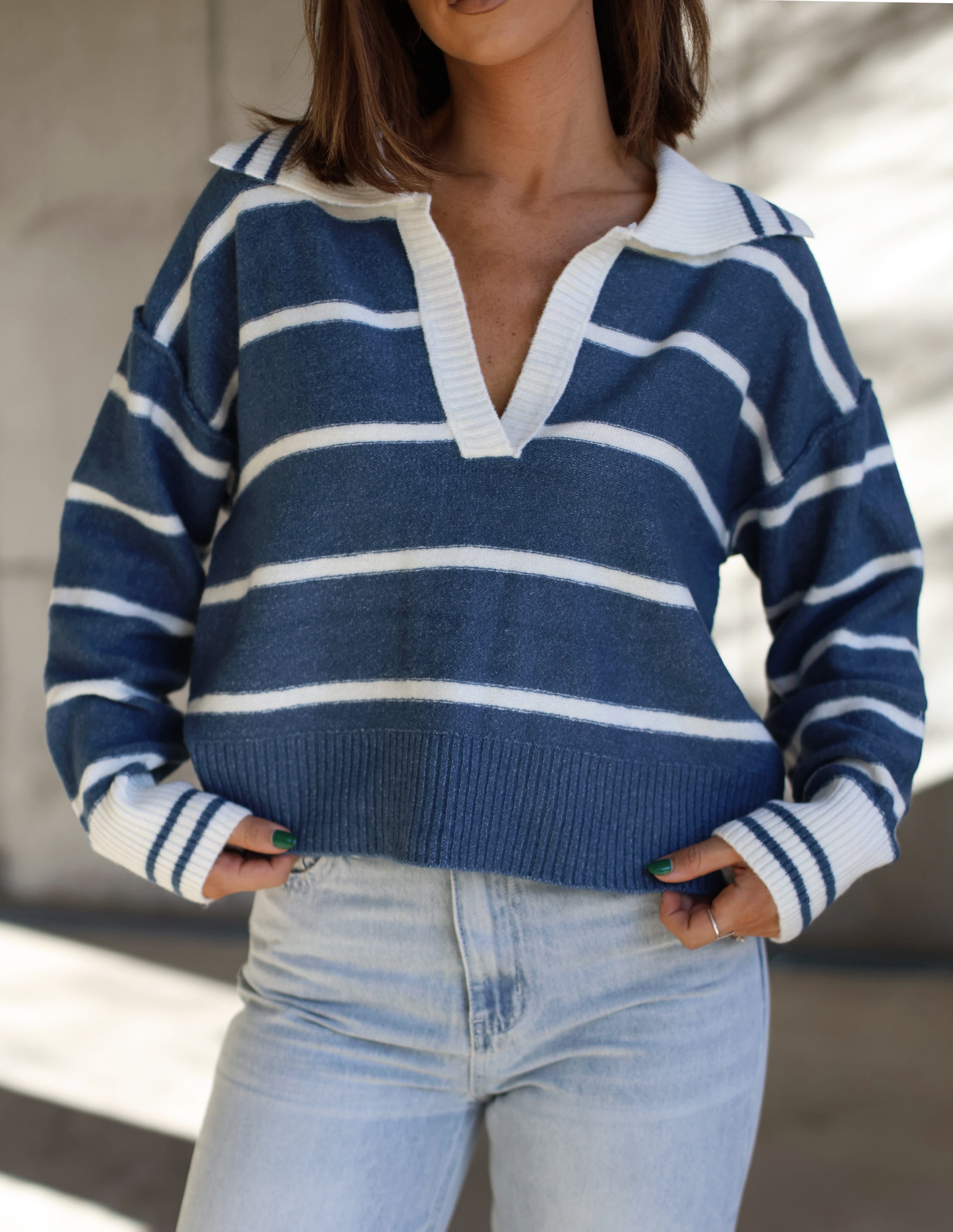 Celebrate the season in style with this flattering Snow Fall Striped Sweater. Soft, stretchy, and perfectly cropped, this masterpiece is perfect for all your winter festivities! With an elevated V-neckline, drop shoulders, and a relaxed fit, you'll be feeling warm, cozy, and chic for brunches, shopping trips, dinners, and more! Get ready to get your festive on!