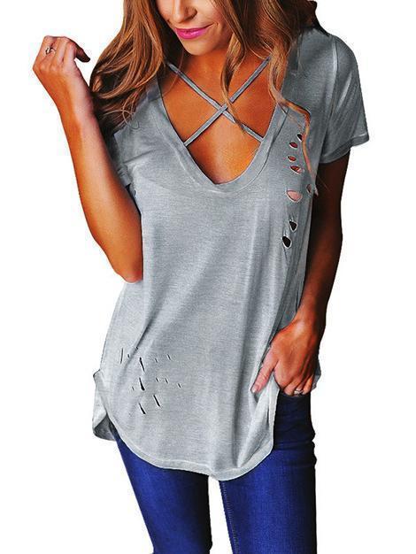Solid Color Deep V-Neck Hole T-Shirt