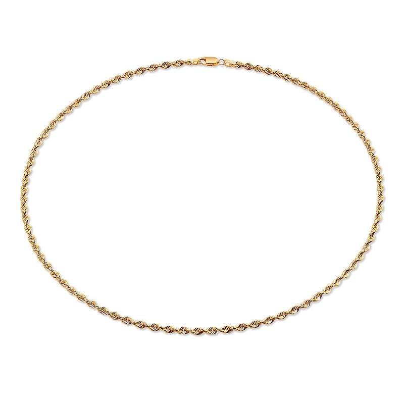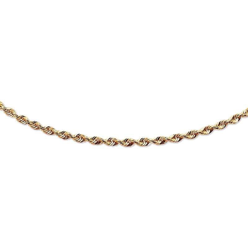 This 24-inch solid rope chain is styled in 14K yellow gold. The fine jewelry necklace is secured with a lobster clasp.