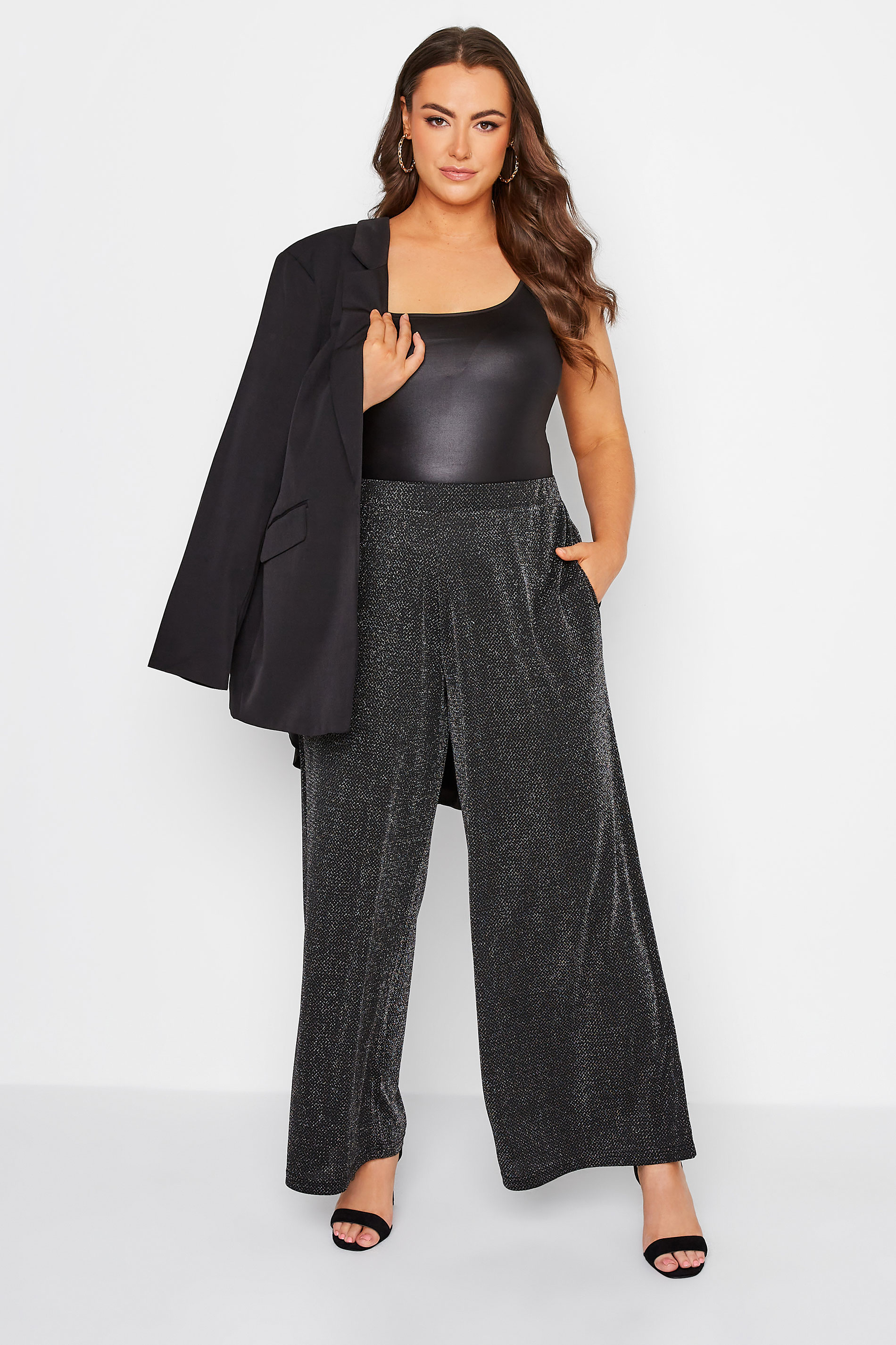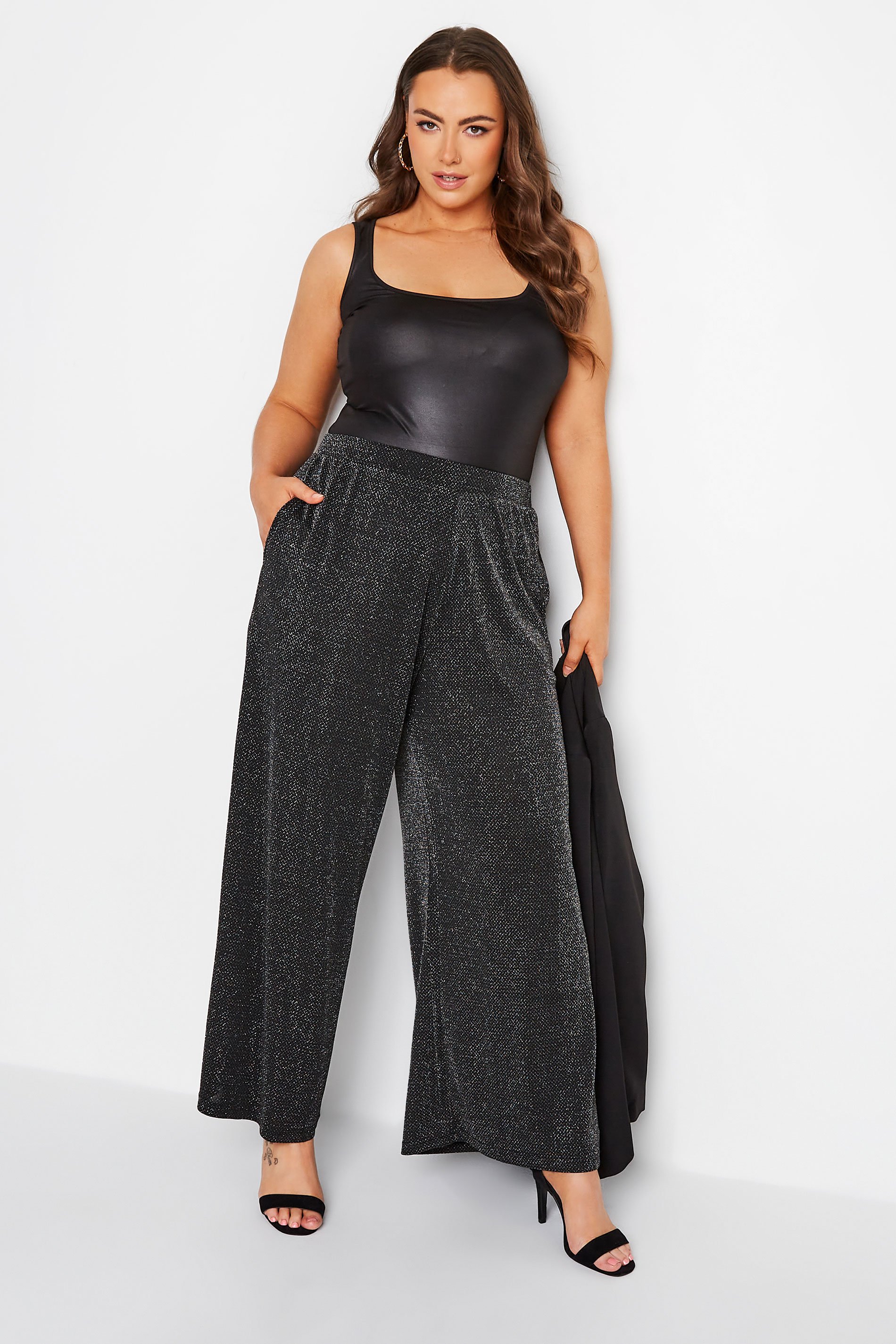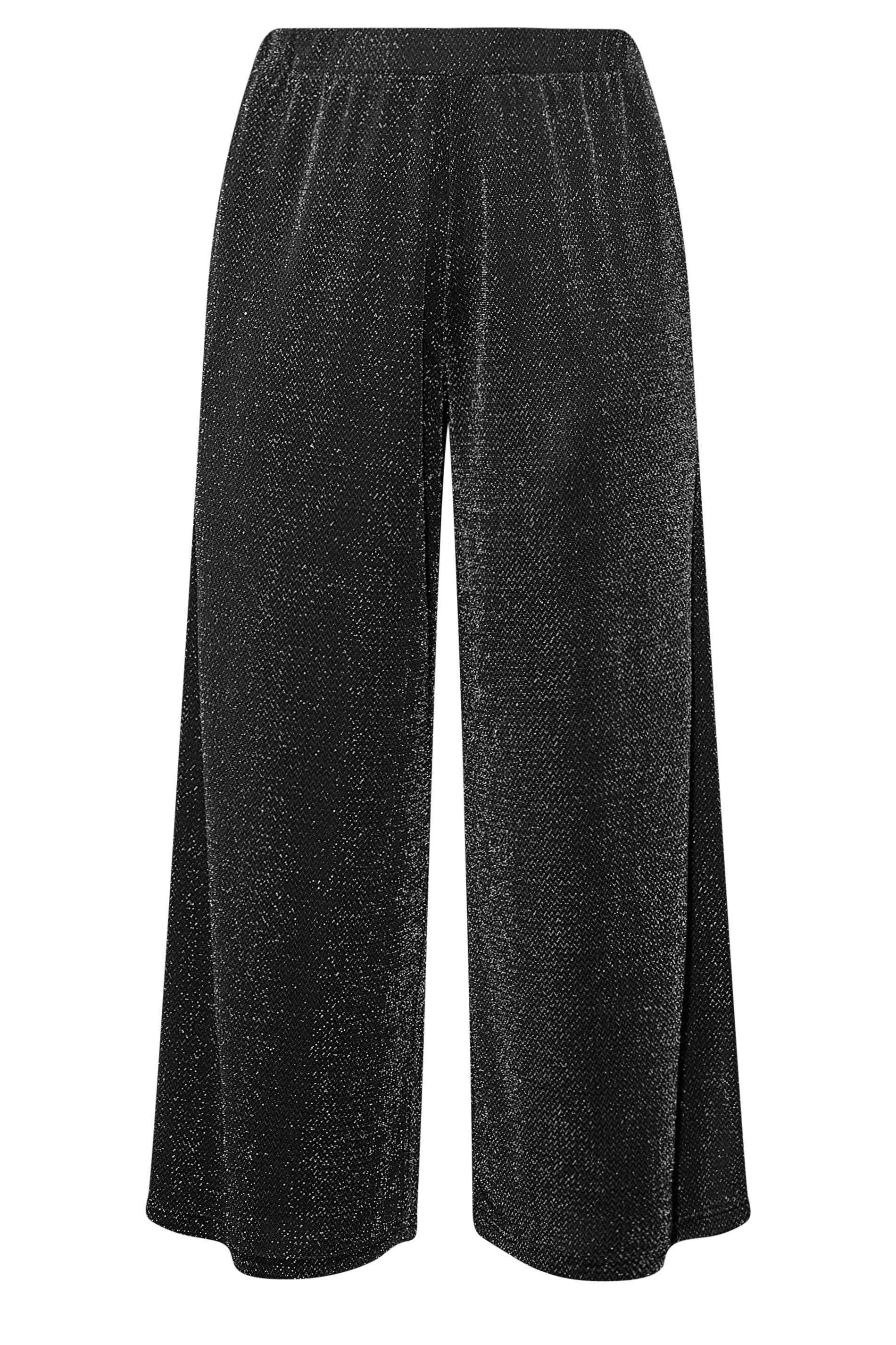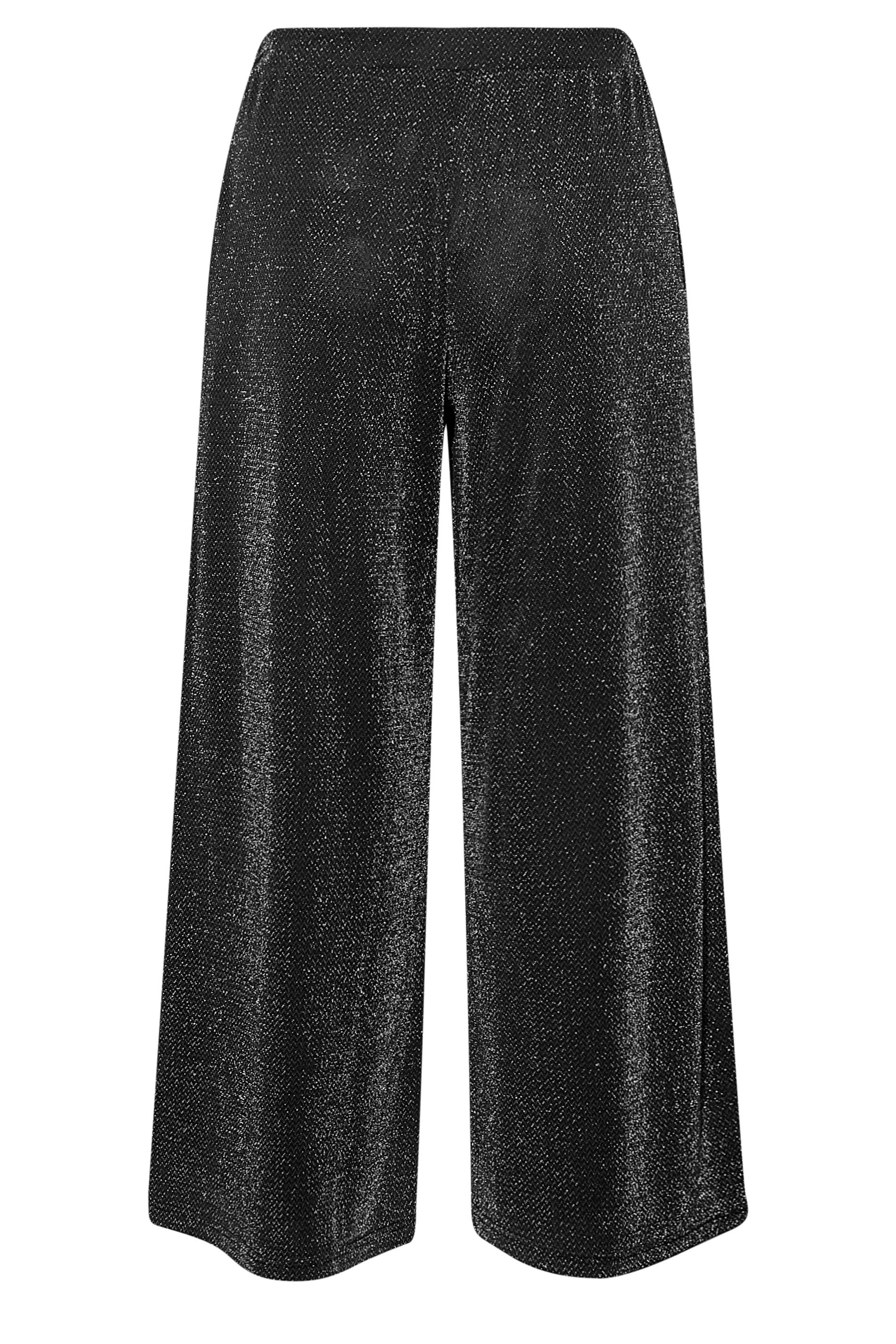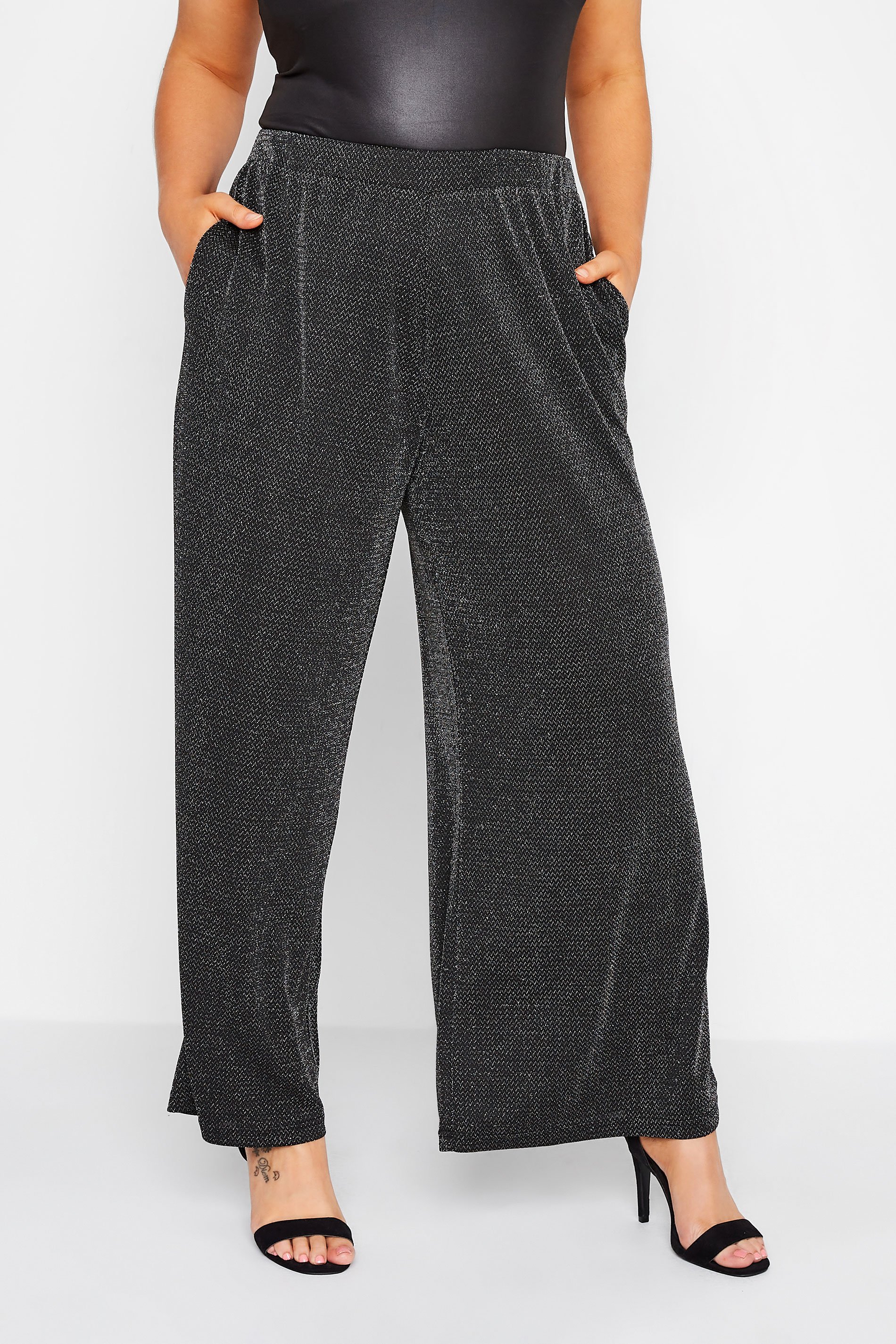 Happy hour is every hour when you wear these glitter trousers. Made from a comfortable jersey fabric, they feature an elasticated waistband and two side pockets, complete in a wide-leg style. Pair with a bodysuit, heels, and a blazer to complete the look.