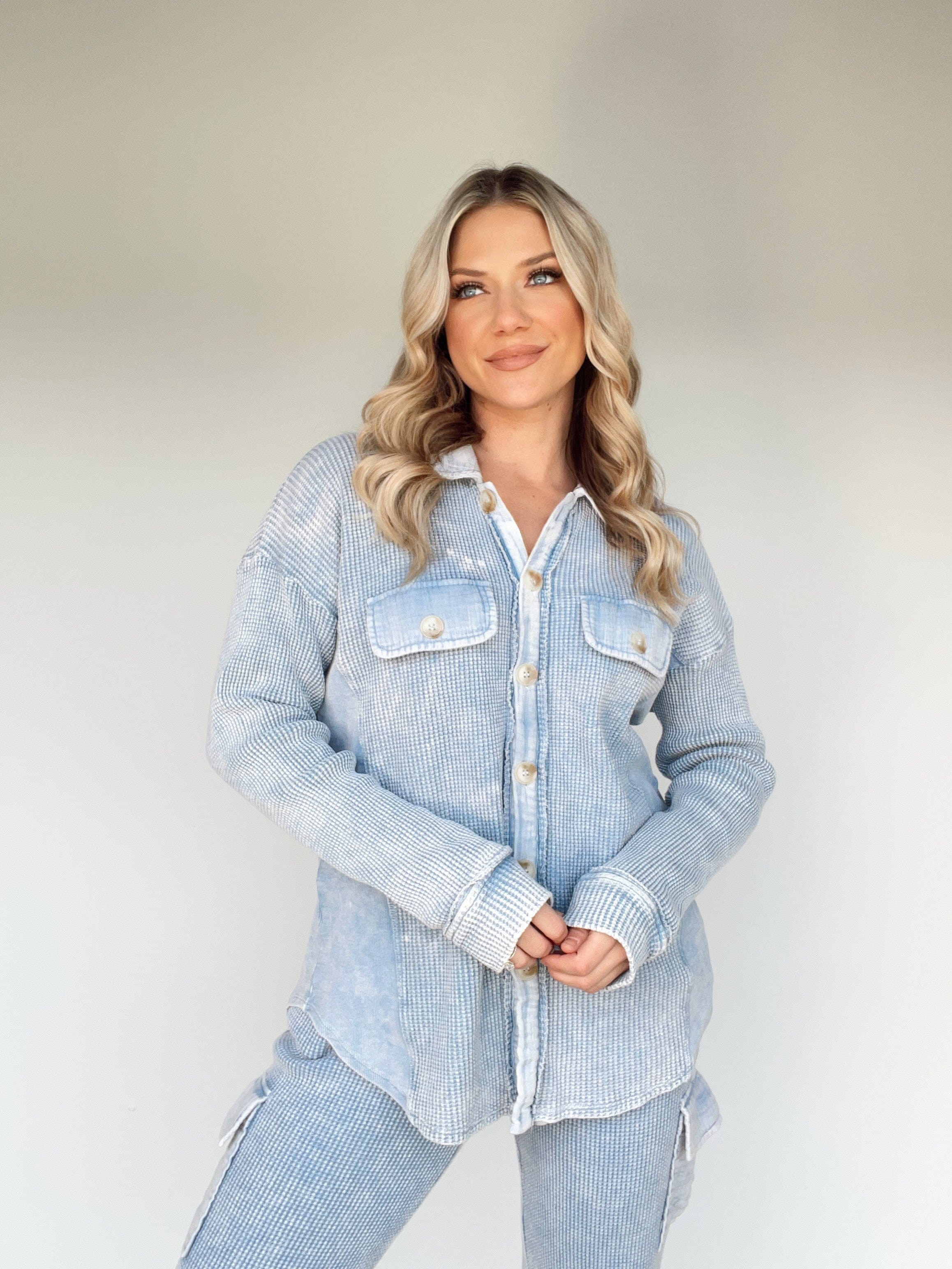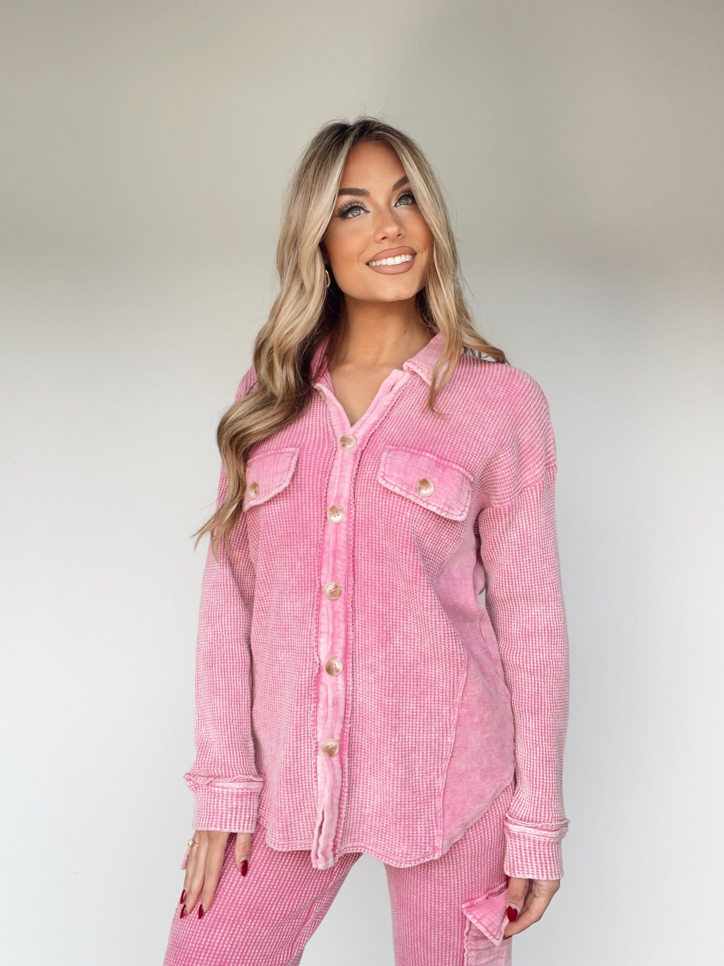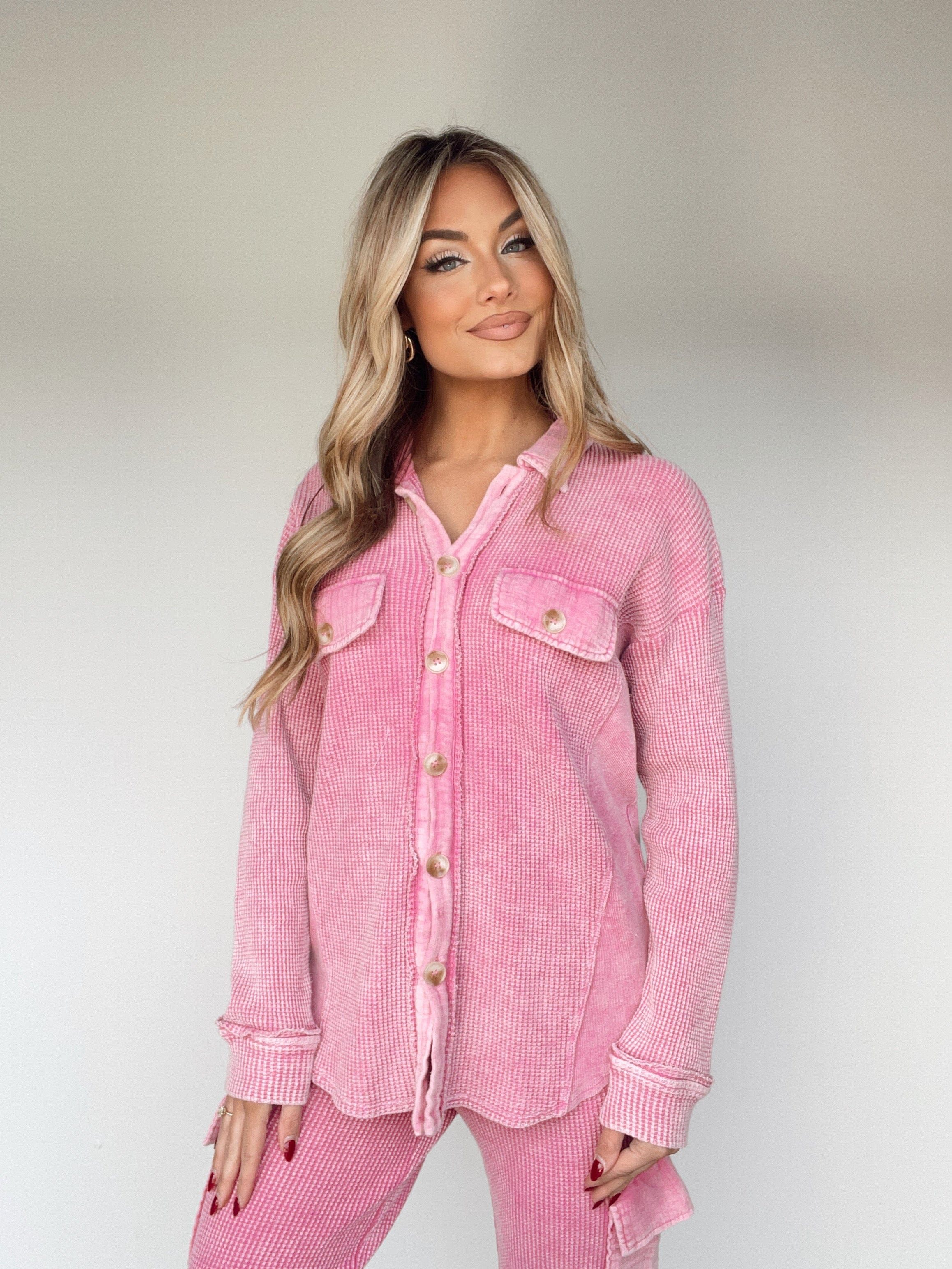 Look effortlessly stylish in this Stay Easy Button Up, featuring a v neckline, button closures, a waffle knit fabric, soft stretchy and warm material, a fun pop of color, and pocket details. The bright and elevated design is perfect for lounging at home, running errands, or going out. With a rounded hem and collared neckline, you'll stay cozy and make a statement with this top.