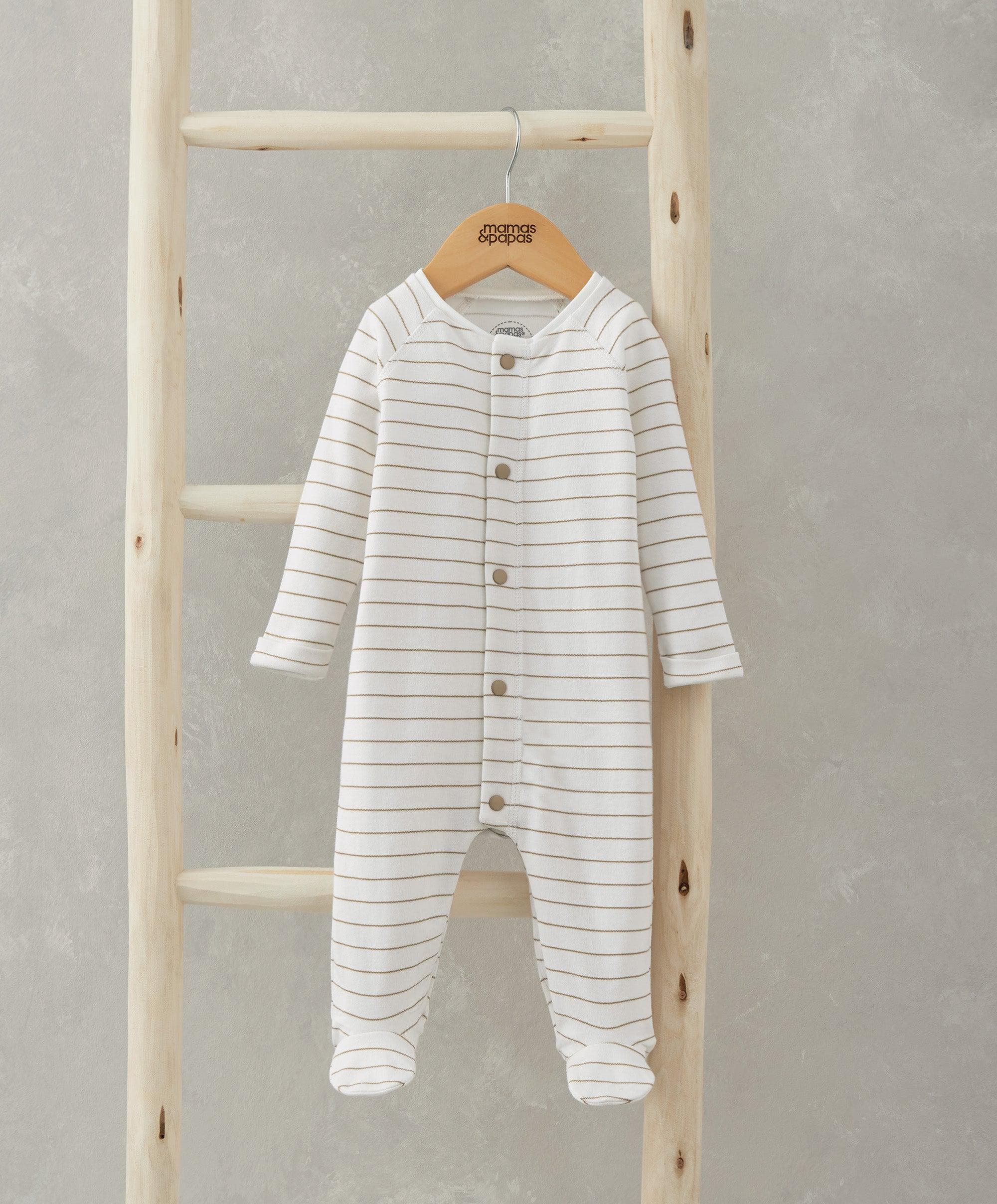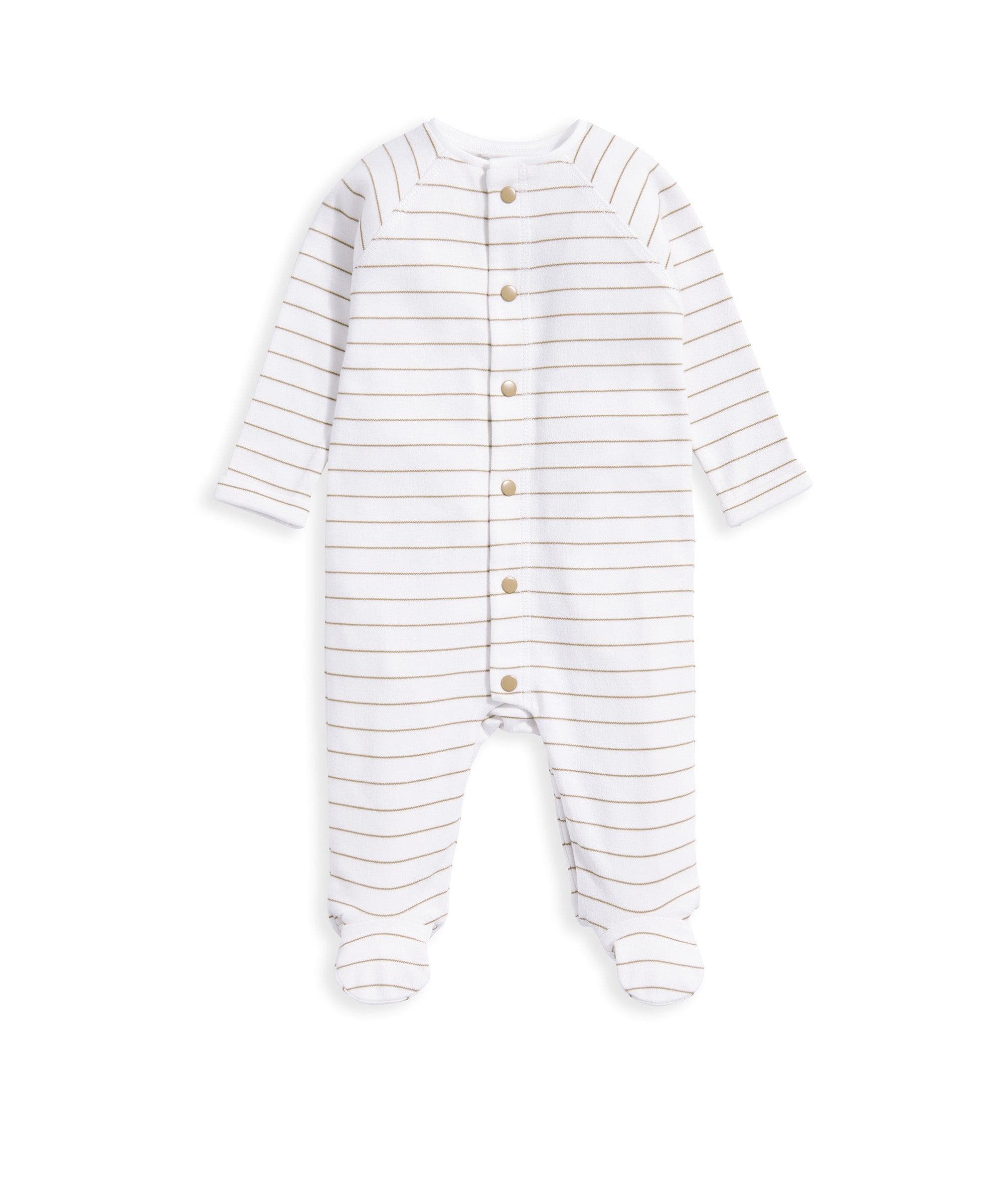 Boys' long-sleeved all in one. Features beautiful yarn-dyed toffee-coloured stripes, with turn back cuff detail finish. Integrated feet for extra warmth. Contrast poppers at center front with concealed poppers at leg opening for easy changing.