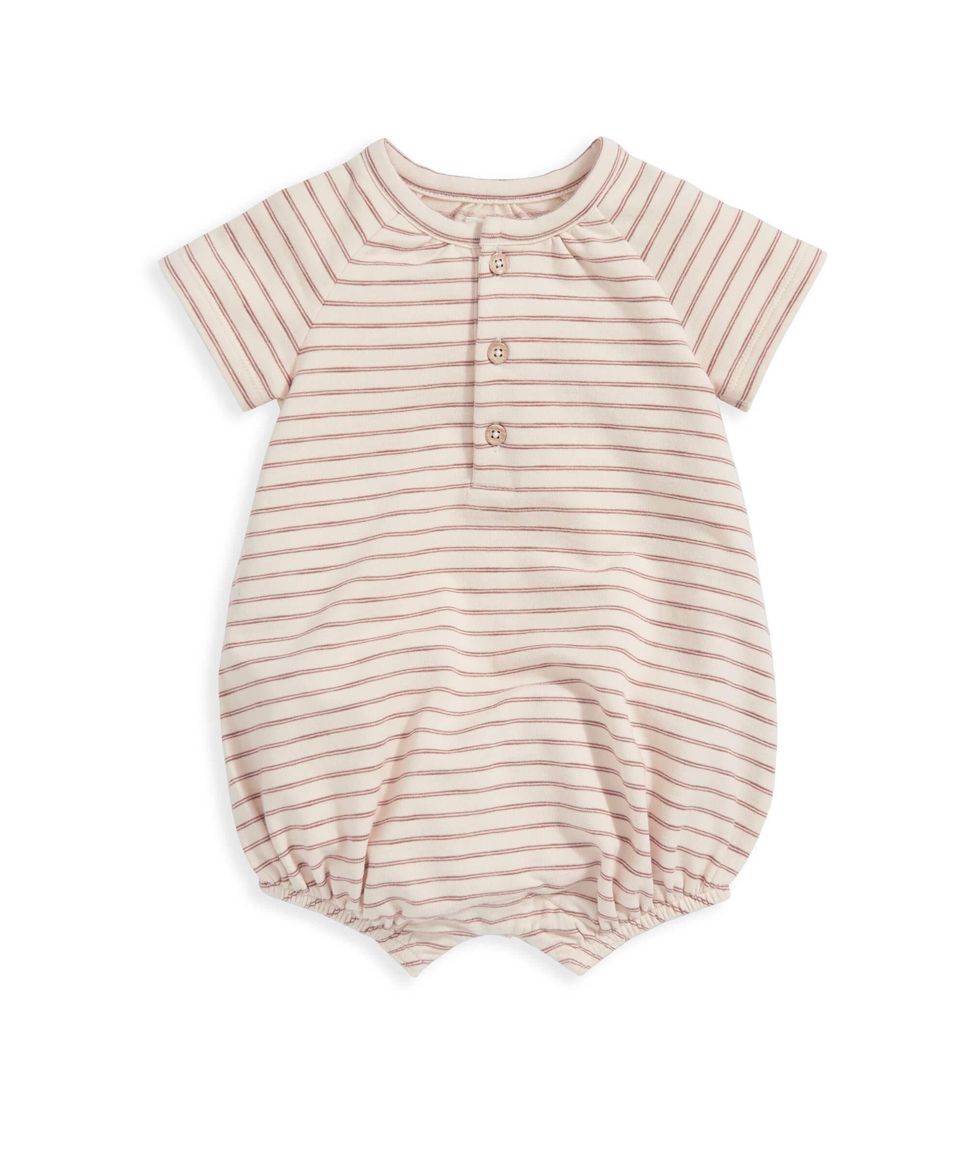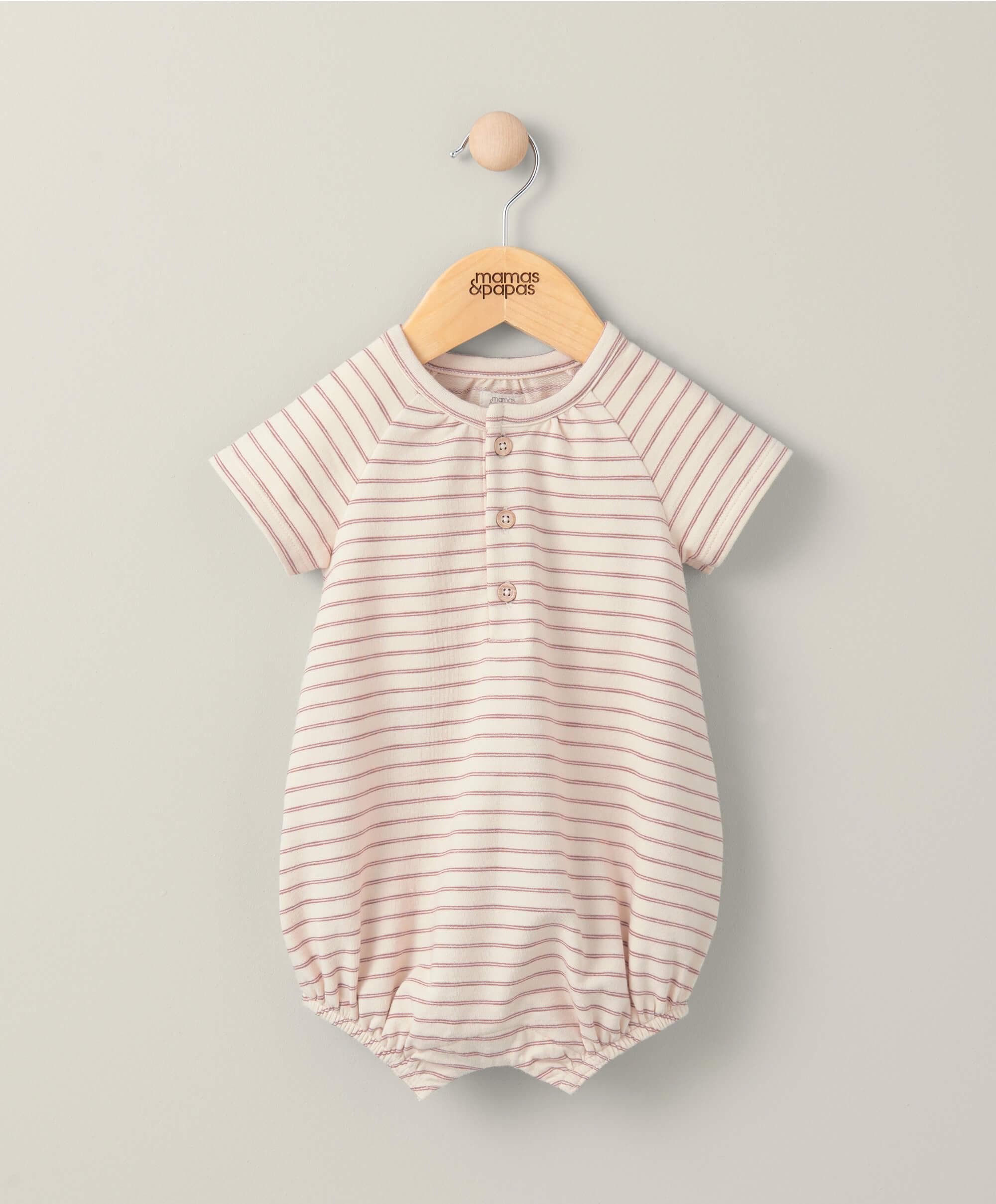 Lightweight short-sleeved shortie striped romper. Casual and roomy relaxed fit. With self fabric placket and mock wood button opening. Popper opening at crotch for easy nappy changes.