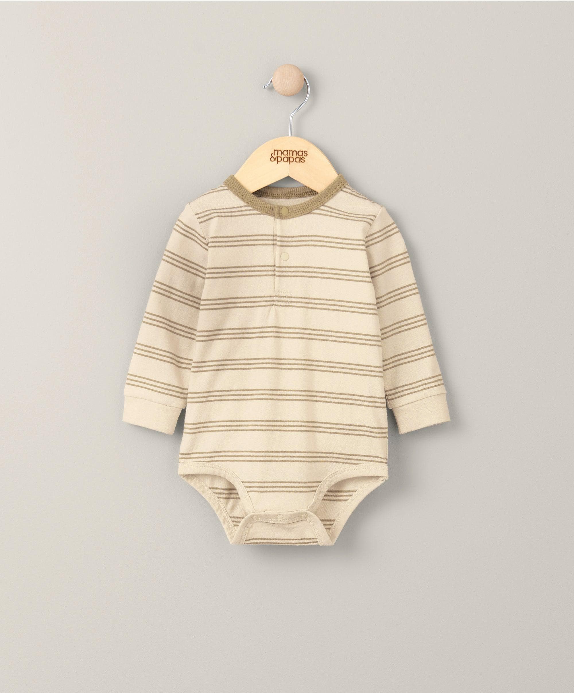 Boys' long-sleeve striped bodysuit. With contrast neck trim and placket. Button opening at front and additional popper opening on crotch for easy changes. Soft stretchy jersey fabric.