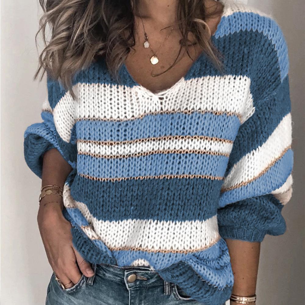 Striped Color Block Printed Long Sleeve V Neck Sweater 157406