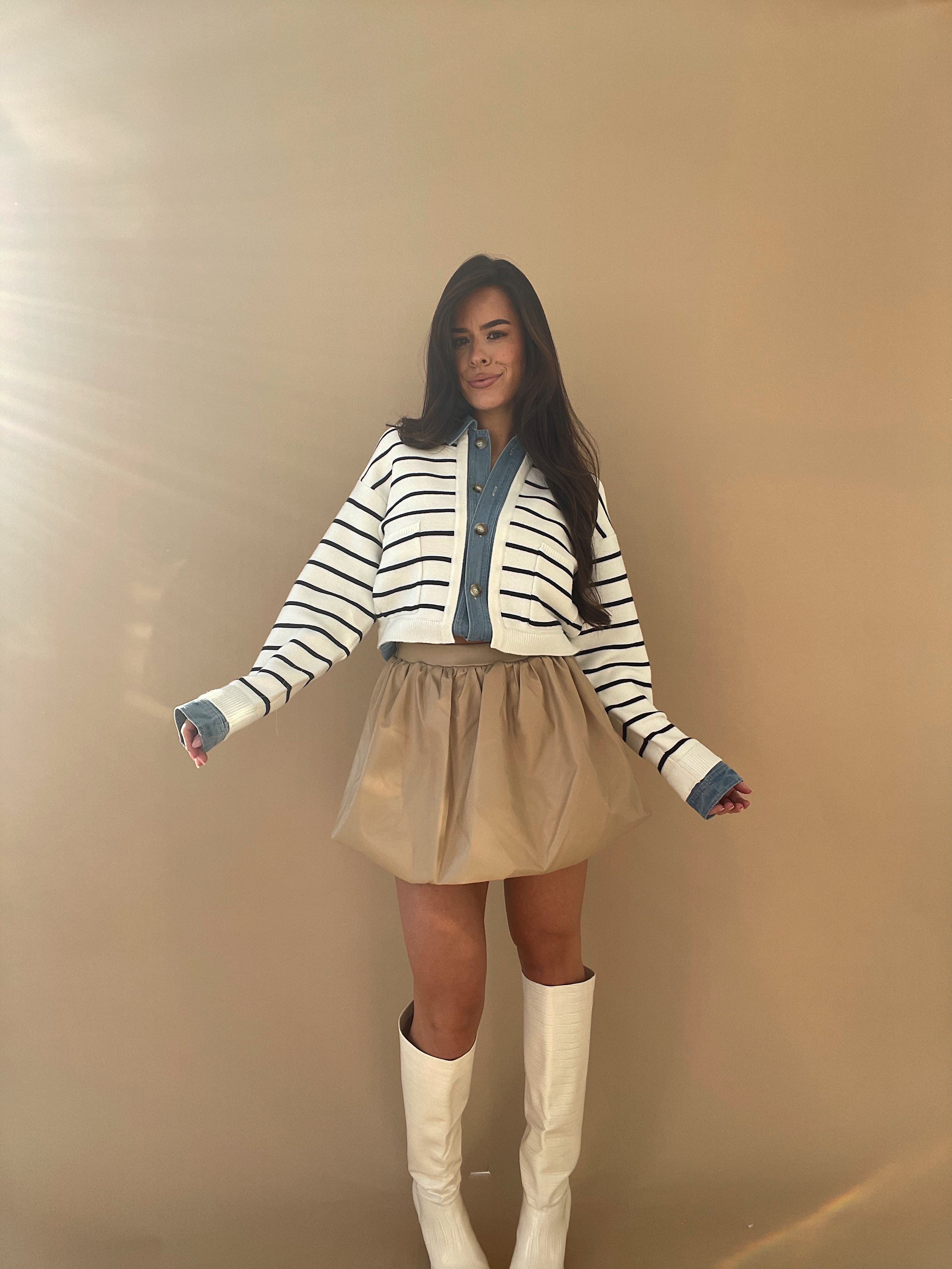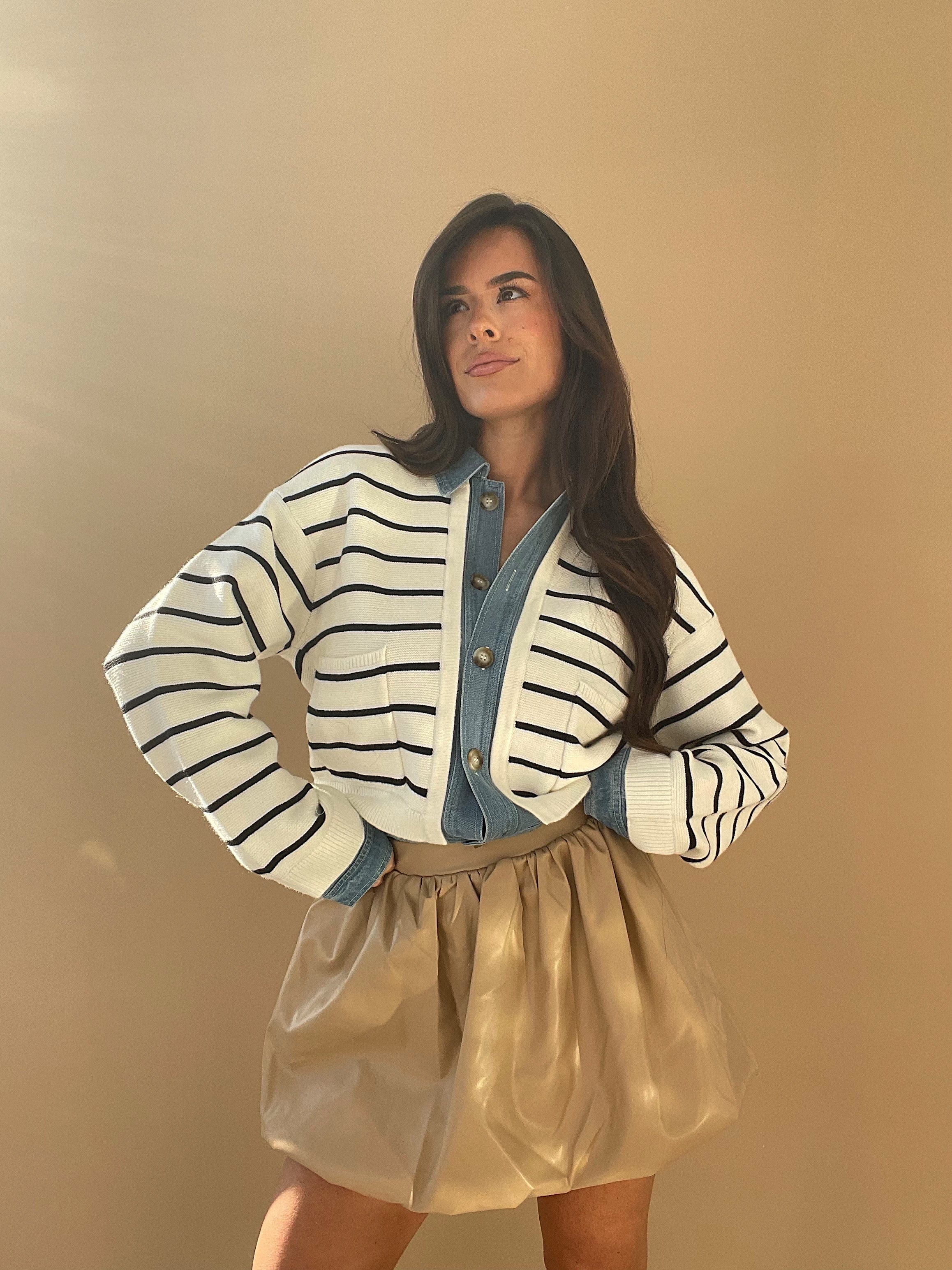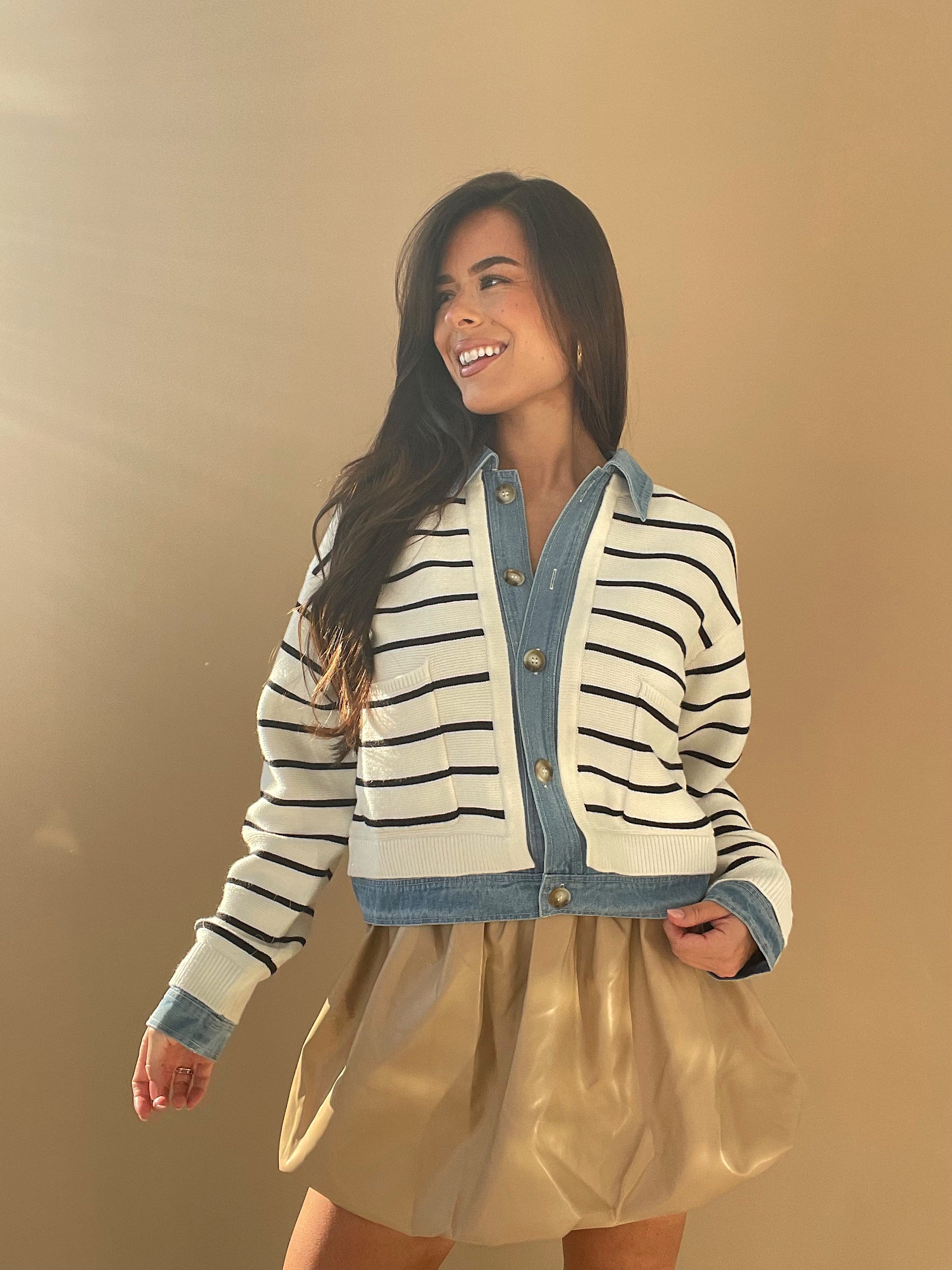 This Striped Knit Denim Cardigan is a versatile addition to any wardrobe. The button-down design and front pockets add functionality, while the attached denim under-layer provides added warmth and durability. The unique striped design adds a touch of style to this classic cardigan.