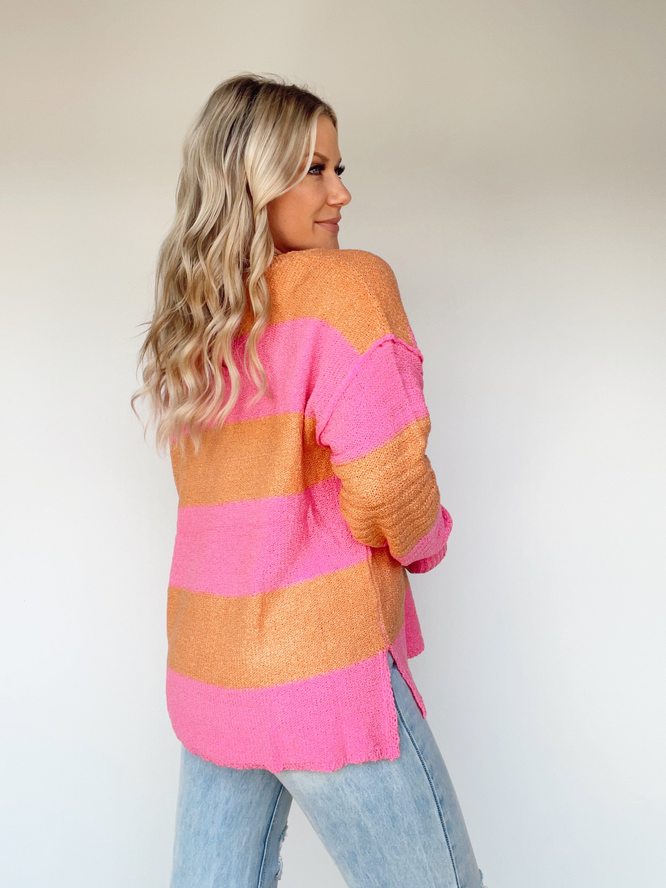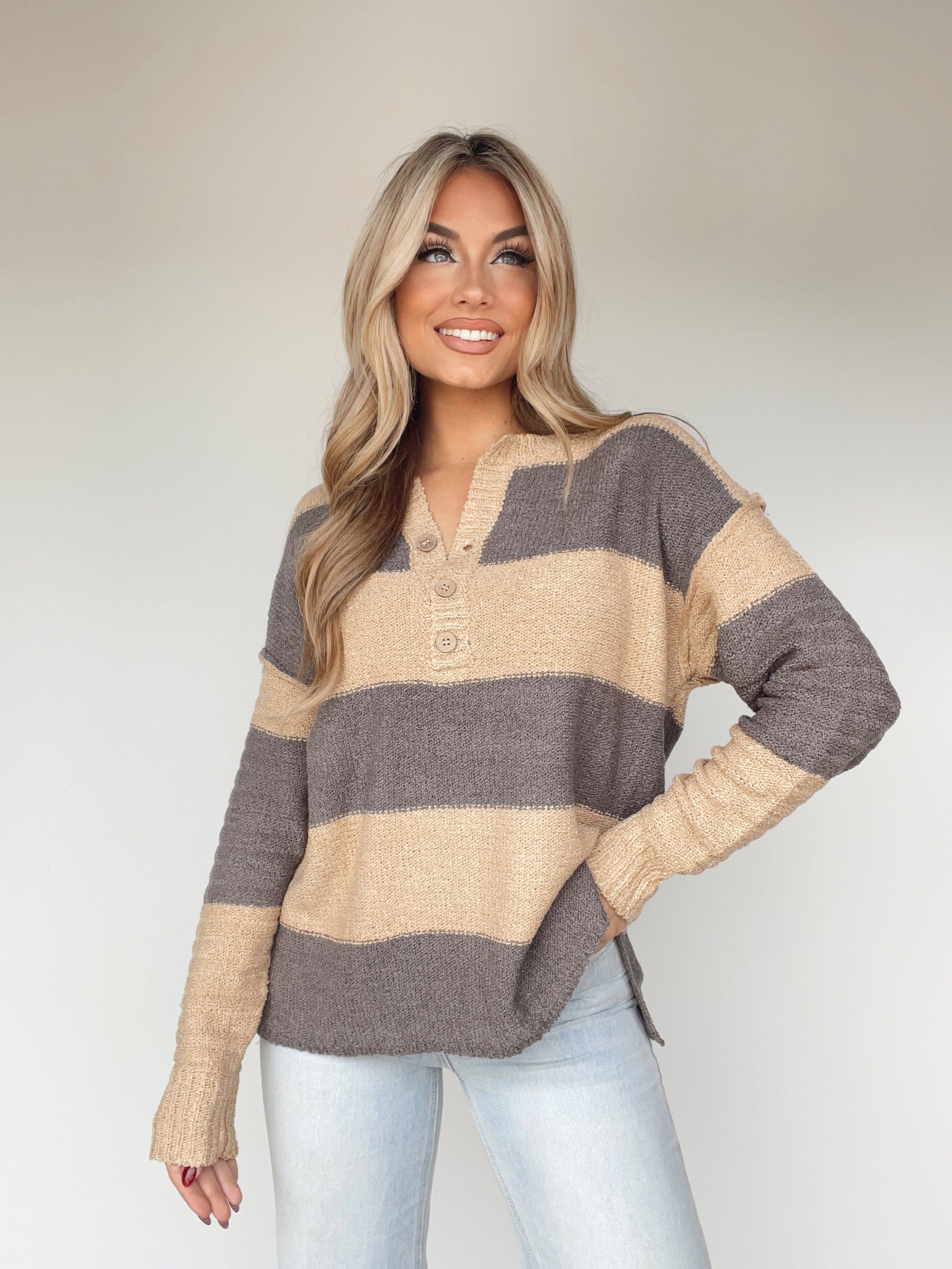 This Sunrise And Coffee Sweater is the epitome of luxury and comfort. Crafted from a soft, stretchy knit fabric, this sweater features a versatile v-neckline with chic button details and a relaxed fit for ultimate coziness. The striped pattern brings an elevated look perfect for a coffee date, brunch, or shopping. Stay stylish and comfortable with this refined yet trendy sweater.