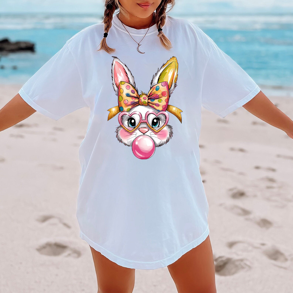 T-Shirt Easter Bunny Wearing Heart Glasses Blowing Bubbles Printed Round Neck Short Sleeve