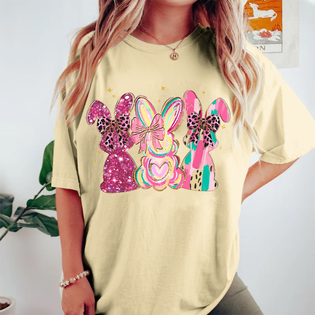T-shirt Pink Leopard Sequined Bow Easter Bunny Women Printed Round Neck Short Sleeve