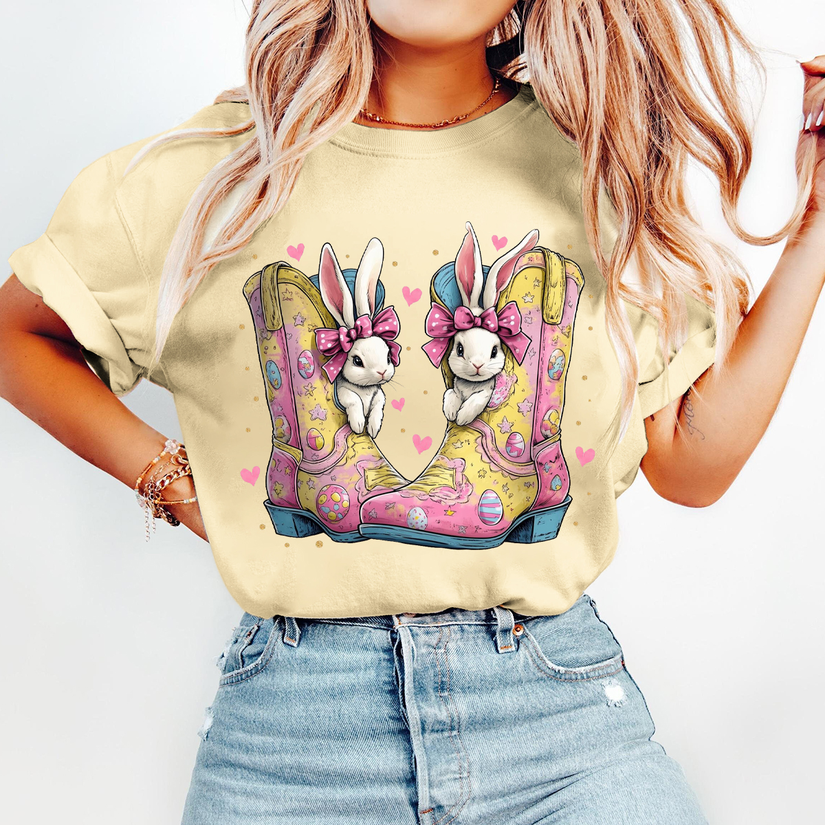 T-shirt Western Easter Bunny and Easter Eggs Women Printed Round Neck Short Sleeve