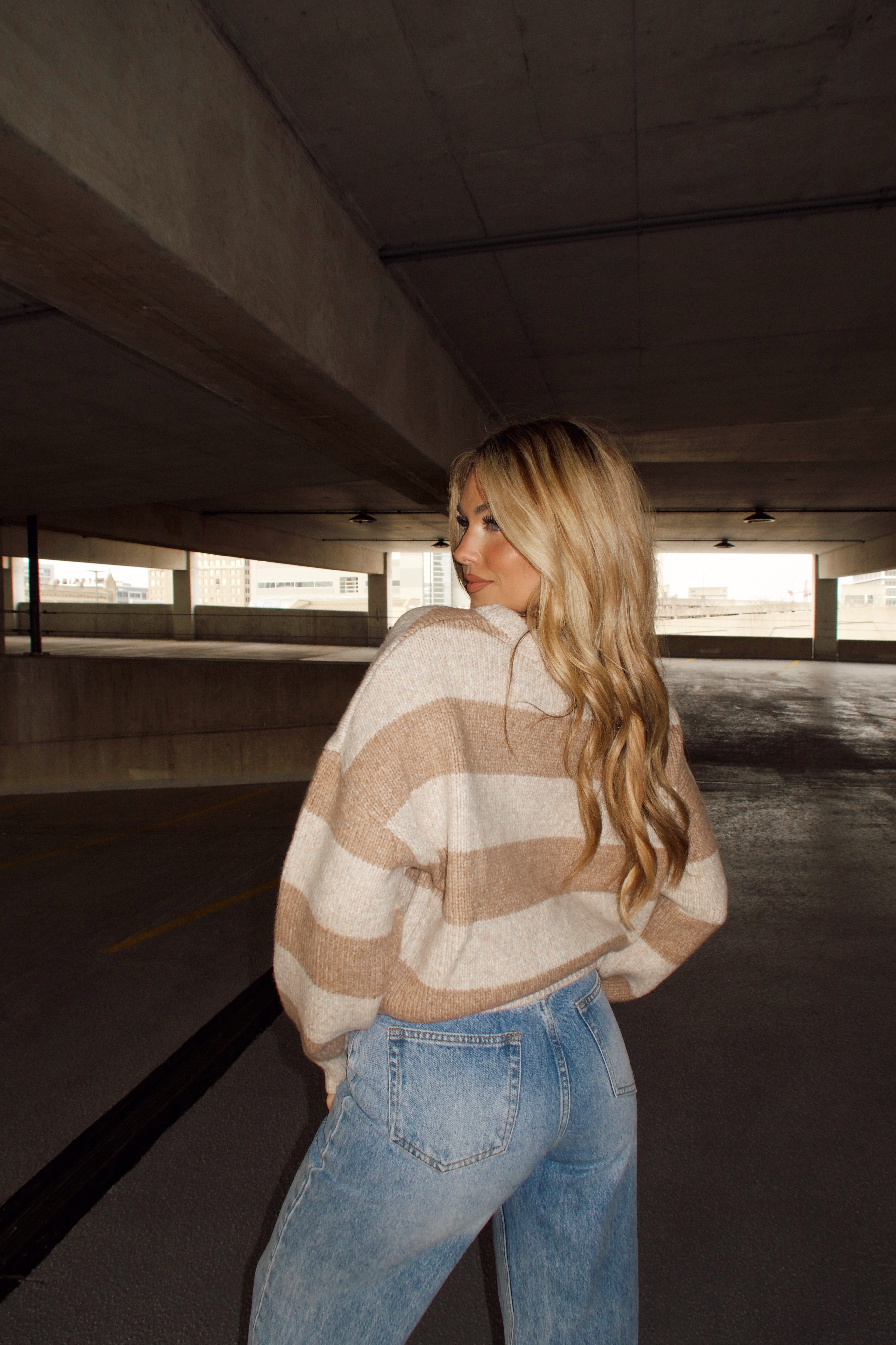 Enjoy luxurious comfort in our Teddy Bear Sweater, featuring a timeless striped pattern in neutral hues, ribbed knit construction, and soft, stretchy fabric that feels oh-so cozy. Classy and chic, it's a versatile piece that'll transition from a brunch date to dinner or shopping, with a relaxed fit and drop shoulders for laid-back lounging. Perfect for fall and winter, you'll love cozy style of this elevated sweater.
