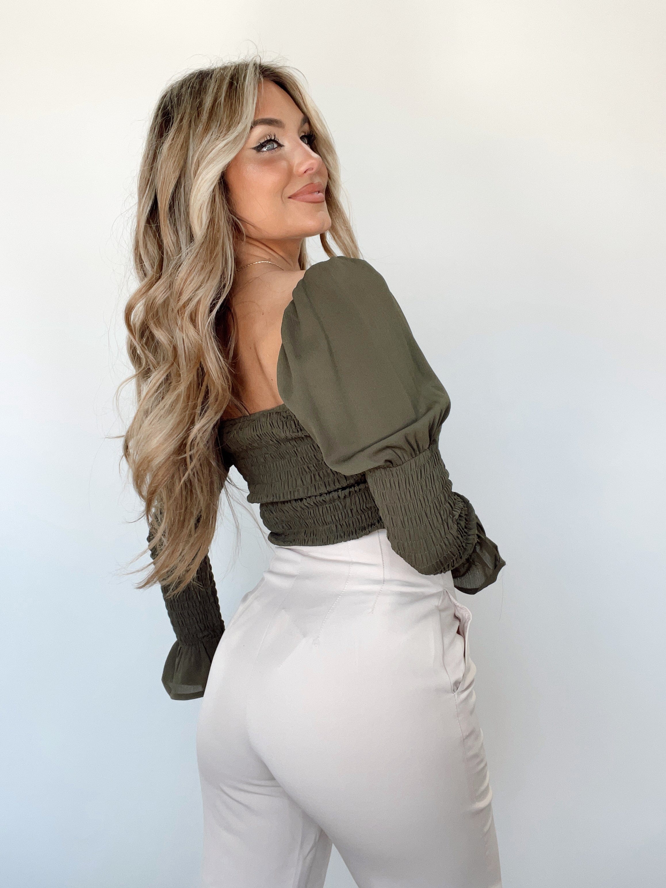 Tell 'em that you're crushin' in the Lane 201 Tell Me How You Feel Top. This cropped blouse has a square neckline with shirring on the back. Long puff sleeves are adorned with shirring as well with a small flounce at the end. Shown paired with the Break The Rules Denim.