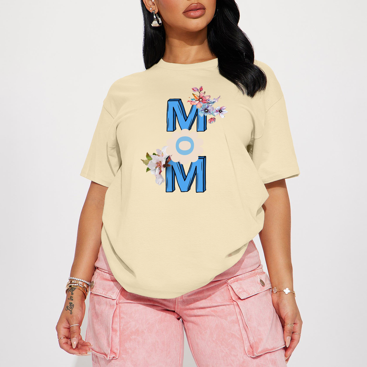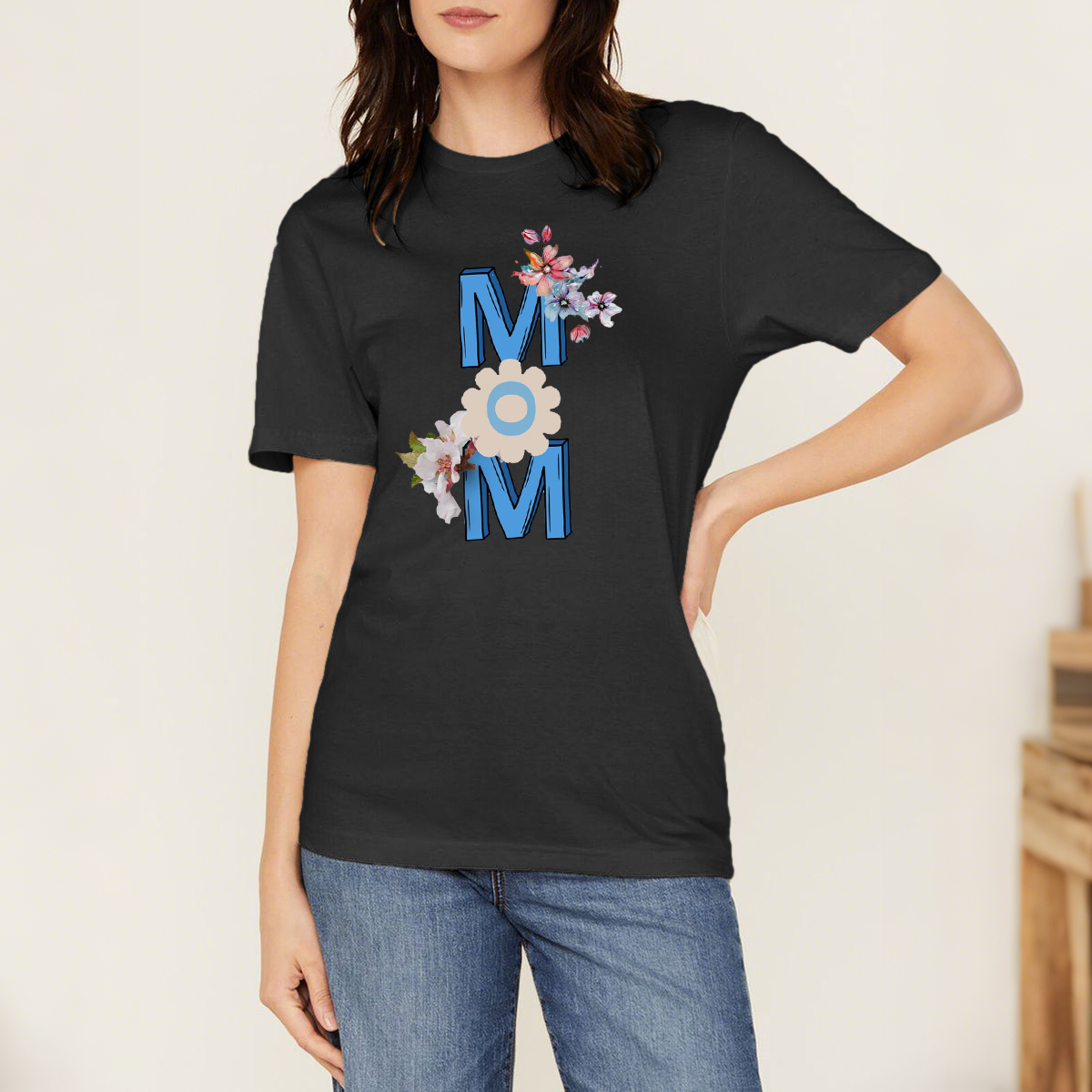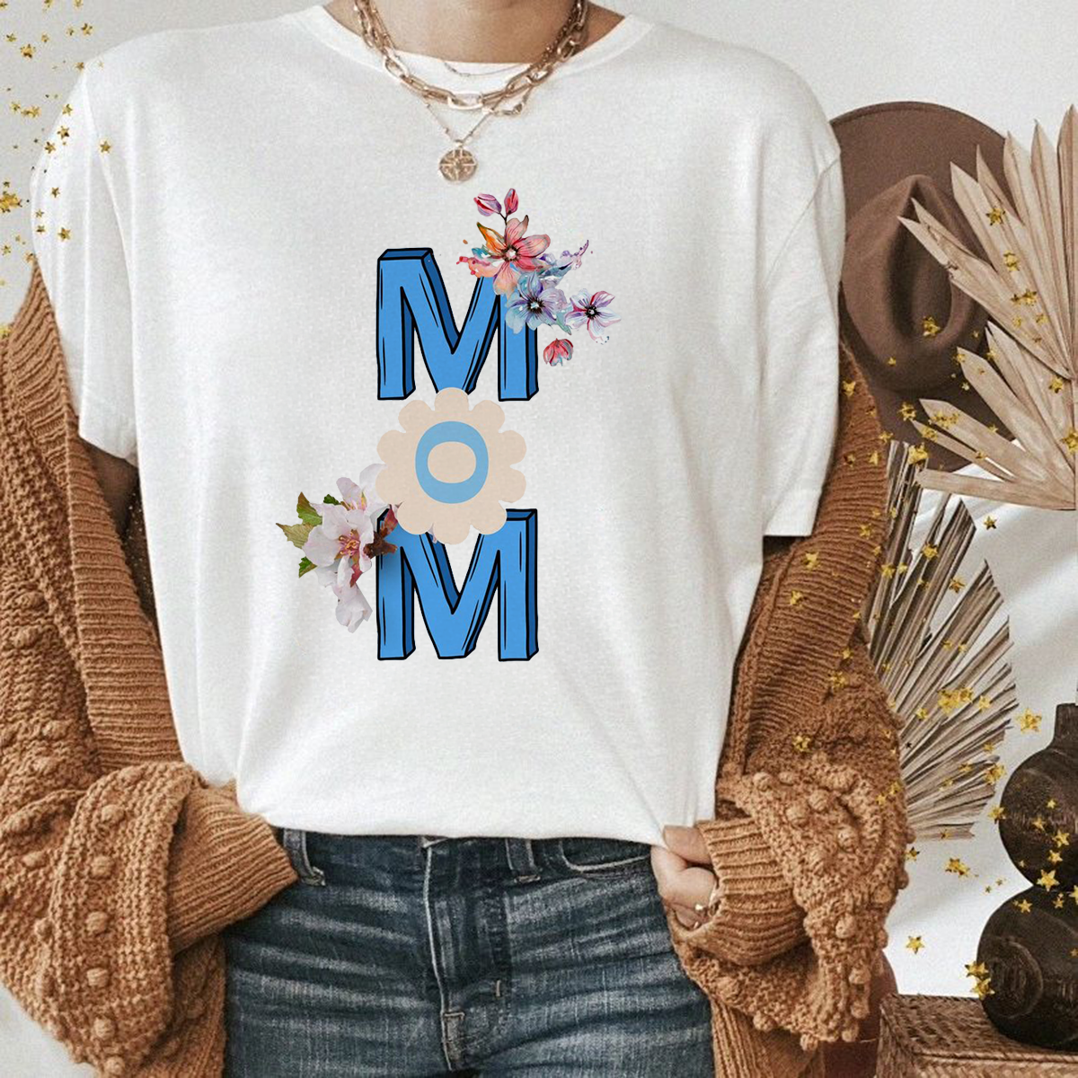 The "Mom" Slogan Is Blue, And The "O" Is Designed As A White Flower With A Light Blue Center And Colorful Floral Patterns Around It. It Is A Casual T-Shirt And Mom'S Wear.