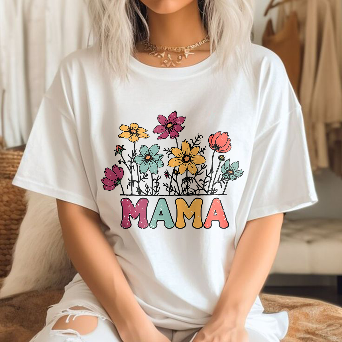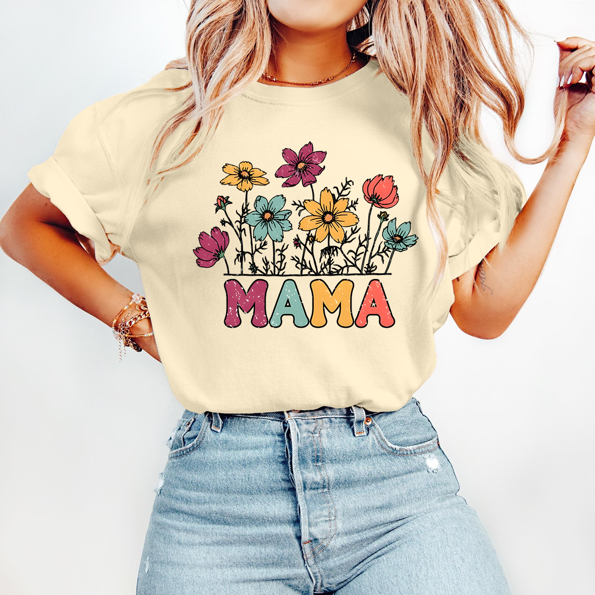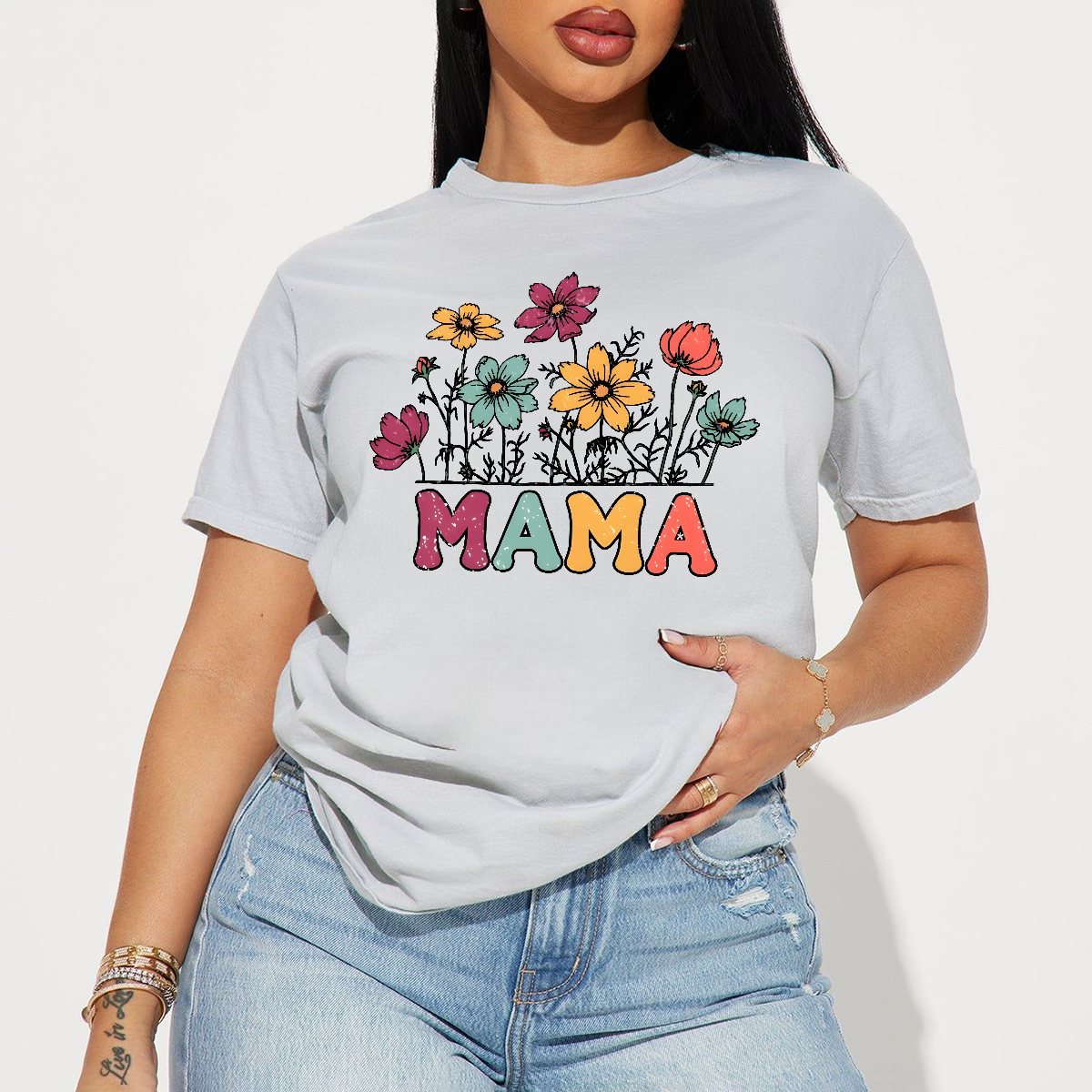 The four letters "MAMA" are presented in a colorful three-dimensional style, with a row of colorful flower patterns above, with combined patterns of yellow, pink, purple, etc., casual T-shirts, mother