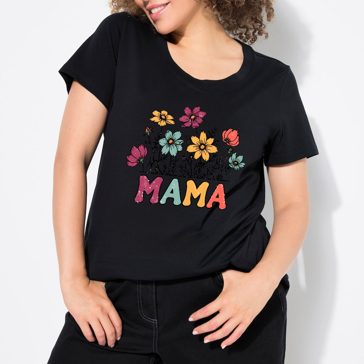 The four letters "MAMA" are presented in a colorful three-dimensional style, with a row of colorful flower patterns above, with combined patterns of yellow, pink, purple, etc., casual T-shirts, mother 9518616