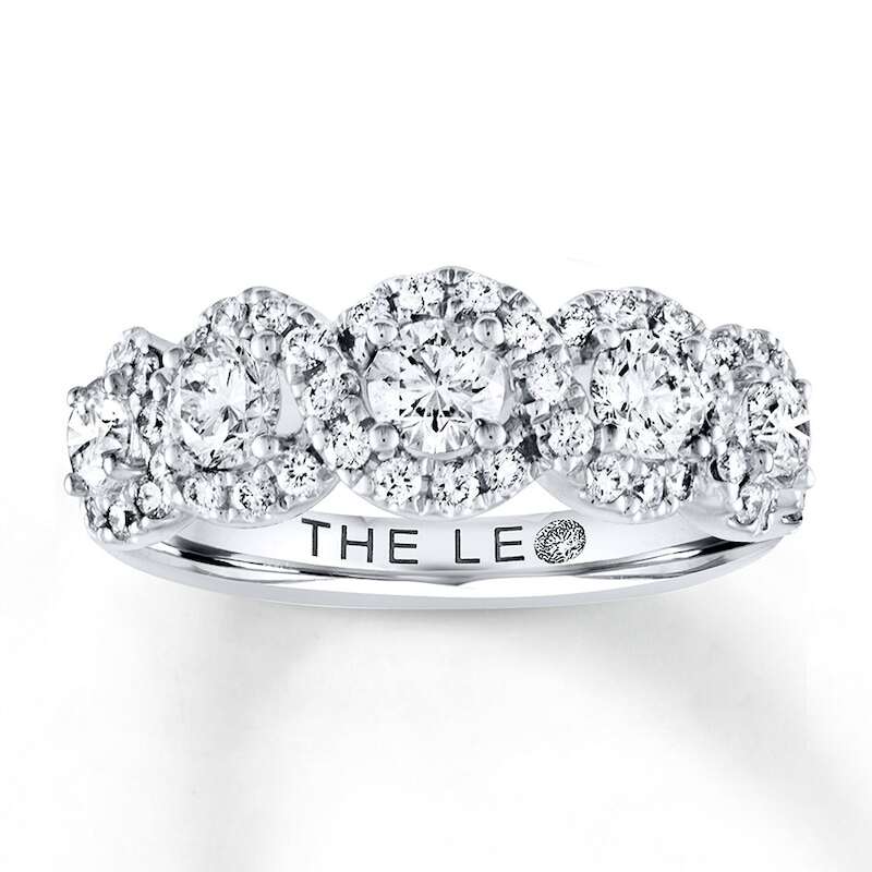 This sensational Leo Diamond ring for her showcases a row of dazzling round diamonds encircled by more diamonds. The ring has a total diamond weight of 1 1/2 carats and is styled in polished 14K white gold.