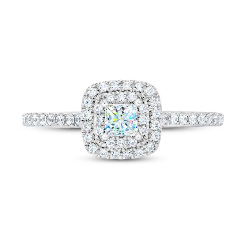 A 1/4-carat princess-cut First Light? diamond is the center of attention in this breathtaking engagement ring. From Leo Schachter, the independently certified diamond features Fire Prism? technology that creates infinite flashes of color for more fire and sparkle. Shimmering round diamonds double halo the center and line the band, bringing the total diamond weight of the 14K white gold ring to 1/2 carat. The center diamond is laser-inscribed with a unique Gemscribe? serial number to ensure your peace of mind. Live Your Love in Color.?