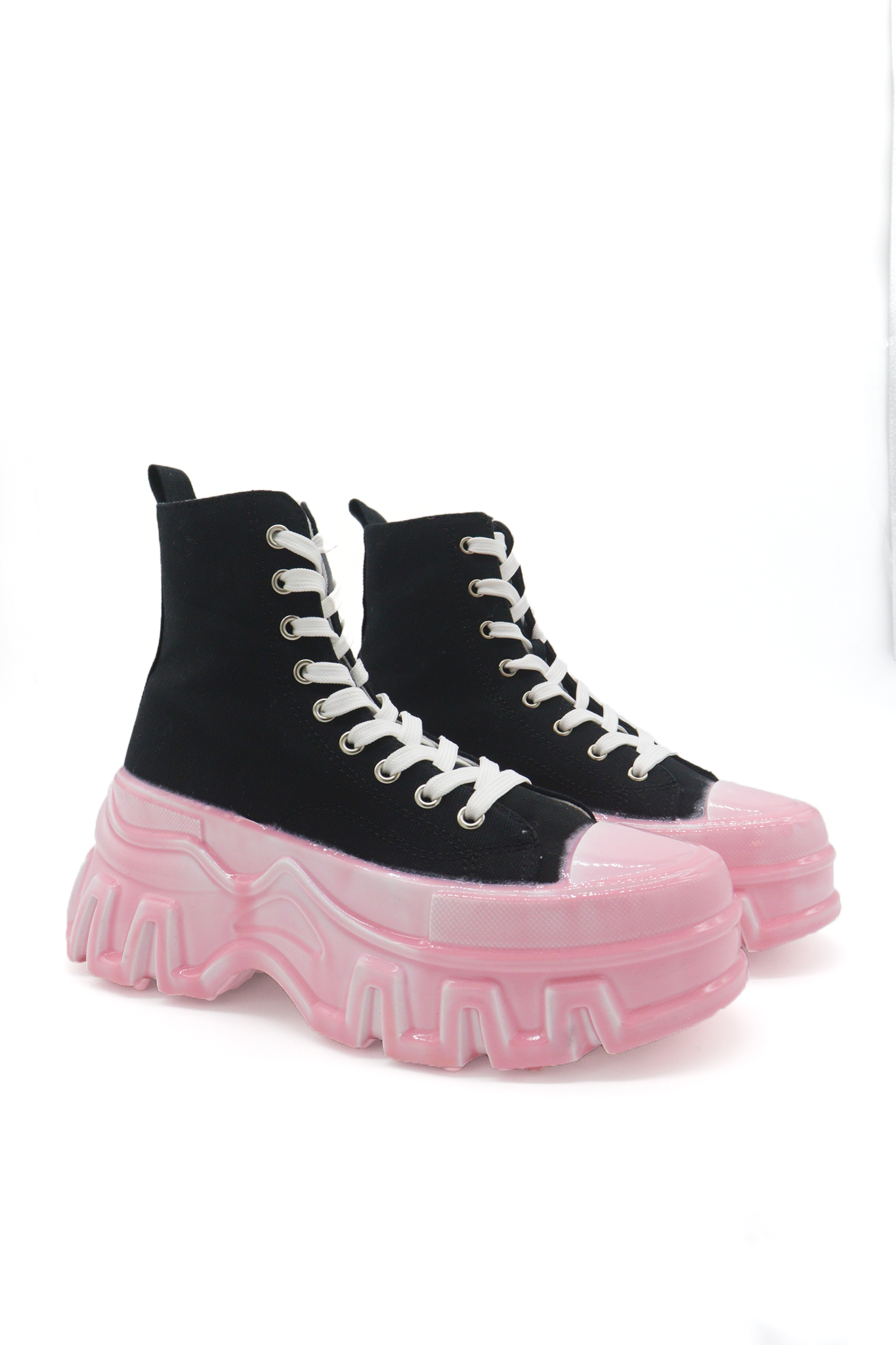 Los tenis THROW UP | PINK son cómodos y espectacularmente atrevidos porque tienen una suela?escandalosa muy alta, al igual que la parte superior porque la tela llega al tobillo junto con las agujetas. ?Puedes entrar en tendencia, que esperas para tenerlos!.