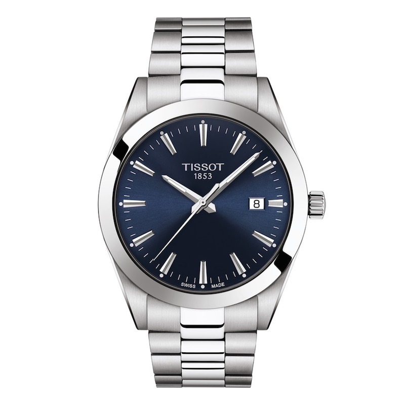 This Tissot Gentleman watch combines elegant and masculine design at an affordable price. The shiny bezel and refined details such as the blue dial with luminous indexes and hands draw the eye. A sapphire crystal tops the 40mm stainless steel case, which protects the Swiss quartz movement. The watch has a date window at 3 o'clock, water-resistance to 100 meters, and the stainless steel bracelet is secured in place by a push-button deployment clasp. Style # T1274101104100