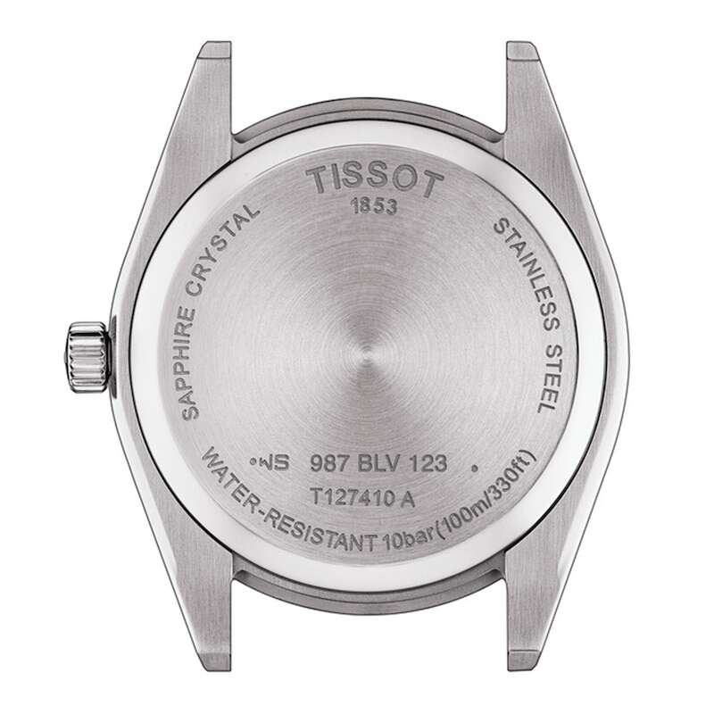 This Tissot Gentleman watch combines elegant and masculine design at an affordable price. The shiny bezel and refined details such as the blue dial with luminous indexes and hands draw the eye. A sapphire crystal tops the 40mm stainless steel case, which protects the Swiss quartz movement. The watch has a date window at 3 o'clock, water-resistance to 100 meters, and the stainless steel bracelet is secured in place by a push-button deployment clasp. Style # T1274101104100