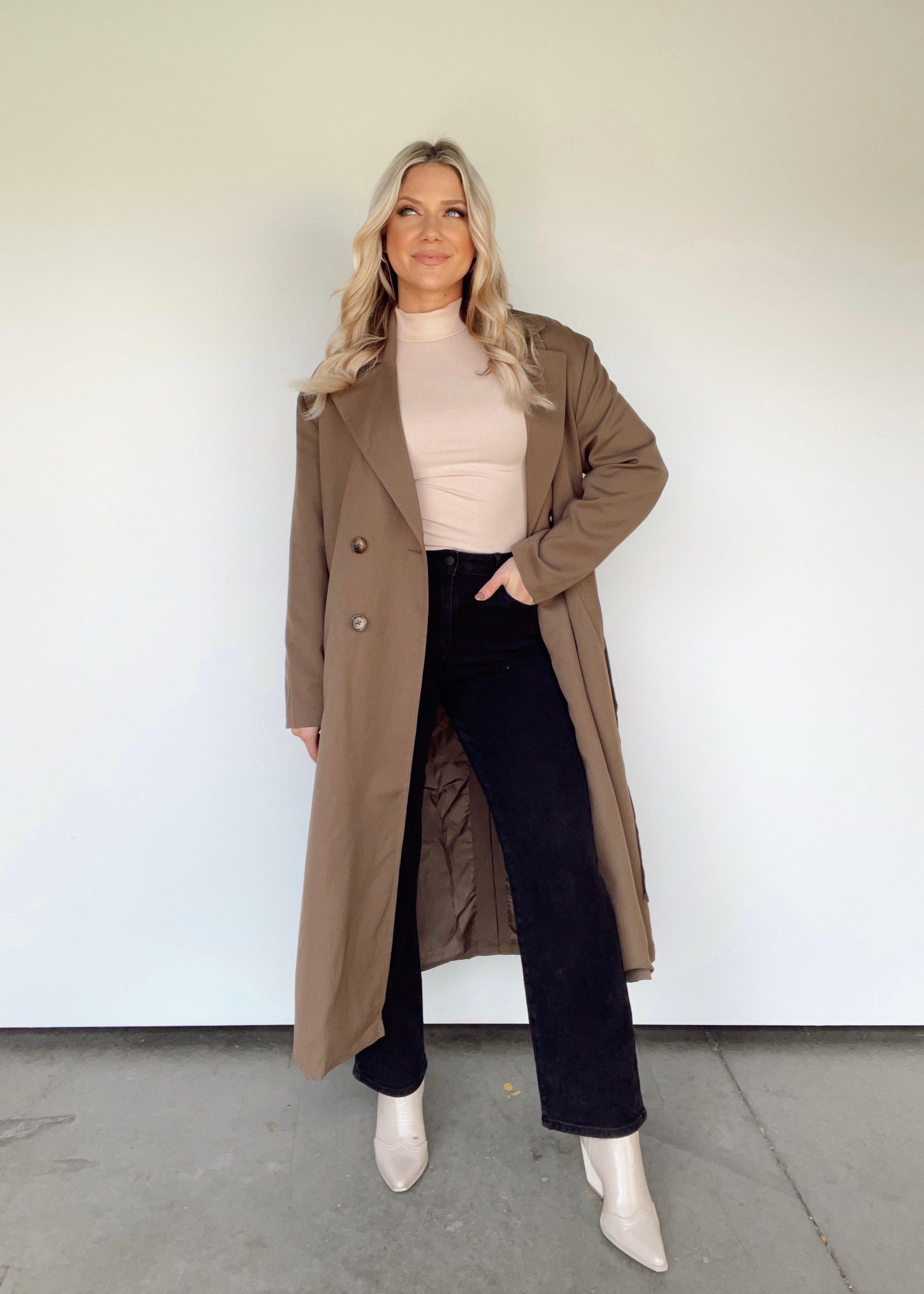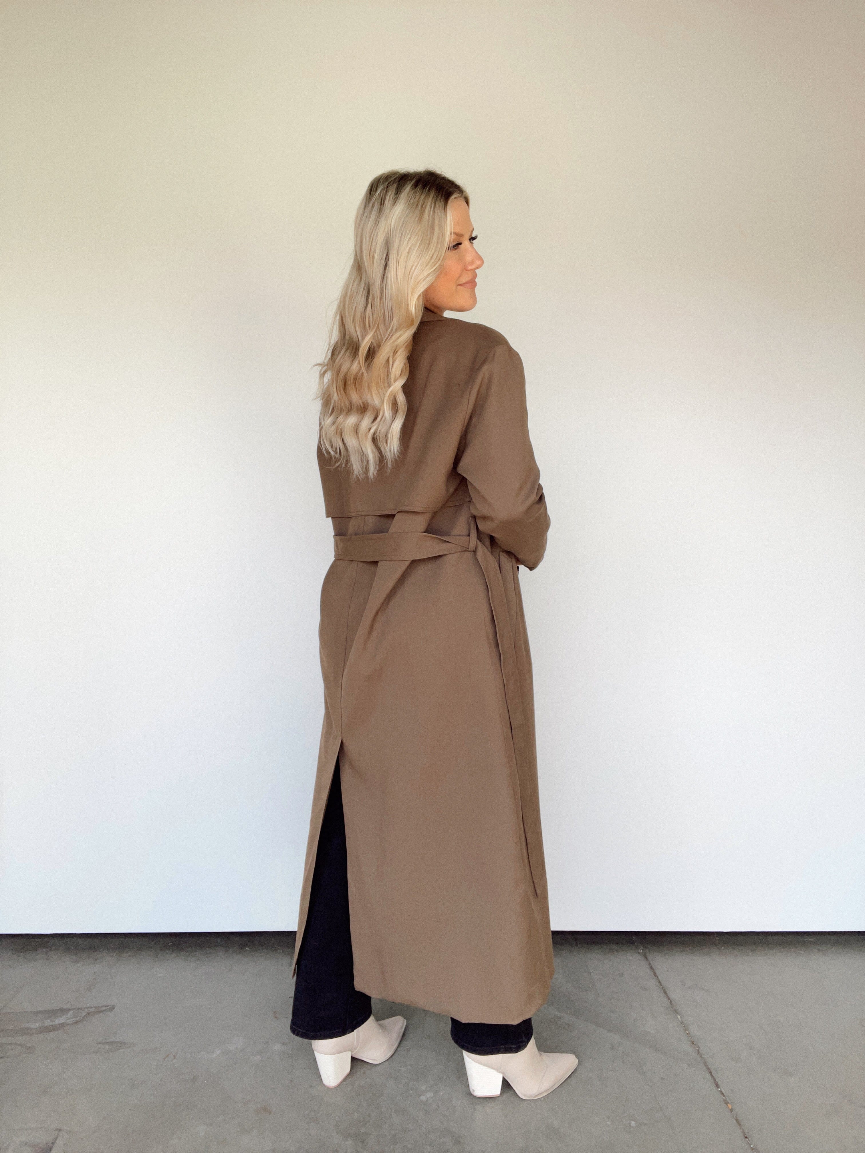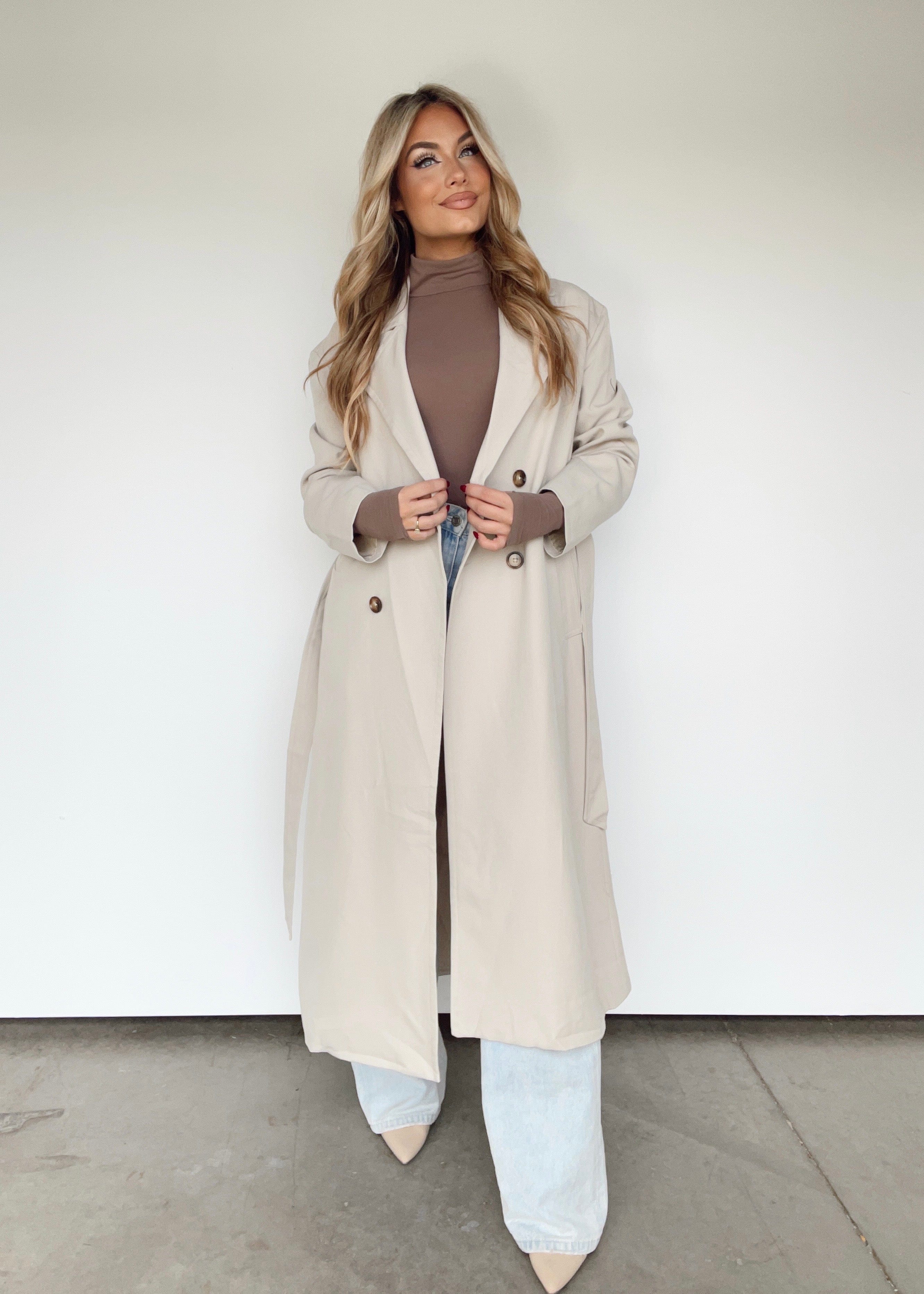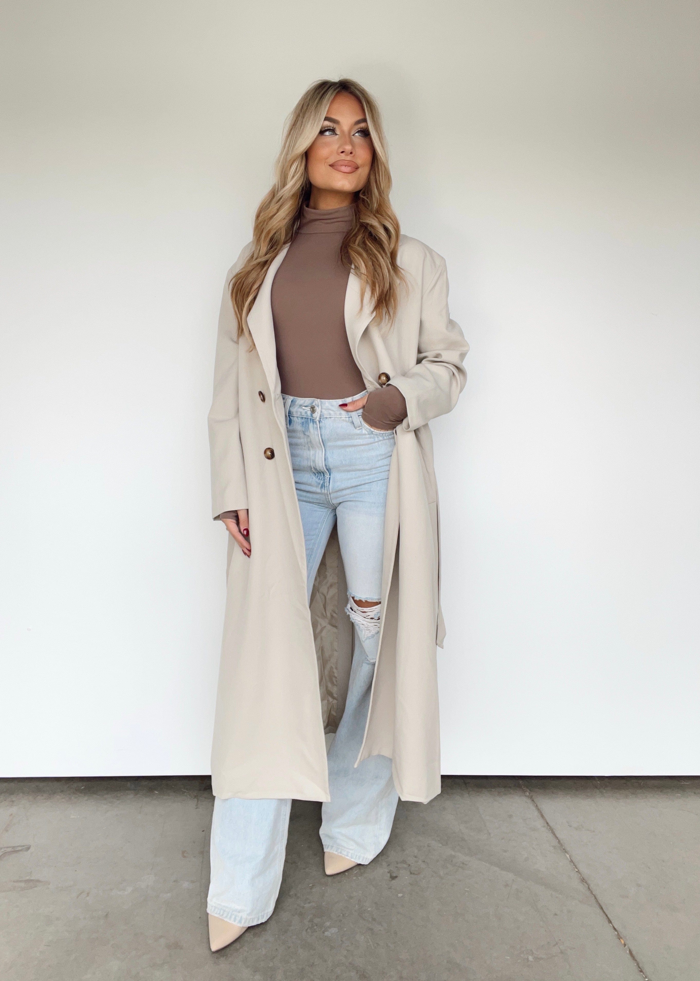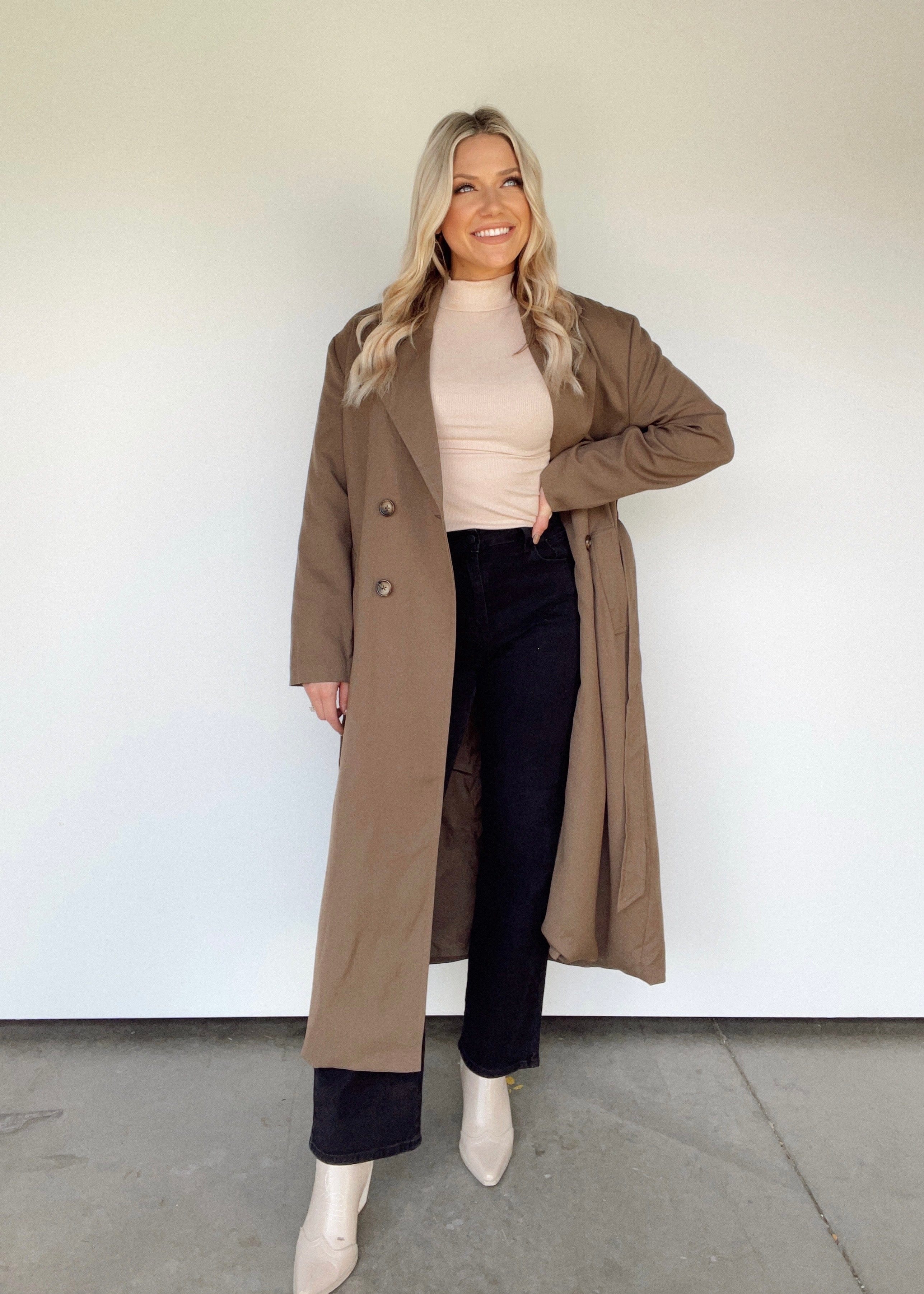This Twill Trench Coat is the perfect balance of comfort and style, with professional lapel details and button closures that make a statement. The neutral hue and elevated design make this piece trendy and perfect for layering during the Fall in New York. Featuring a long silhouette, cozy fabric, and waist tie detail, you'll be reaching for this coat all season.