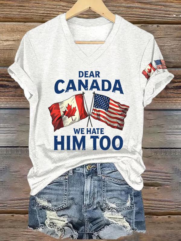 Women's V-Neck Retro Dear Canada We Hate Him Too Print T-Shirt