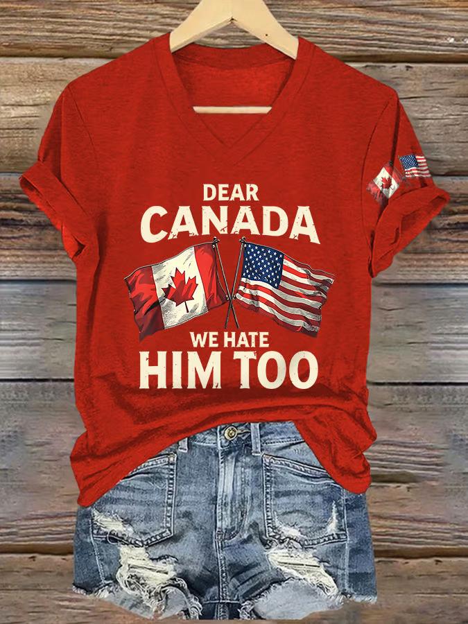 Women's V-Neck Retro Dear Canada We Hate Him Too Print T-Shirt 9549035