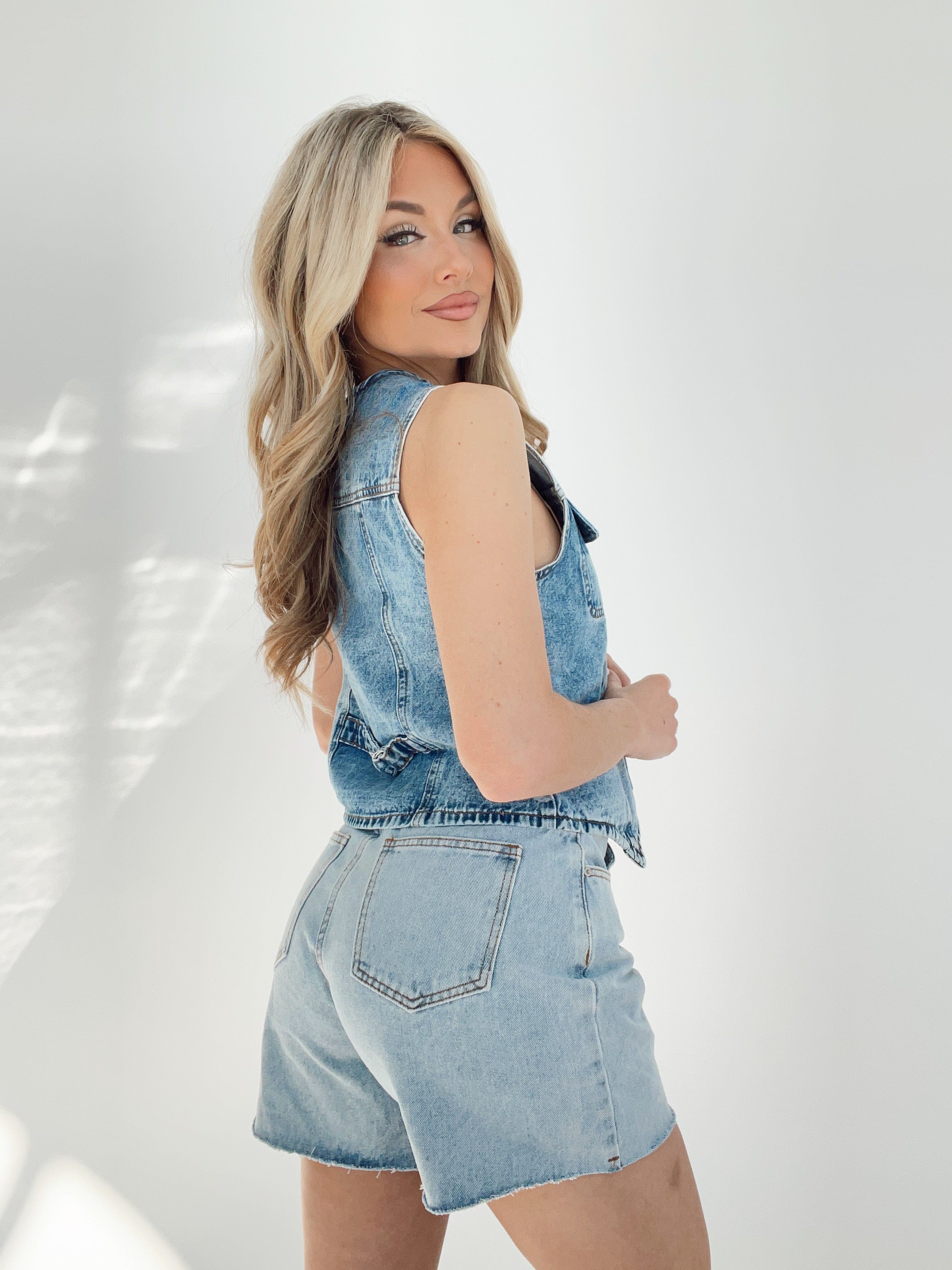 Add a touch of sophistication to your wardrobe with the Val Denim Vest. With its v neckline and button closures, this vest offers a trendy and elevated look that is perfect for any occasion. The pointed hem and cropped design add a versatile element, making it ideal for layering during the spring and summer months. Whether you're out shopping, attending a concert, or enjoying dinner and drinks, this medium wash denim vest is a must-have addition to your wardrobe.