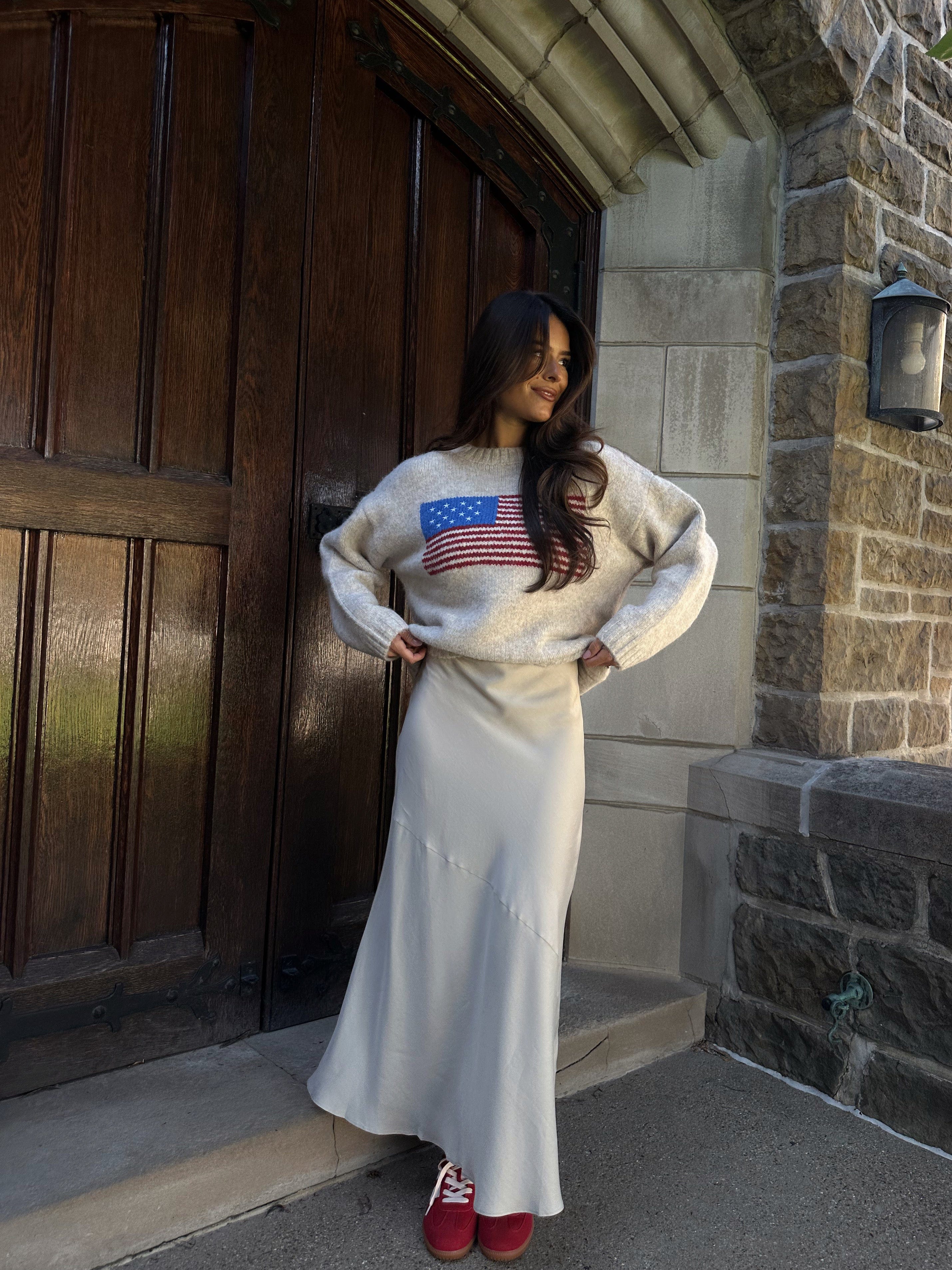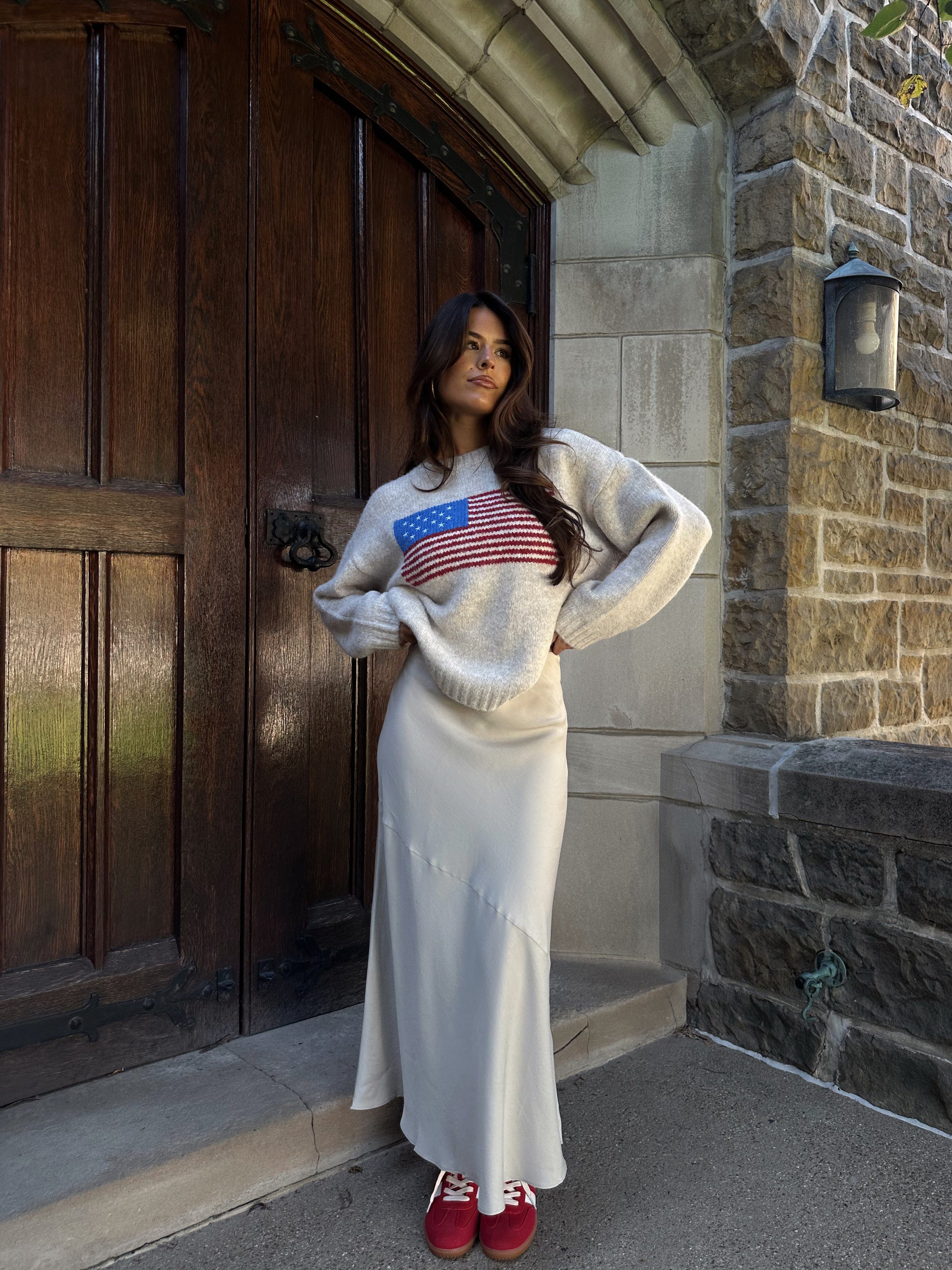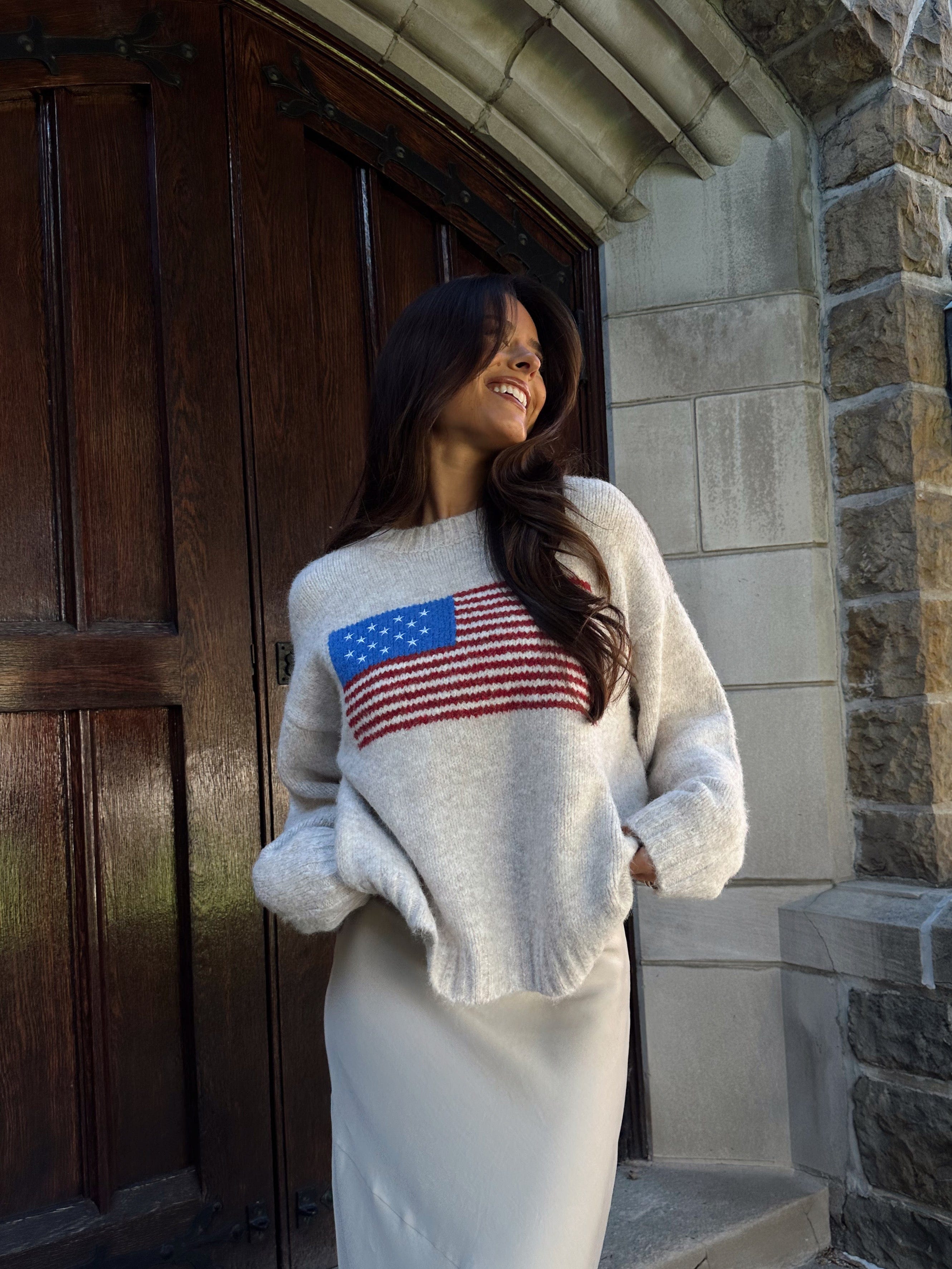 Represent your patriotism in style with our American Flag Pullover. This pullover sweater boasts an oversized, loose fit for comfort and a bold American flag design that is perfect for any occasion. Stay cozy and show your love for your country with this must-have piece.