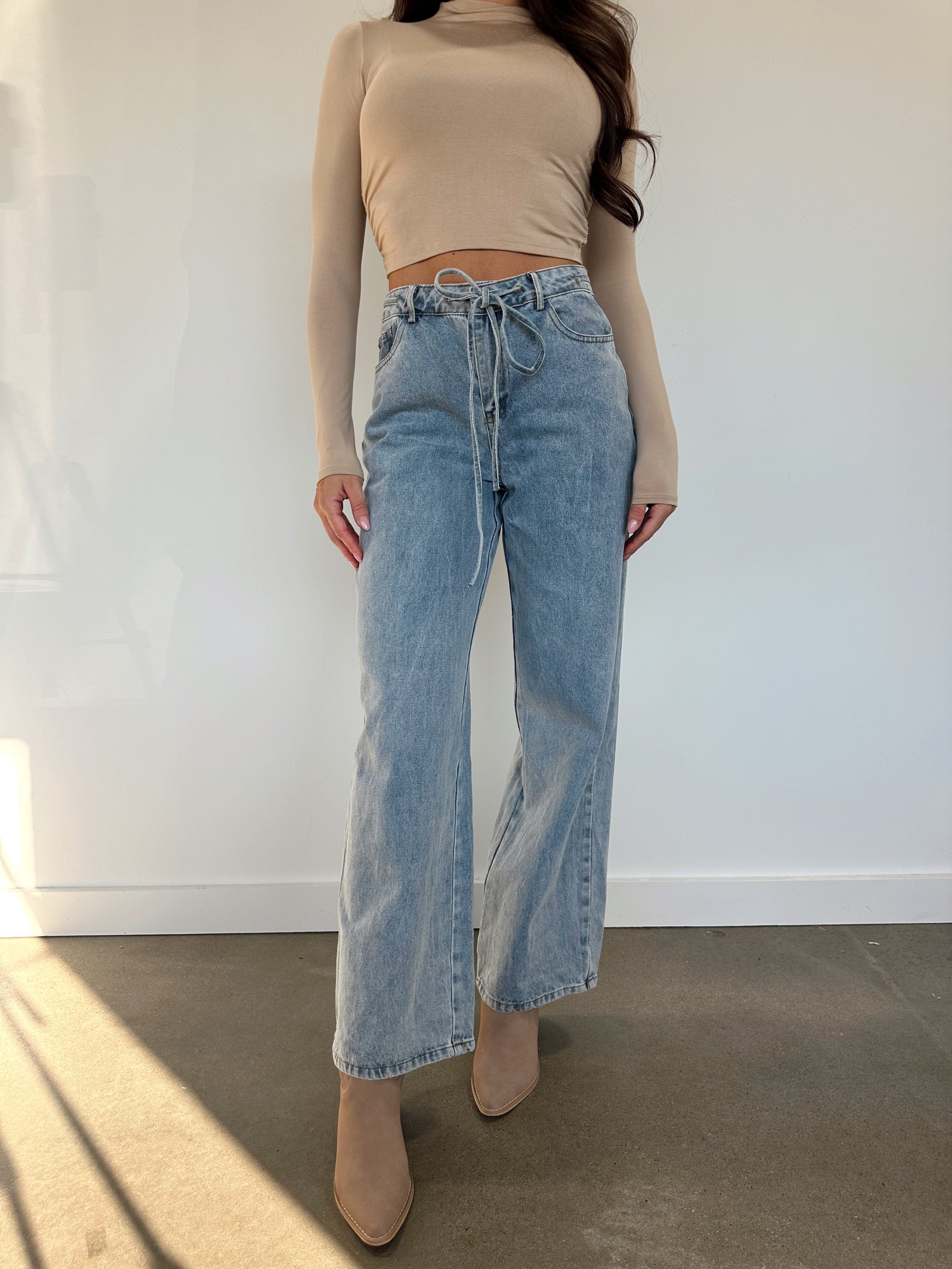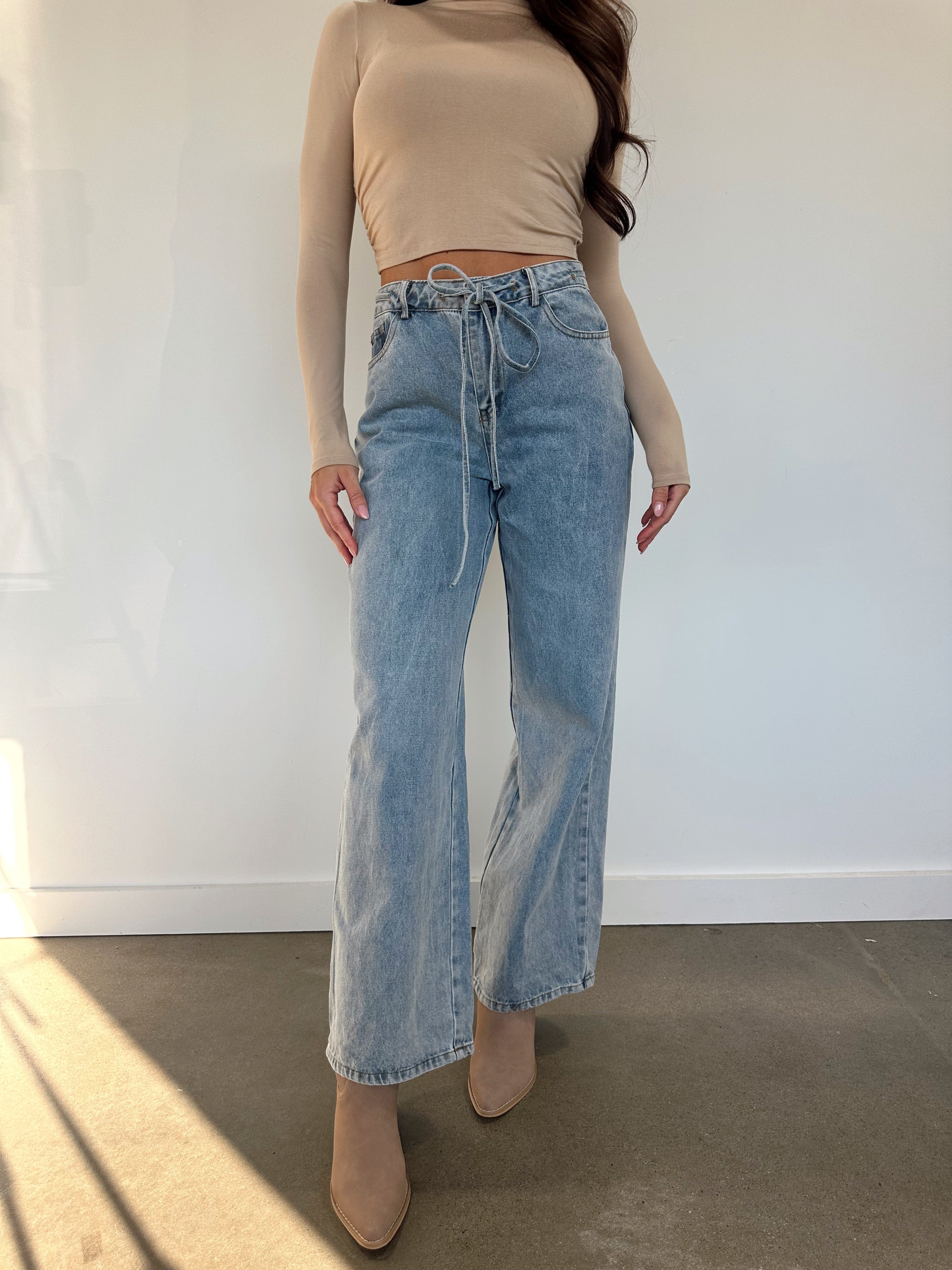 These denim pants feature a button and zipper closure, with both front and back pockets for convenience. The waist boasts a unique bow drawstring design and belt loops, while the wide leg provides a comfortable and stylish fit. Expertly crafted with both fashion and function in mind.