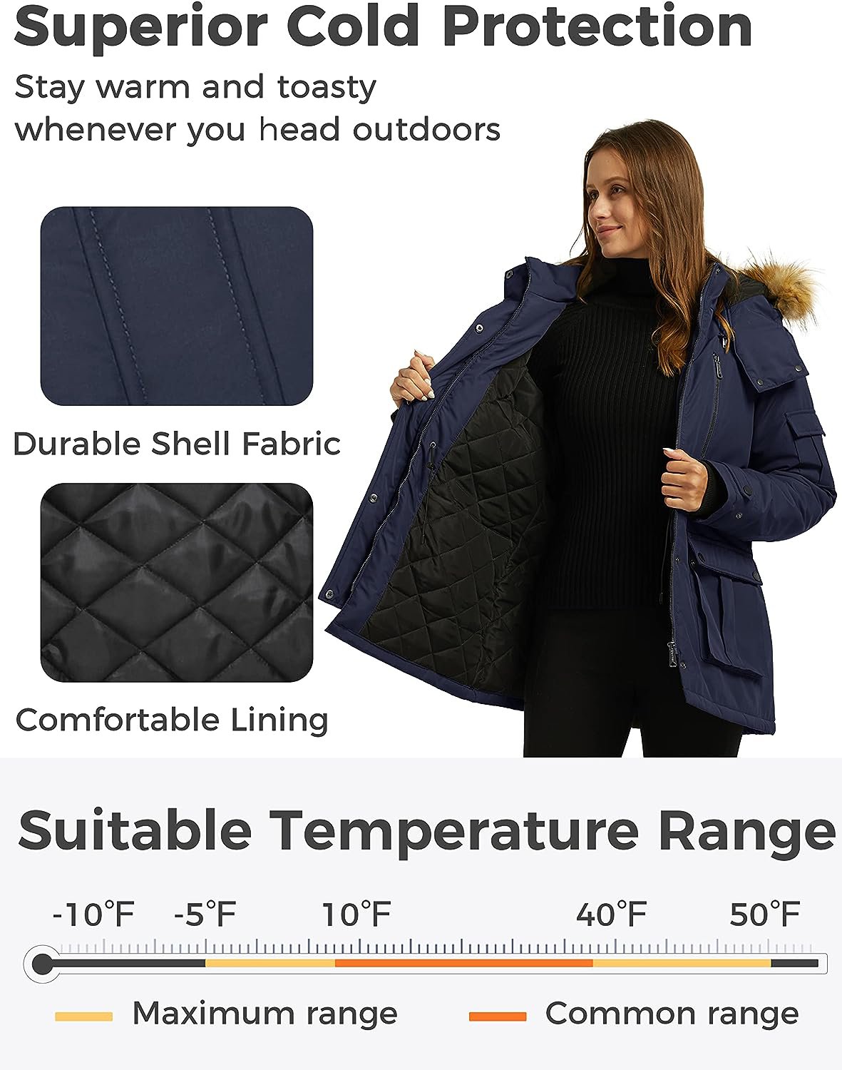 - A Warm Embrace - The winter jacket for women seals body warmth in and keep cozy on chilly days. This thicken puffer coat is made with soft and light filling, a diamond pongee lining, and an adjustable fur-lined hood.
