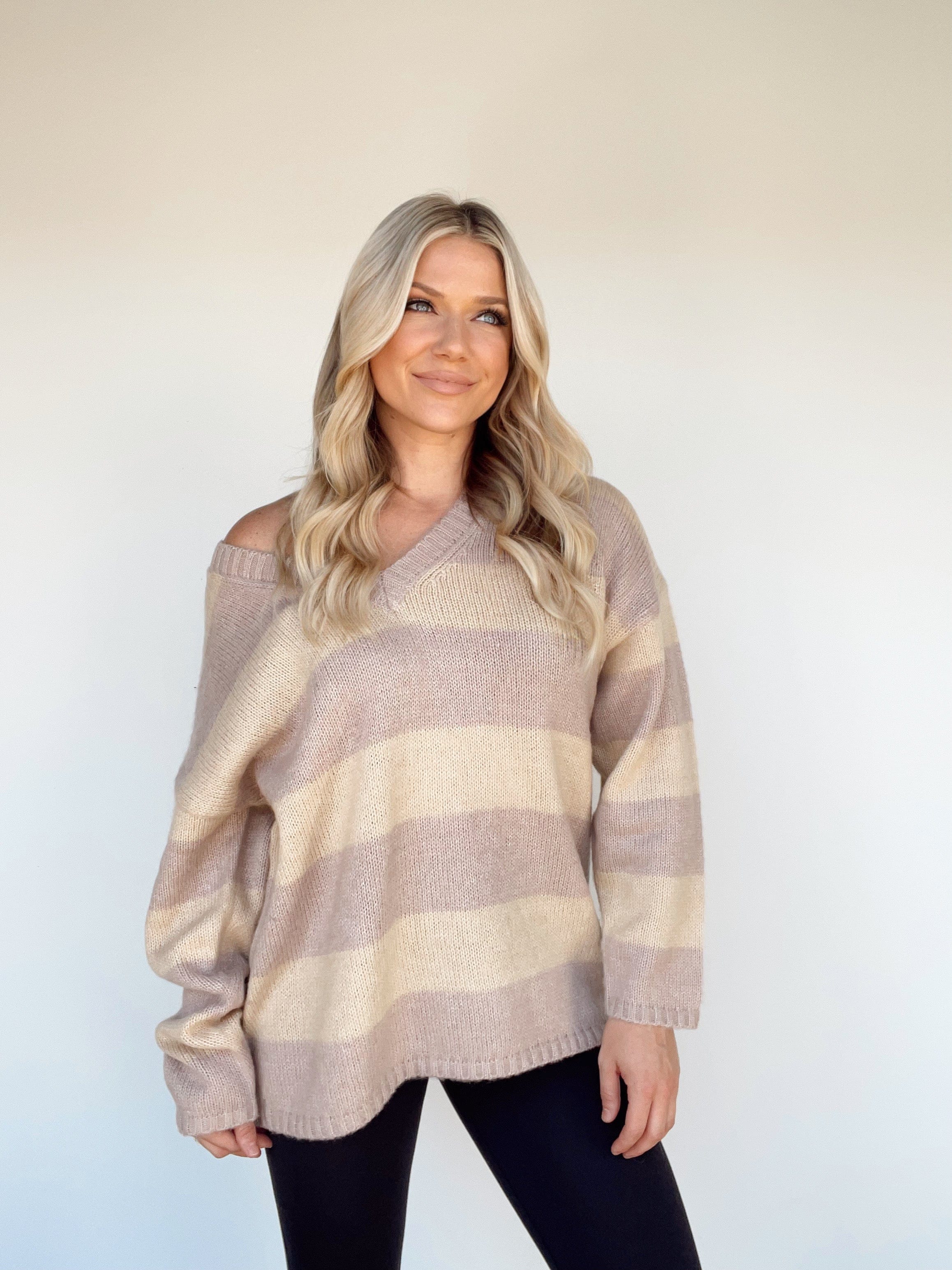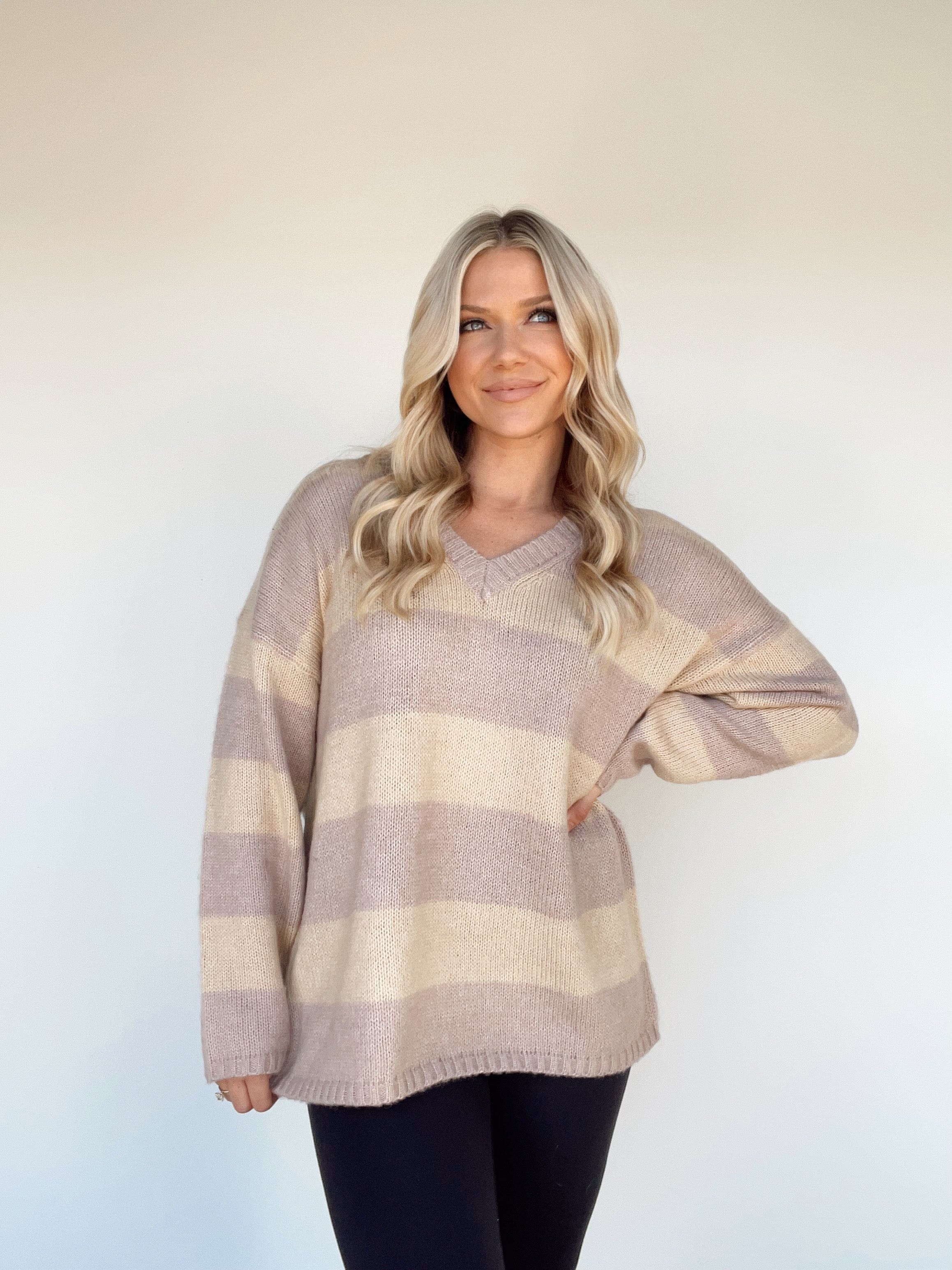 This cozy Warm Hearts Sweater offers a timeless silhouette with a modern twist. Soft, stretchy knit in classic stripes is balanced with a feminine v neckline, while an elevated pastel color palette brings a sweet, casual feel to your fall wardrobe. Perfect for lounging, brunch, or as a transition piece.