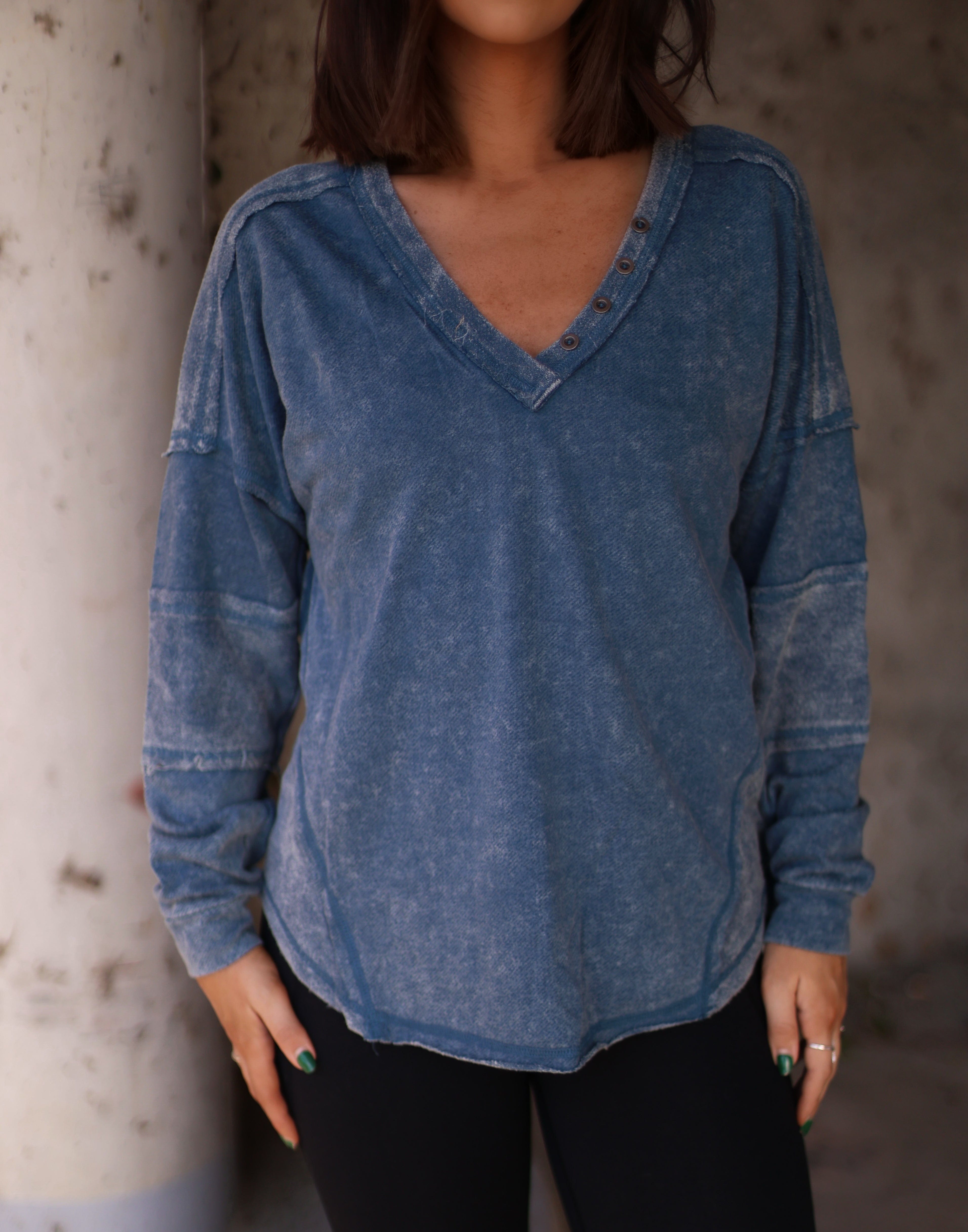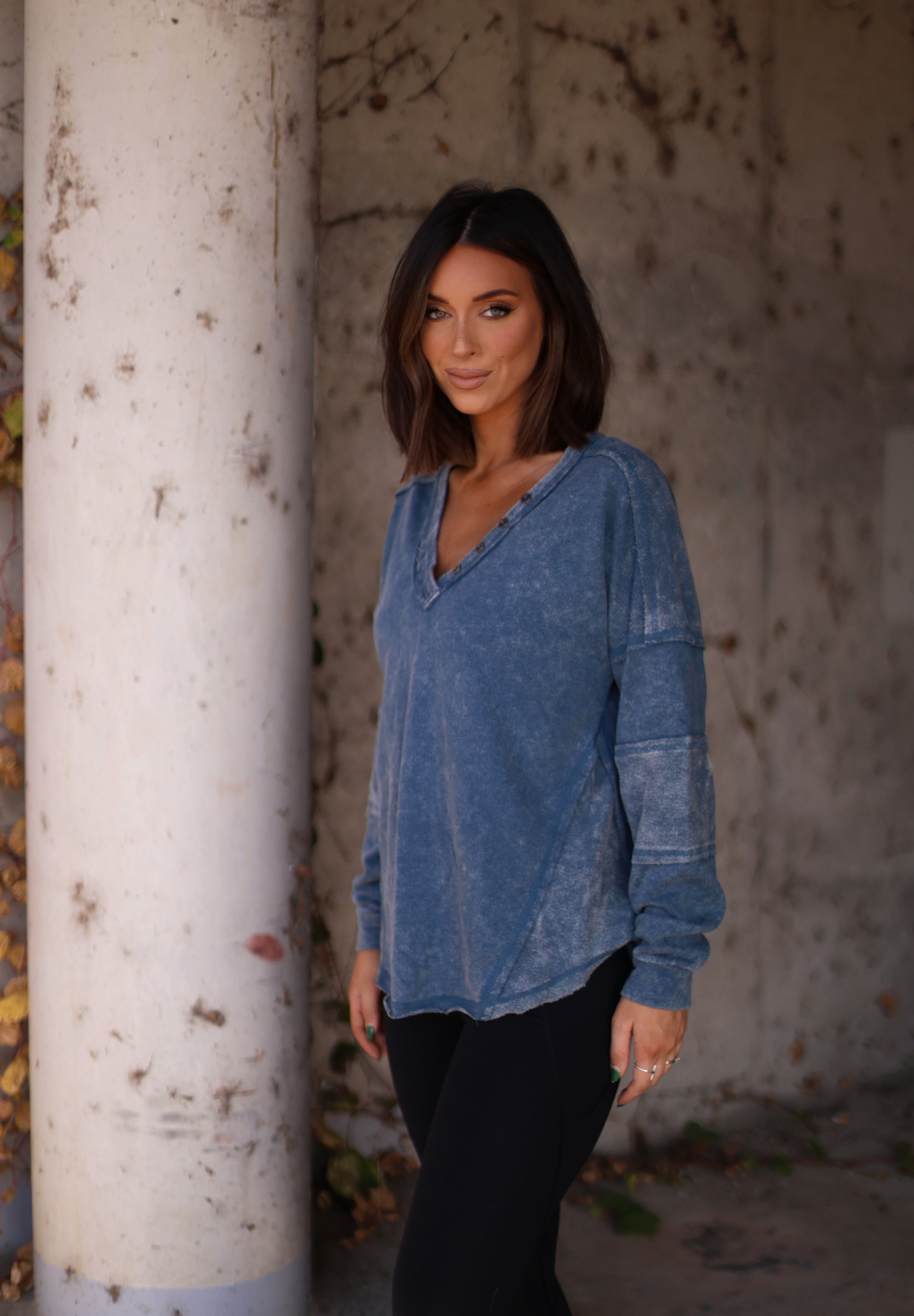 Expertly crafted with stretchy material, this Washed Up Top features a flattering v neckline and comfortable long sleeves. Perfect for any occasion, this versatile top offers both style and functionality. Take your wardrobe to the next level with this must-have piece.