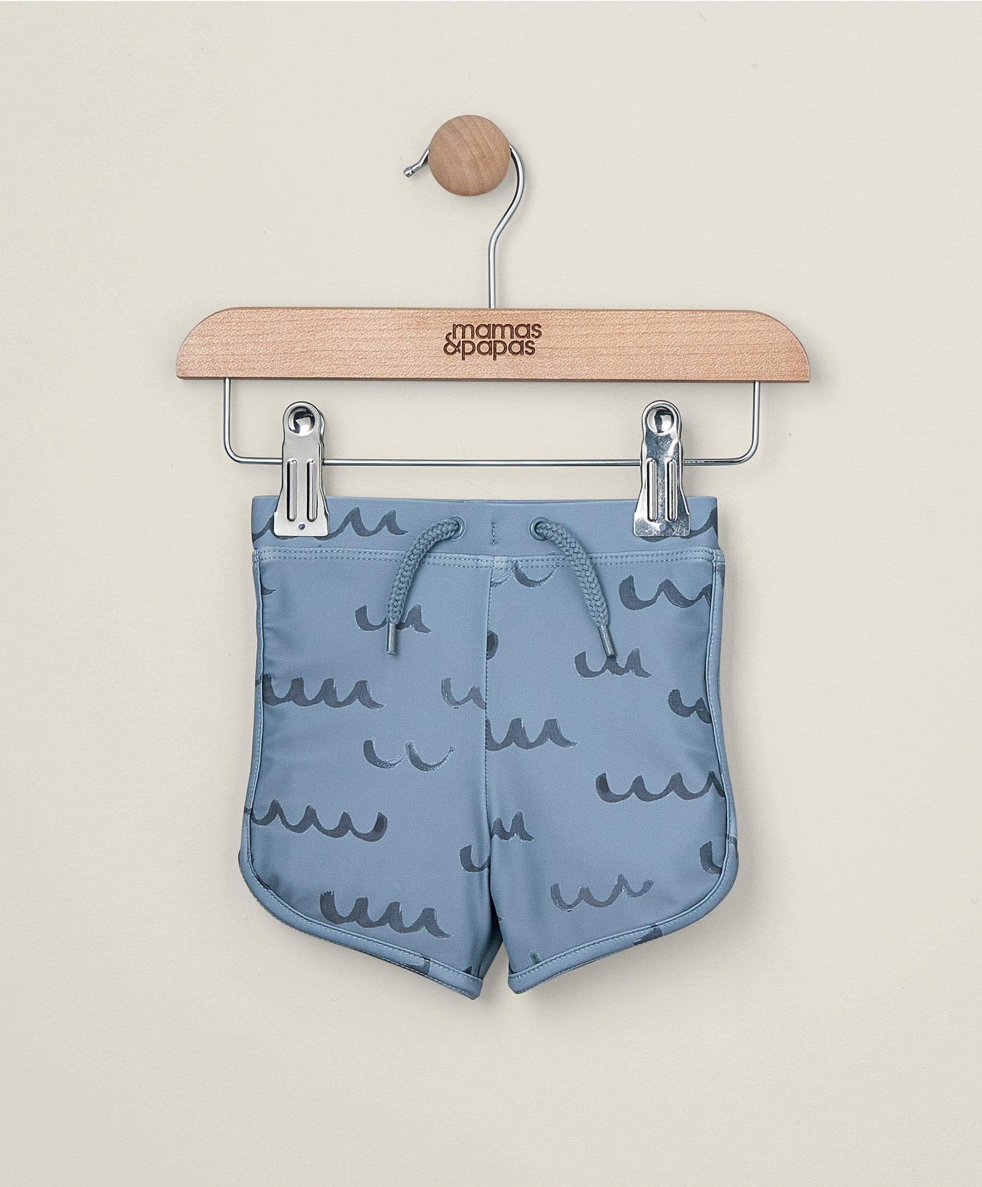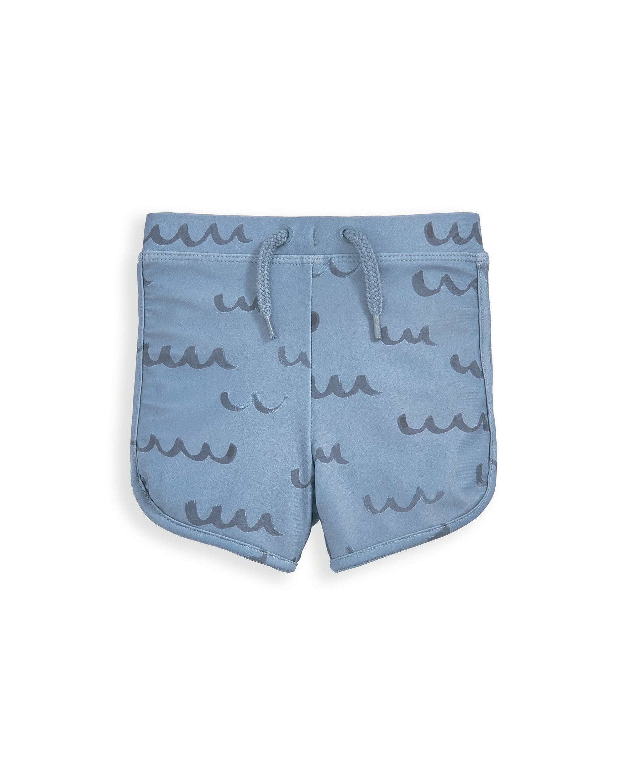 Wave print swim trunks. Elasticated waistband and non functional drawcord.