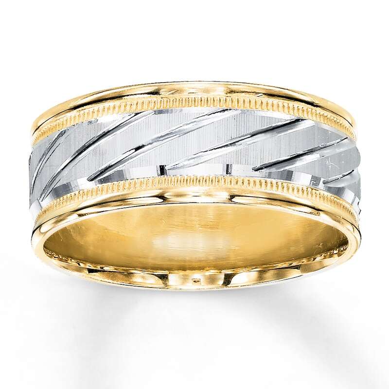 The center of this appealing 8mm wedding band showcases etched diagonal lines in 10K white gold. The edges feature a milgrain finish and are crafted in high-polish 10K yellow gold. This wedding band is available in sizes for men or women.