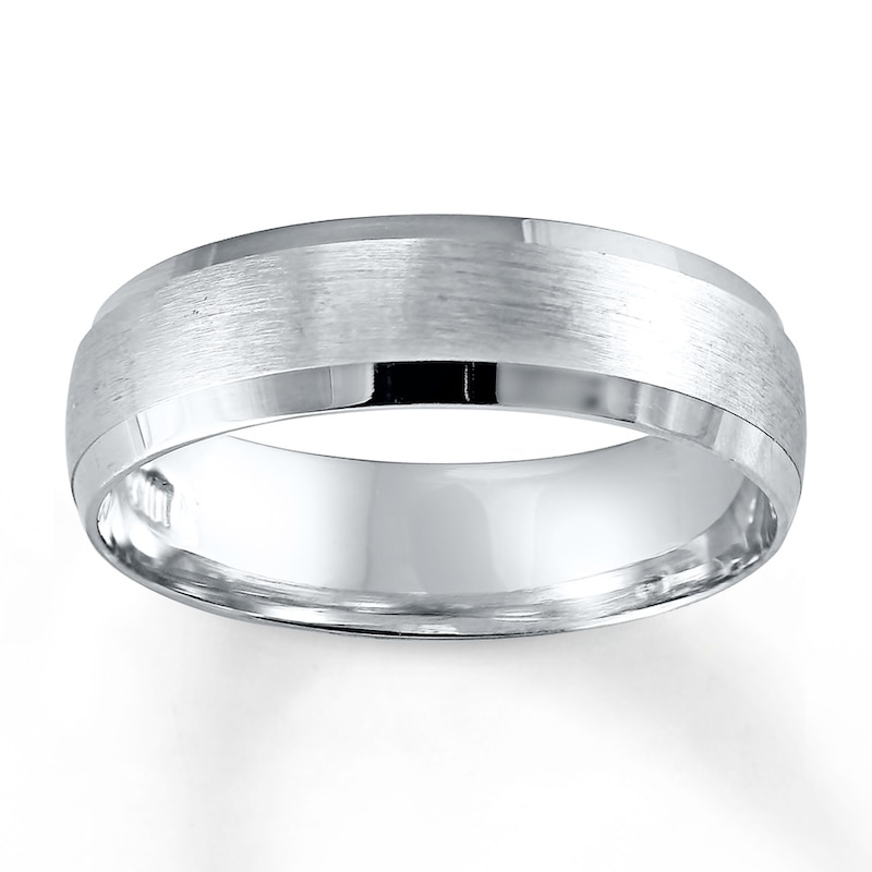 This modern wedding band features a brushed center lined with polished edges to give it a sleek look. The 6mm ring is crafted of 10K white gold.