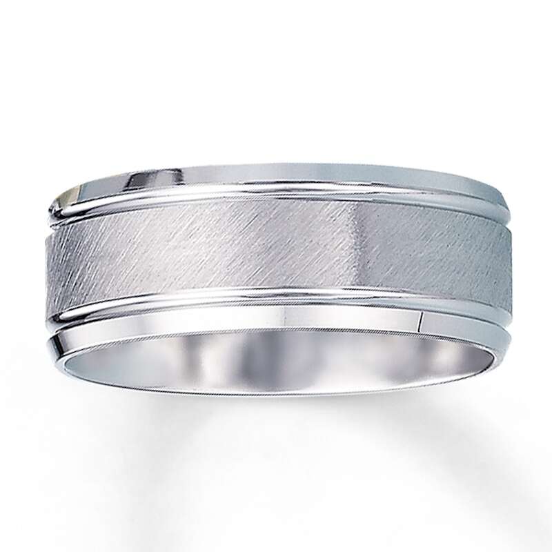 This elegant 8mm wedding band features a brushed finish center and crisp engraved edges for a contemporary look. The ring is crafted in 10K white gold. This wedding band is available in sizes for men or women.