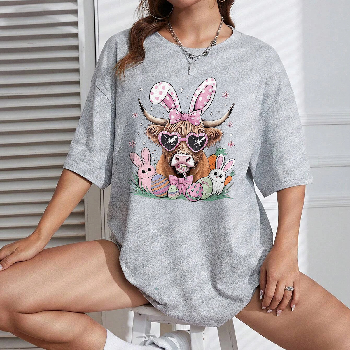 West Highland Cattle Easter Bunny Easter Eggs Printed Round Neck Short Sleeve T-Shirt
