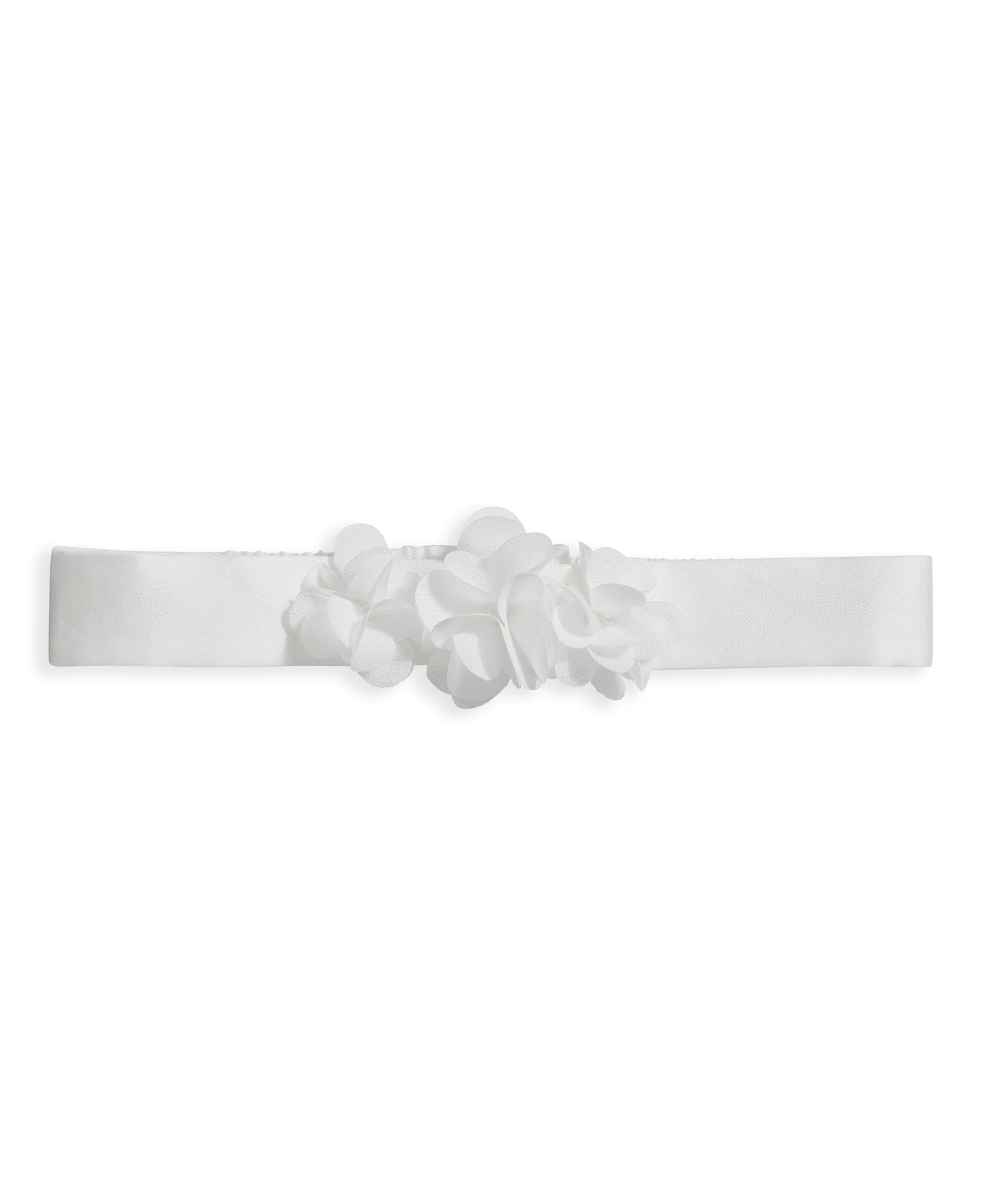 White woven headand with 3D corsage flower detail. Elasticated for a comfy fit. Velcro fastening for easy adjusting.