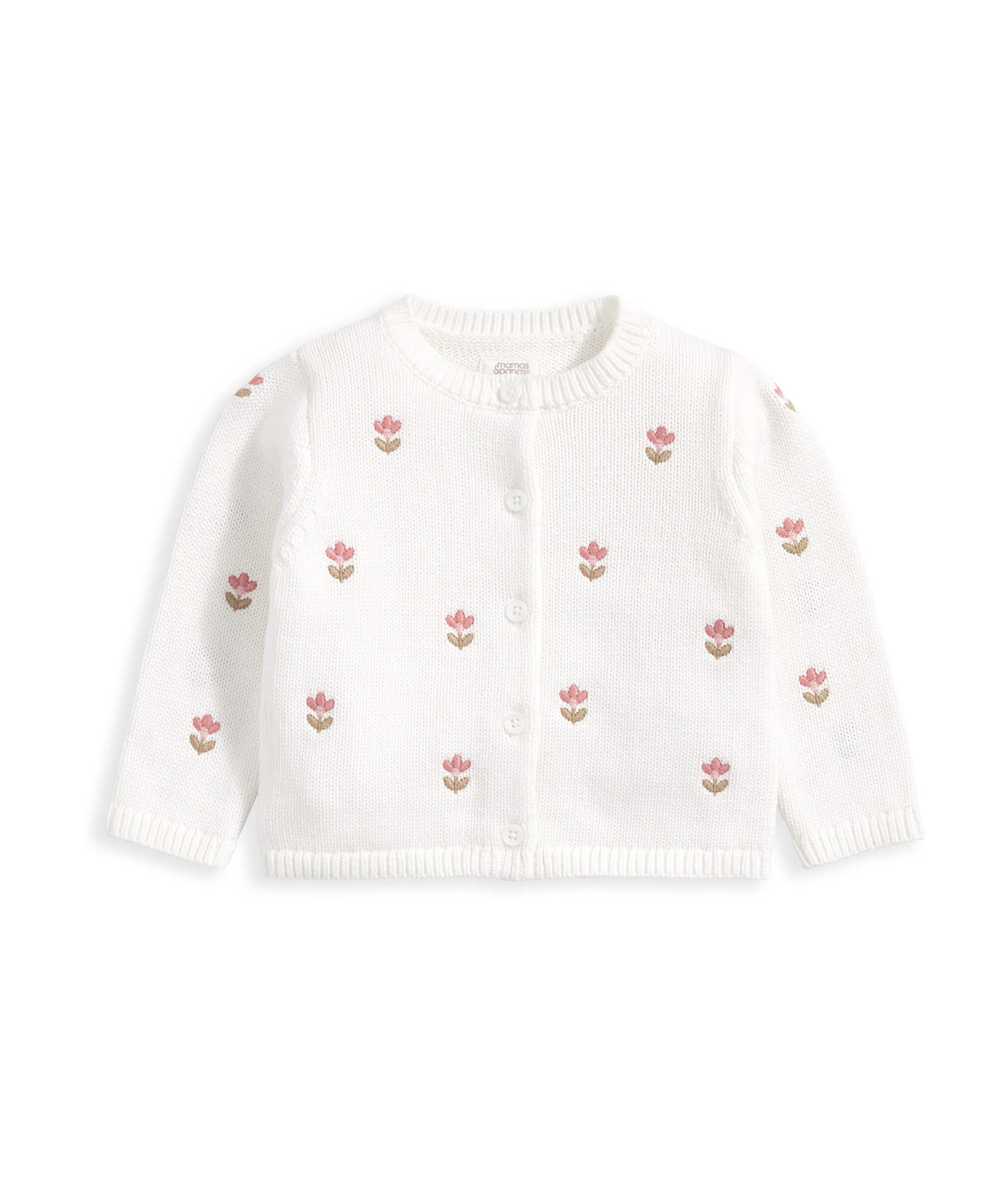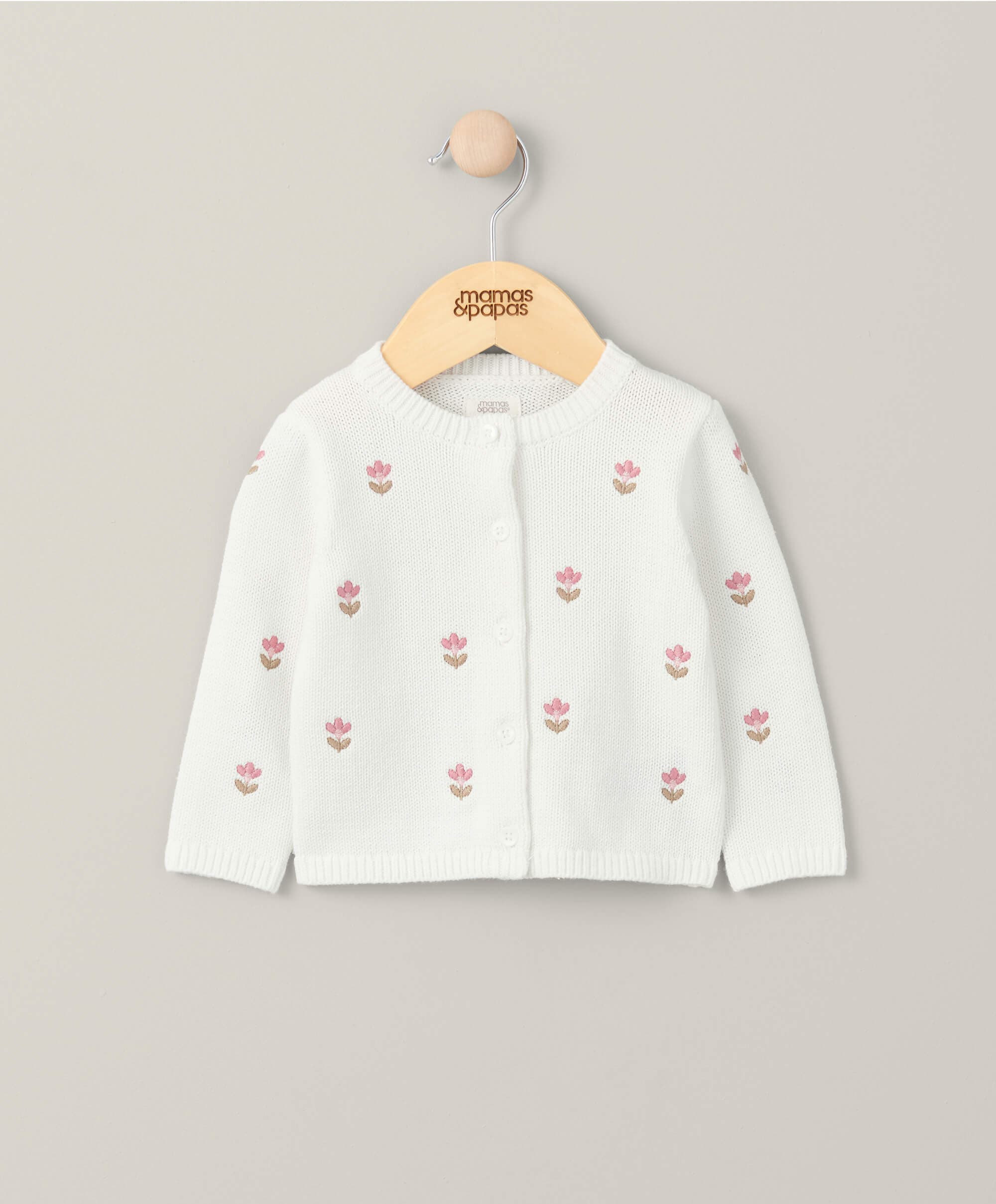 Knitted long-sleeved girls' cardigan. In a beautiful soft knit fabric and featuring a stunning scattered floral embroidered detail. With button fastening, for easy layering with other pieces.