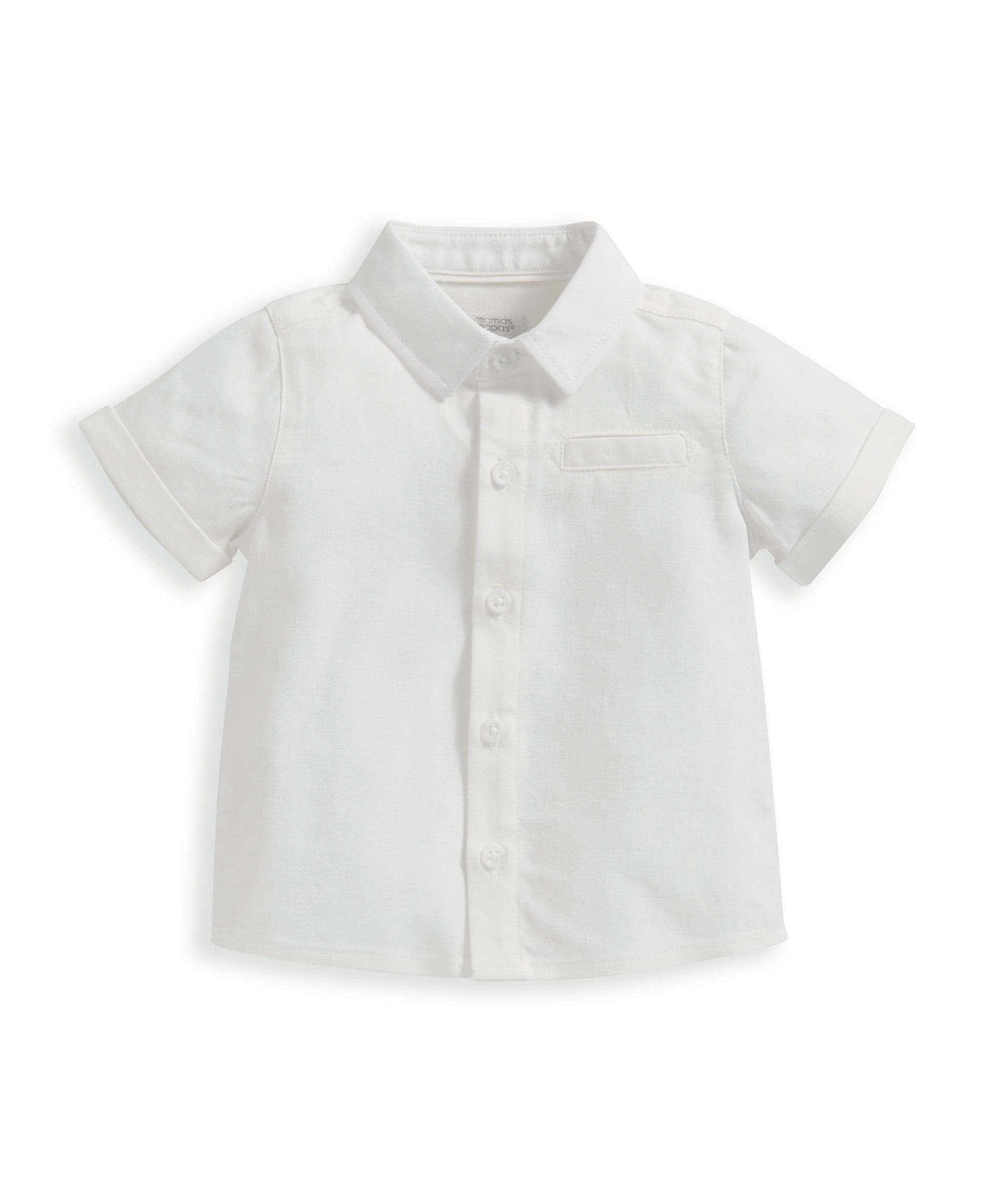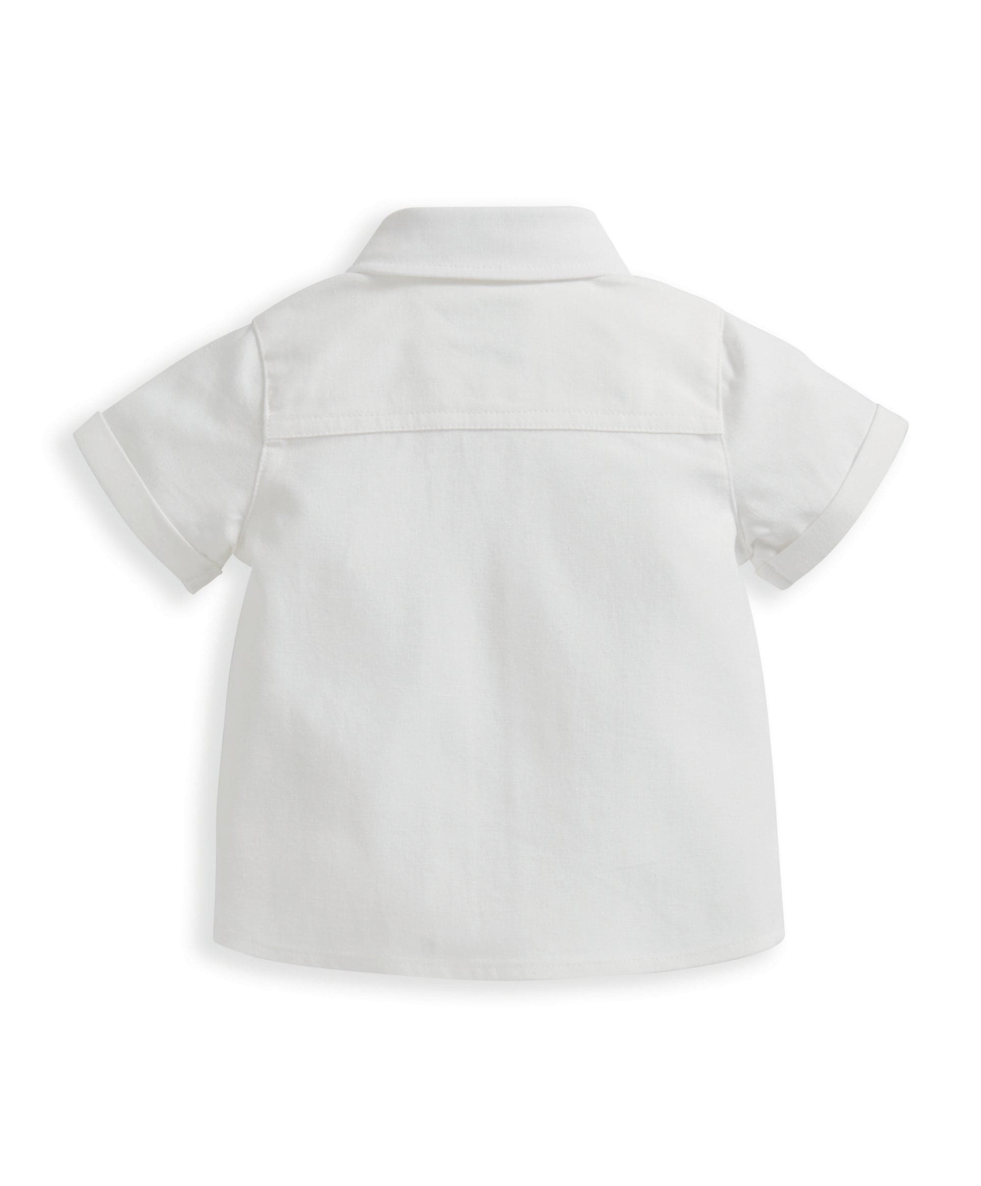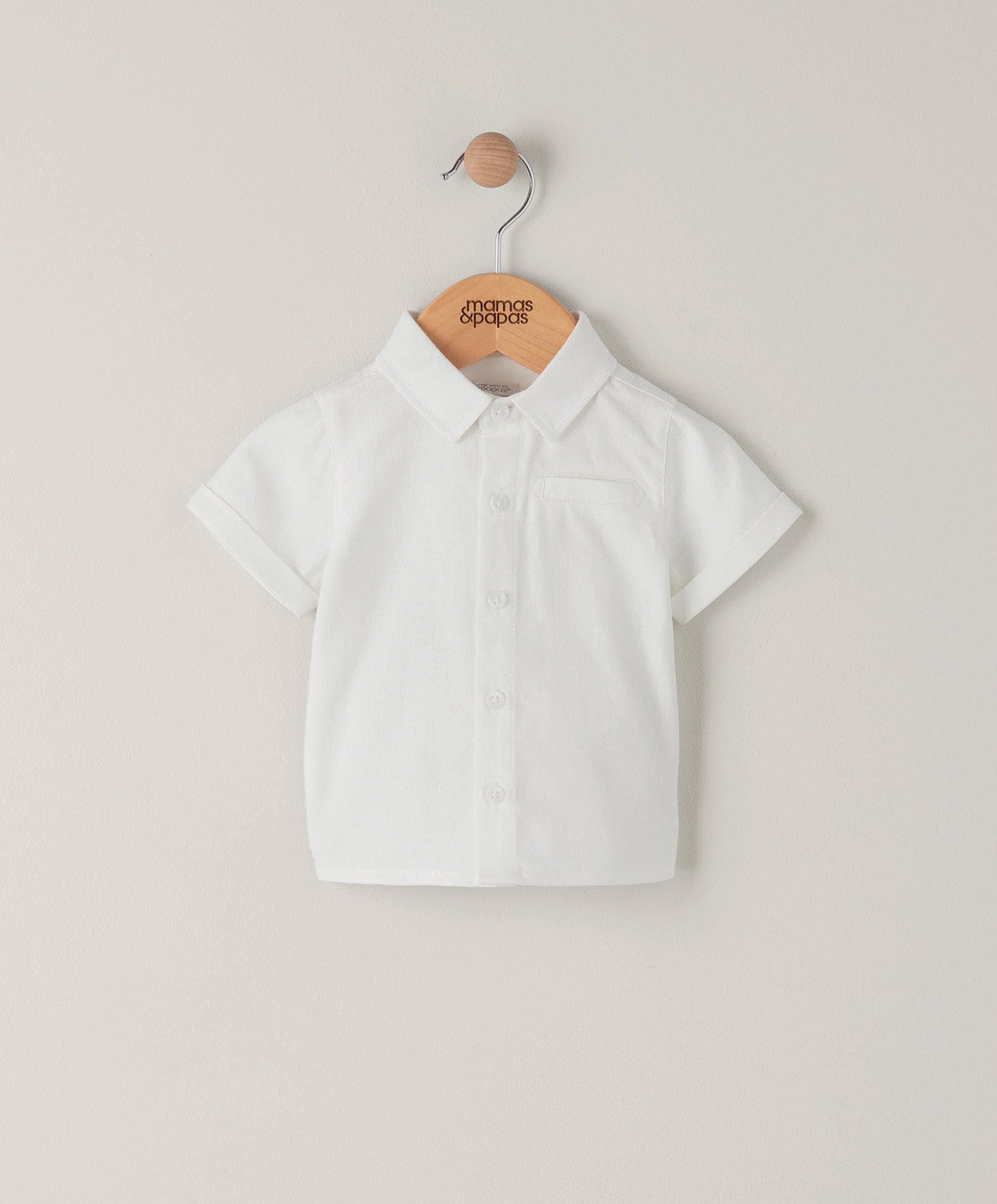 Short sleeved boys' shirt elevated by herringbone texture and collar, for a super-smart finish that lends itself to special occasion dressing. Turn back cuffs with herringbone tape tab and button detail adds to the tailored appearance, as does side seam tabs on hem and front placket with button detail. A really smart item that pairs well with shorts, trousers or even dungarees for a special occasion.