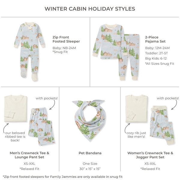 Our "Winter Cabin" family pajamas celebrate the warmth of cozying up indoors with loved ones. These snuggly jammies feature a charming print of hand-painted cabins nestled in snow, reindeers gracefully soaring through the night sky, and playful polar bears.